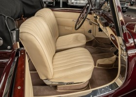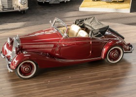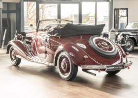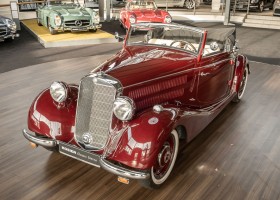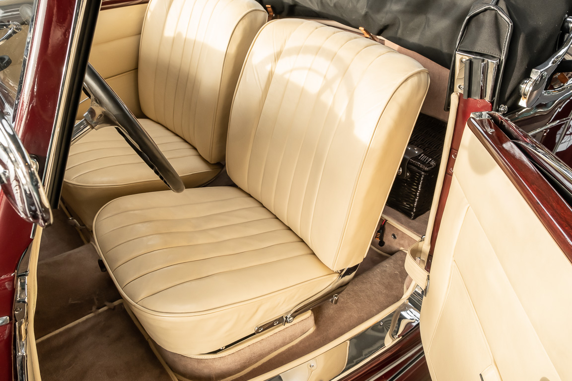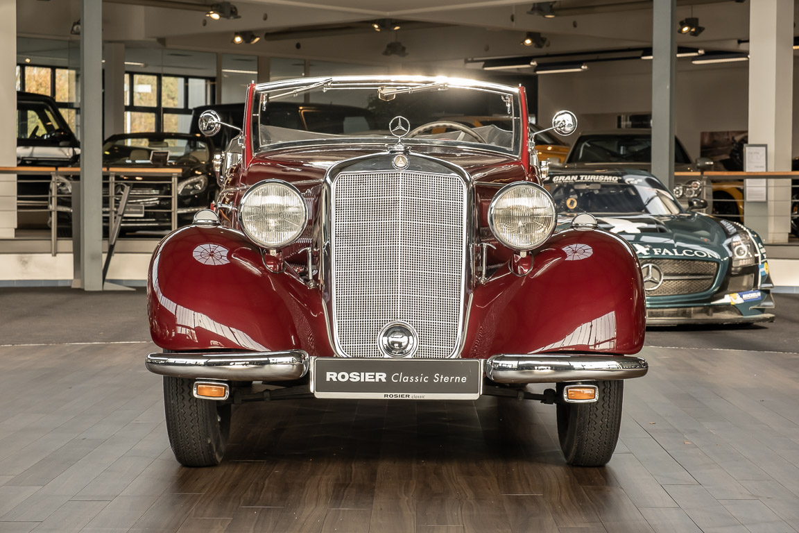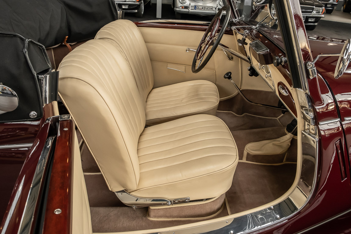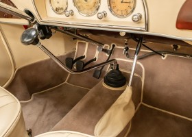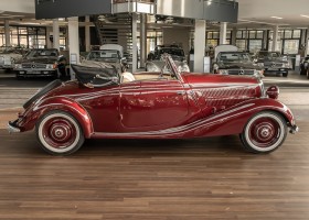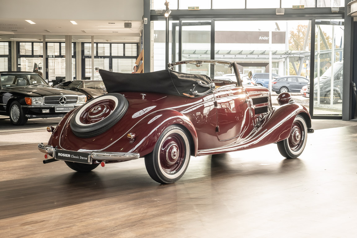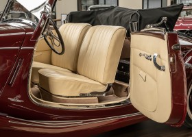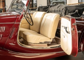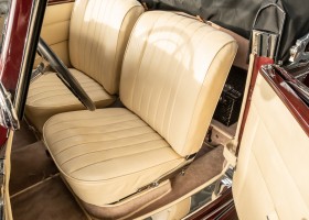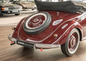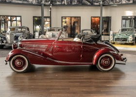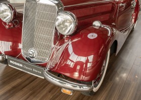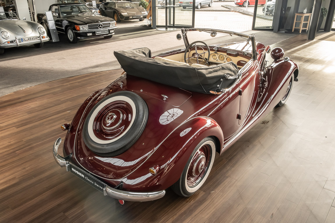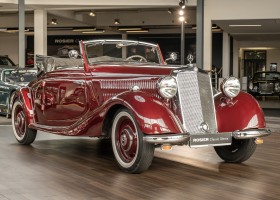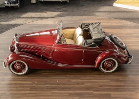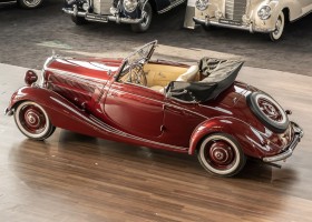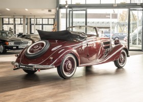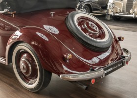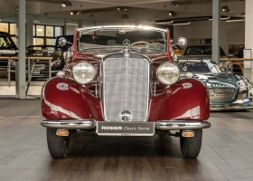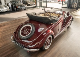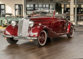 Ein Cabrio Traum mit super Historie ist dieses Mercedes-Benz 170V Cabriolet A aus dem Jahre 1938. Der Wagen wurde im Oktober 1938 über das bis heute bestehende Autohaus Metje + Ziegler in Windhoek, Namibia, an Jürgen Voigts in Voigtsgrund im Bezirk Gibeon, ausgeliefert. Die Farm der angesehenen, deutschstämmigen Familie Voigts, umfasste zu dieser Zeit bereits 160.000 Hektar meist Eigenland und war bekannt für seine etwa 17.000 Tiere umfassenden Karakulschaf-Herden. Die Kriegsjahre verblieb der Wagen in Namibia und kam erst nach dem Krieg zurück nach Deutschland. Er fand seine Heimat im Raum München und gehörte Mitte der 1960er Jahre unter anderem dem Schauspieler Danilo Zschauer aus München, wie man dem noch original vorhandenen Pappbrief entnehmen kann. Am 25.08.1978 kam das Cabrio gemäß dem uns vorliegenden originalen Kaufvertrag in den Besitz eines höchst erfolgreichen Unternehmers im Märkischen Kreis, in Nordrhein-Westfalen. Er pflegte und erhielt den Wagen bestens, entschied sich aber einer Mitte der 1980er Jahre zu einer Totalrestaurierung. Die Restaurierung war von solcher Güte, dass sich der Wagen auch heute, viele Jahre später, in nahezu makellosem Zustand präsentiert. Er lädt ein zu stilvollen Ausfahrten mit unendlich schönem Cabrio-Vergnügen durch malerische Landschaften.