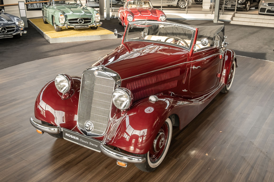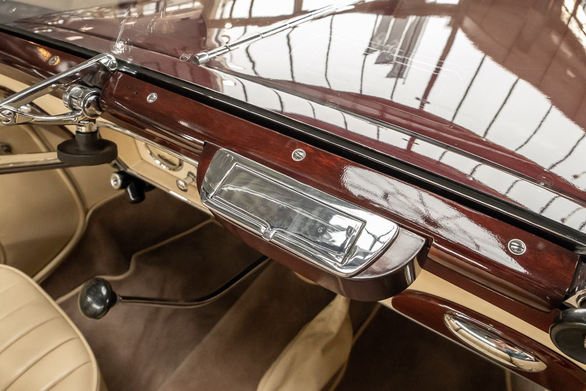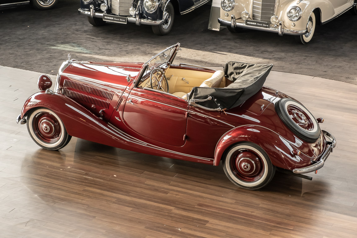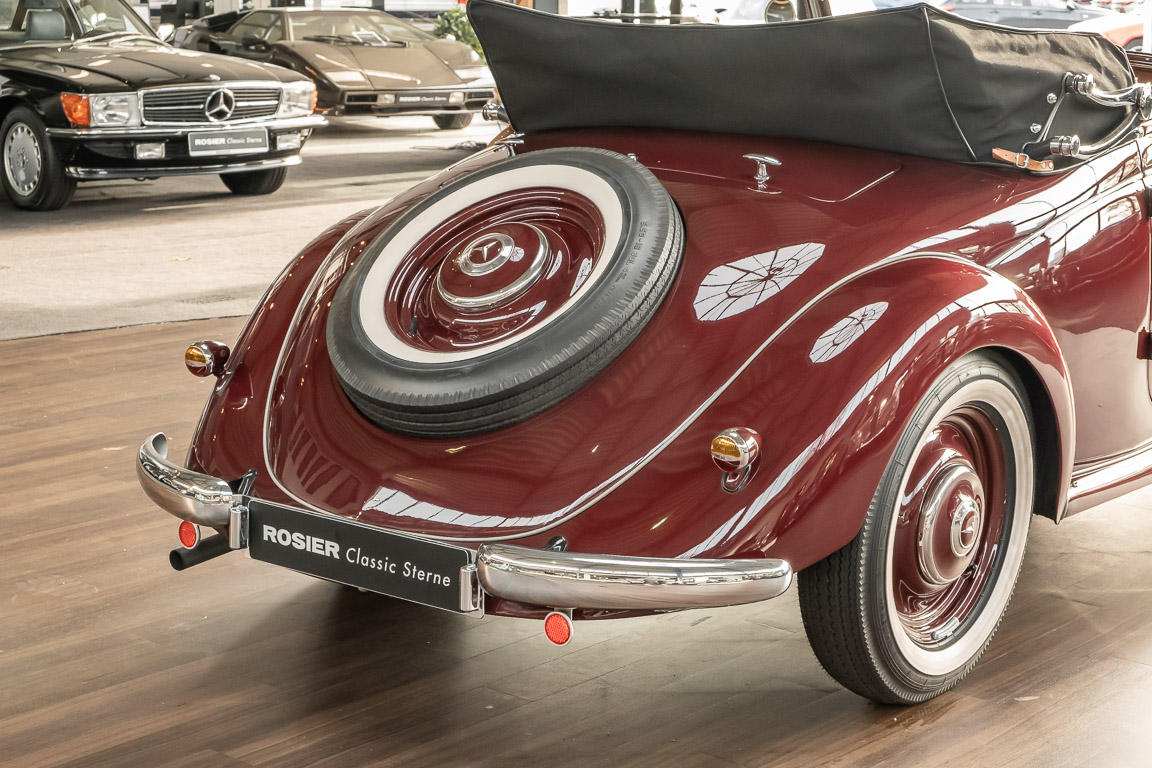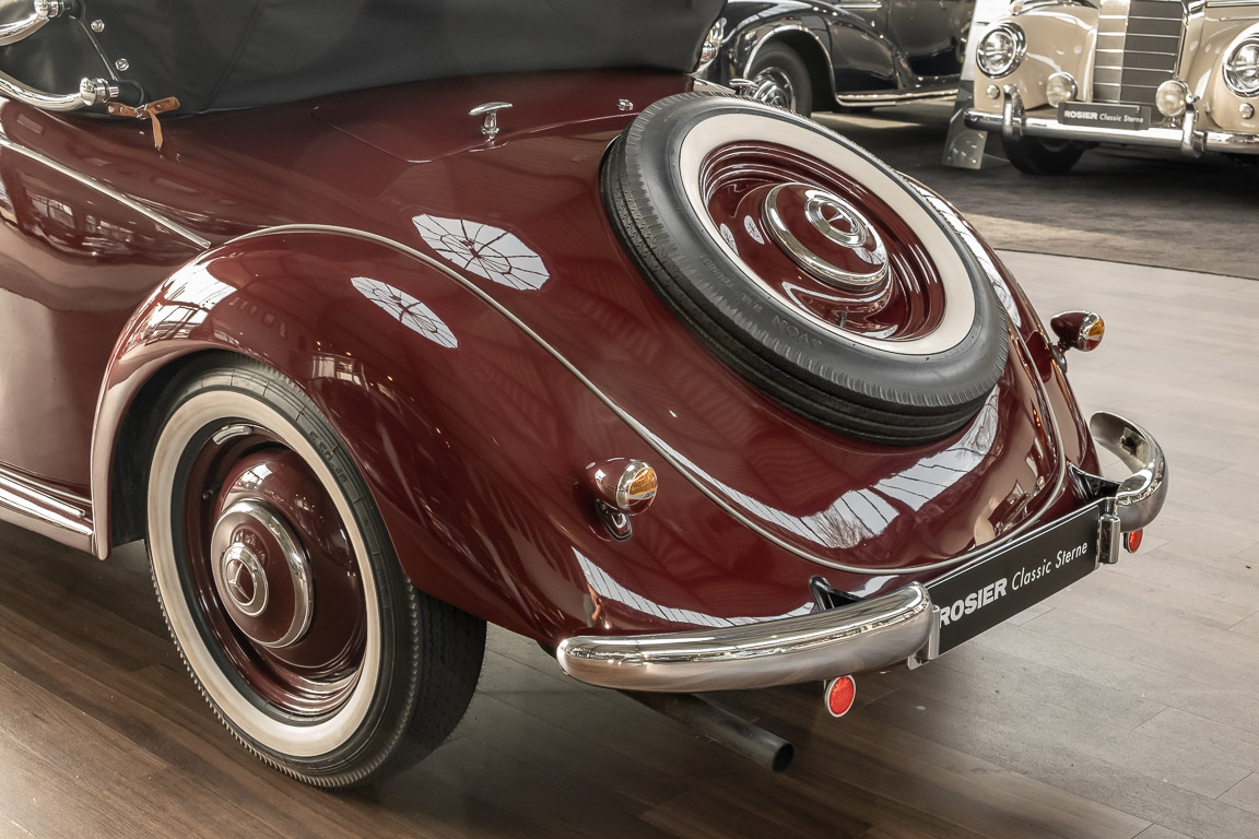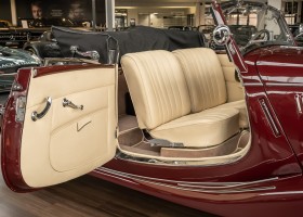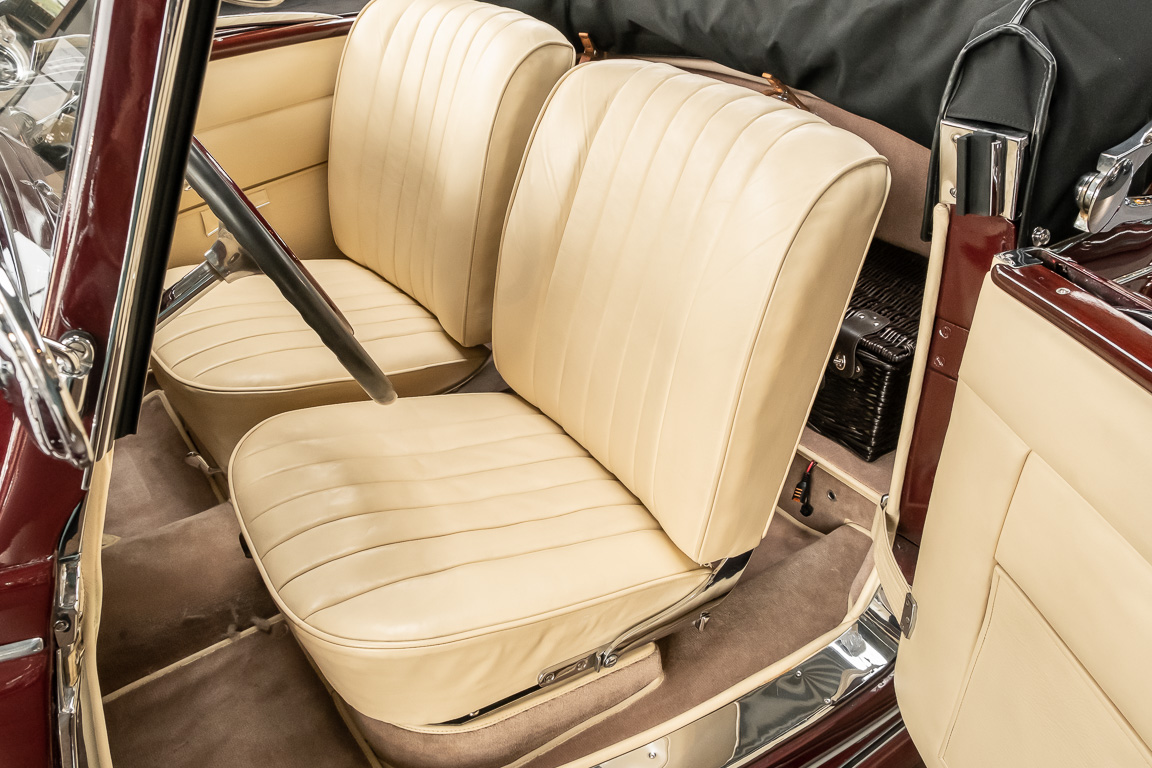 Ein Cabrio Traum mit super Historie ist dieses Mercedes-Benz 170V Cabriolet A aus dem Jahre 1938. Der Wagen wurde im Oktober 1938 über das bis heute bestehende Autohaus Metje + Ziegler in Windhoek, Namibia, an Jürgen Voigts in Voigtsgrund im Bezirk Gibeon, ausgeliefert. Die Farm der angesehenen, deutschstämmigen Familie Voigts, umfasste zu dieser Zeit bereits 160.000 Hektar meist Eigenland und war bekannt für seine etwa 17.000 Tiere umfassenden Karakulschaf-Herden. Die Kriegsjahre verblieb der Wagen in Namibia und kam erst nach dem Krieg zurück nach Deutschland. Er fand seine Heimat im Raum München und gehörte Mitte der 1960er Jahre unter anderem dem Schauspieler Danilo Zschauer aus München, wie man dem noch original vorhandenen Pappbrief entnehmen kann. Am 25.08.1978 kam das Cabrio gemäß dem uns vorliegenden originalen Kaufvertrag in den Besitz eines höchst erfolgreichen Unternehmers im Märkischen Kreis, in Nordrhein-Westfalen. Er pflegte und erhielt den Wagen bestens, entschied sich aber einer Mitte der 1980er Jahre zu einer Totalrestaurierung. Die Restaurierung war von solcher Güte, dass sich der Wagen auch heute, viele Jahre später, in nahezu makellosem Zustand präsentiert. Er lädt ein zu stilvollen Ausfahrten mit unendlich schönem Cabrio-Vergnügen durch malerische Landschaften.