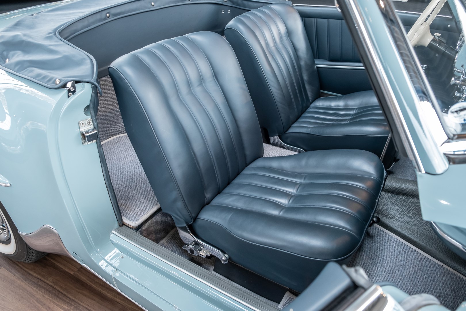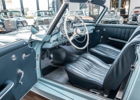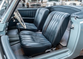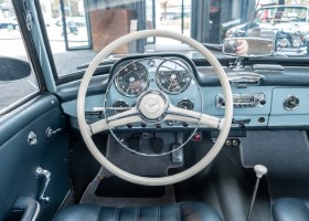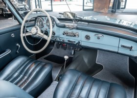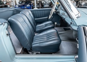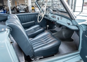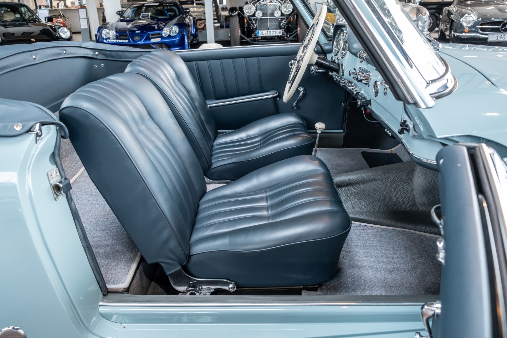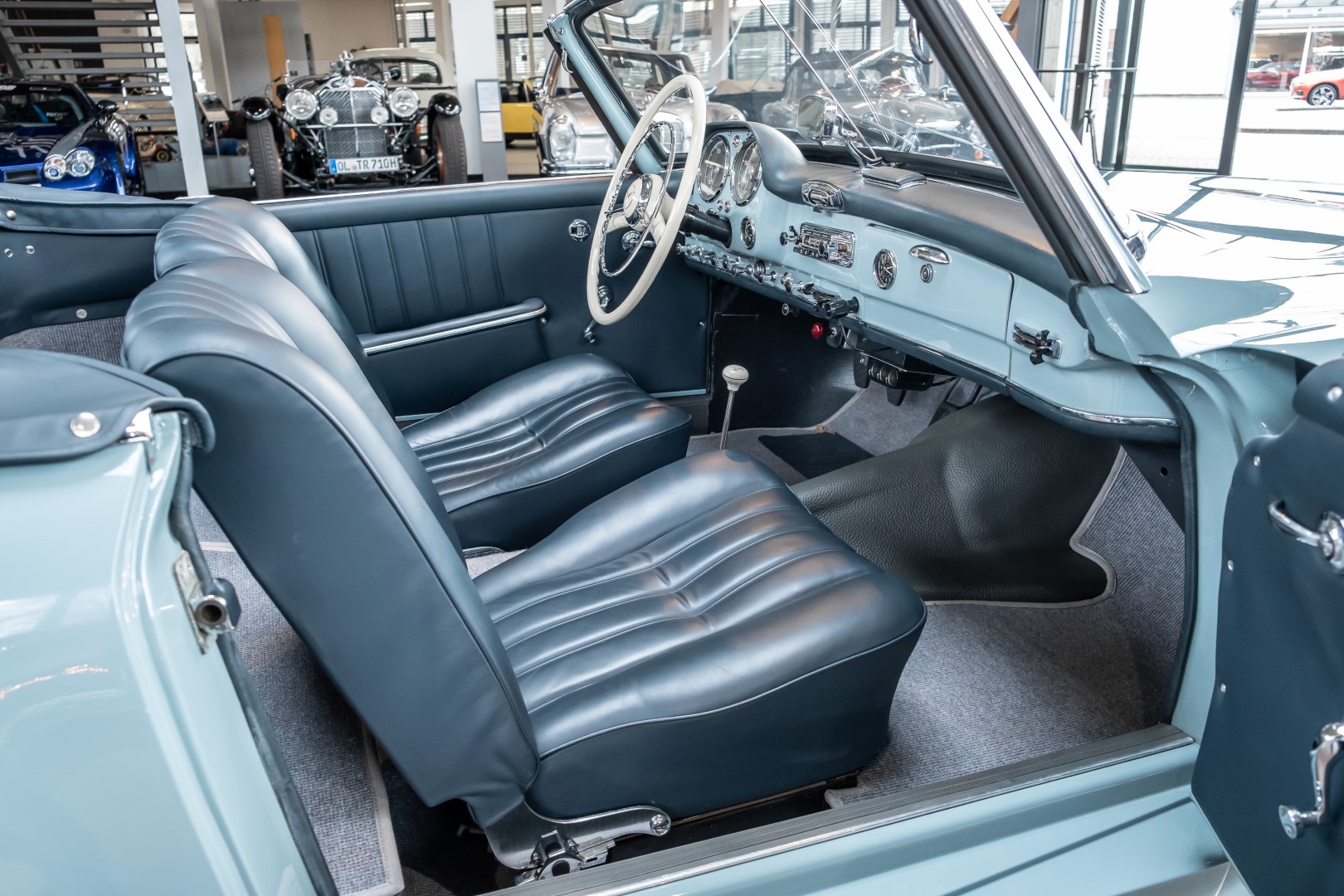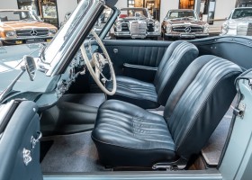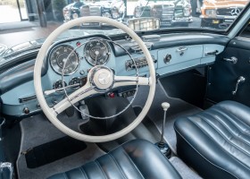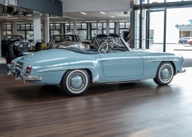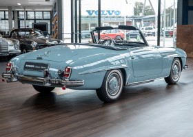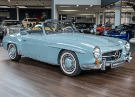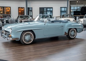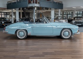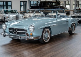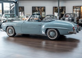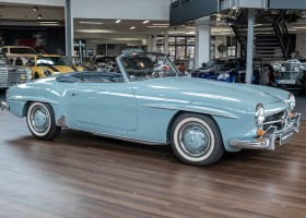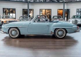 Dieser traumhafte 190 SL der Baureihe W121 wurde im Jahre 1962 fertiggestellt und gelang anschließend ins sonnige Kalifornien. Über 40 Jahre verblieb das Fahrzeug im Sonnenstaat bis das Fahrzeug im Jahre 1997 zurück nach Deutschland gelang. Durch das trockenwarme Klima war die Basis für die Restauration ideal. Bei einem renommierten Fachbetrieb wurde die Restauration von Grund auf und mit einem besonderen Maß an Qualität durchgeführt. Das Ergebnis beeindruckt: ein tadelloser Motorlauf, beste Fahreigenschaften und ein traumhaftes optisches Erscheinungsbild – vom Lackkleid über die Lederausstattung bis hin zum Stoffverdeck. Ein Mercedes-Enthusiast fand Gefallen an dem klassischen Roadster und verliebte sich spontan in die seltene Farbkombination Horizontblau mit dunkelblauem Leder und Verdeck-Stoff. Platzmangel ist der Grund dafür, dass wir Ihnen dieses Fahrzeug aus dessen erlesener Sammlung nun anbieten dürfen. Erleben Sie diesen Ausnahme 190er. Die nächsten Sonnentage kommen bestimmt.