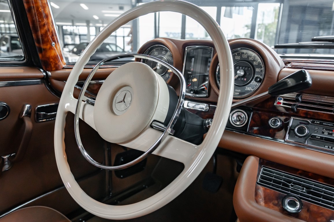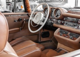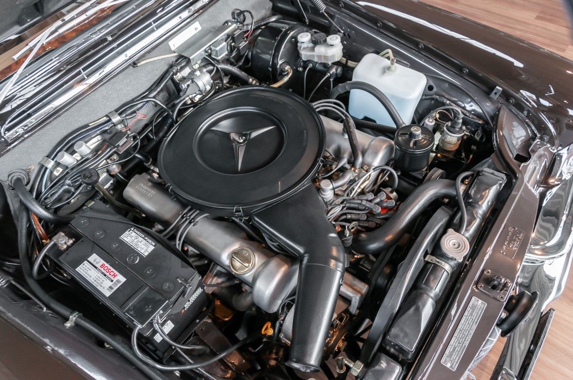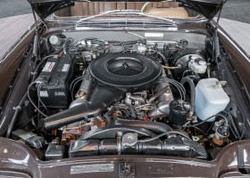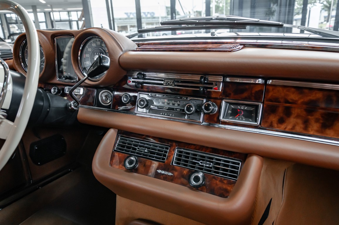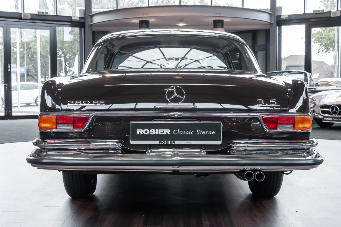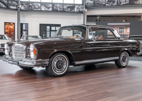 Die neuen Modelle präsentierten sich, wie auch die weiterhin angebotenen 2,8-l-Varianten mit Sechszylindermotor, stilistisch leicht überarbeitet. So war die Kühlermaske etwa 7 cm niedriger und breiter geworden, und die Motorhaube wurde nach vorne gehend abgeflacht. Dieses charakteristische Merkmal brachte dem Wagen im Volksmund den bis heute verwendeten Namen „Flachkühler“ ein. Auch die Stoßstangen wurden verändert. Sie waren nun wie bei den Limousinen auch, mit chromschützenden Gummileisten versehen, die so manchen kleinen Parkrempler verziehen. Das hier von uns angebotene 280SE 3.5 Coupé wurde am 27. April 1971 im Werk fertiggestellt. Seine üppige Ausstattung enthielt unter anderem komfortable elektrische Fensterheber, wärmedämmendes Glas und eine Klimaanlage aus dem Hause BEHR in Stuttgart. Für die musikalische Unterhaltung sorgte ein Qualitätsradiogerät aus dem Hause Becker. Ein Luxuscoupé in bester Qualität und atemberaubendem Design.