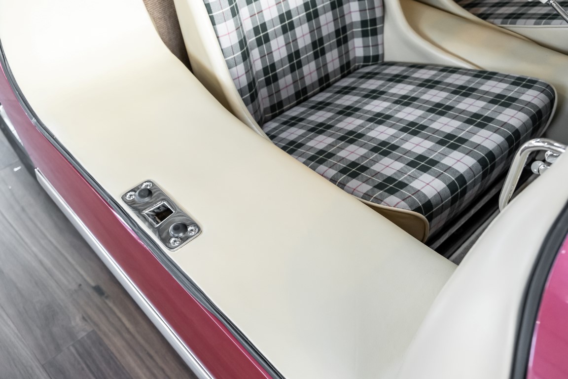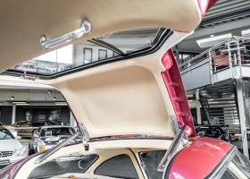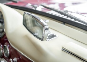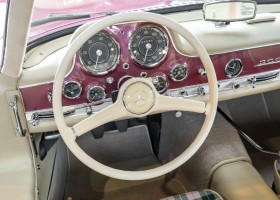 Laut dem Gullwing Group Registry war der erste Besitzer des Coupés Nr. 20 Roy Miller aus China Lake, USA. In den frühen 1970er Jahren wurde Weston Hook aus La Jolla, Kalifornien, Eigentümer, der den Wagen in den nächsten vier Jahrzehnten betreute und schließlich an seinen Sohn übergab. Weston Hook verbrachte seine Zeit sowohl in Kalifornien als auch auf Hawaii, wobei letzteres das Zentrum seiner Immobiliengeschäfte war, und so pendelte der Wagen zwischen den beiden sonnigen Orten am Pazifik. Nach mehreren Jahrzehnten des Besitzes und der Nutzung beauftragte Hook den wohl renommiertesten 300 SL-Restaurator Jerry Hjeltness aus Escondido, Kalifornien, mit einer Restaurierung, deren Ergebnis man kurz und knapp als außergewöhnlich bezeichnen kann. Im Laufe von zwei Jahren und mit viel Liebe zum Detail wurde der Flügel mit der Nr. 20 bis ins kleinste Detail komplett restauriert und in den zeitgemäßen Mercedes- Farben DB 543 Erdbeerrot Metallic lackiert. Die Kombination mit beigefarbener Lederausstattung und grün karierten Sitzen ist stilsicher und außergewöhnlich. Passendes Gepäck und verchromte Rudge-Räder vervollständigen das unbestreitbar schöne Erscheinungsbild, das in jeder Gesellschaft die Aufmerksamkeit auf sich zieht. Das Ergebnis dieser Restaurierung hat unweigerlich zu vielen Concours-Siegen in der Klasse und in ganzen Ausstellungsbereichen geführt. Das Auto ist einfach eine „Best-of-the-Best“-Restaurierung, von einem der besten 300SL-Restauratoren.
