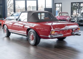 This Mercedes Benz 280SL Pagoda delivered in attractive (576G) red was delivered according to our records on August 23, 1968 to its first owner, a member of the US Navy in the USA. The car was equipped with a 4 speed manual transmission, black MB Tex, Becker radio and a hardtop painted in the color of the car. The first owner kept the car until 1972 and the new owner took great pleasure in the sensational roadster and kept the car for a total of 22 years before giving it to his niece in Massachusetts in 1994. She had a teaching job at the university and lived within walking distance. So over the next 17 years, the car was driven just 829 miles. In 2011, the 3rd owner to date sold the car. In 2014, the Pagoda was relinquished again and finally came into our possession in Germany in the spring of 2016.
