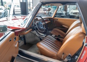 An interesting Pagoda with a comprehensible history, which would have been immediately ready for extended trips. Our plans for the vehicle, however, were different. Under our direction, the car underwent an extensive restoration. The task was to achieve a quality restoration at the highest level of craftsmanship. See for yourself, the goal was excellently achieved. The body has been extensively reworked and repainted, axles and transmission have been overhauled, the engine has been tested and fine-tuned after passing the pressure loss test. Powerful running and a clean compression pattern underline the result. To upgrade the interior and give the overall look the final touch, we decided to upgrade the interior with fine leather in cognac instead of the original MB-Tex. A soft top in dark brown makes this Pagoda a real eye-catcher. All in all a special Pagoda, which knows how to convince with its unique charm and inspires with manual transmission. Get in and experience this dream pagoda with all your senses.