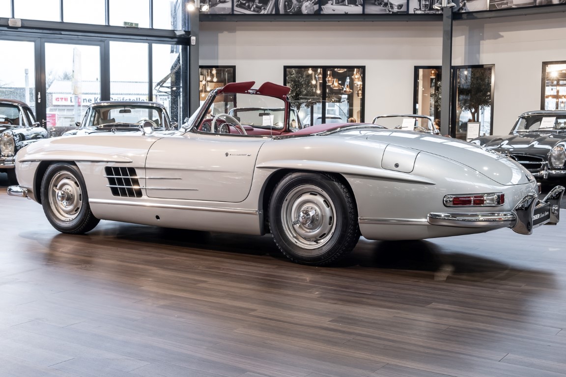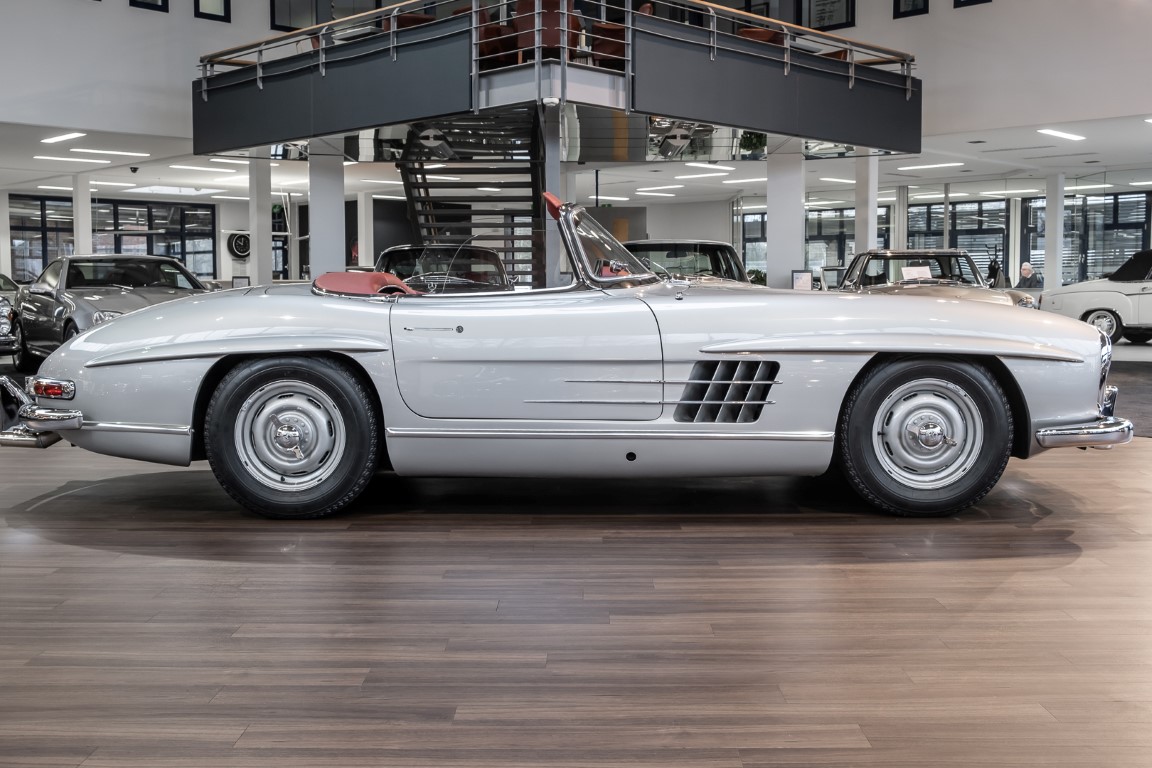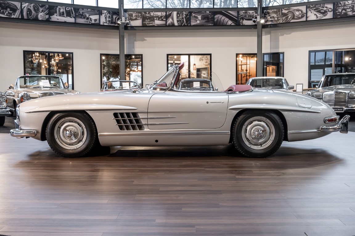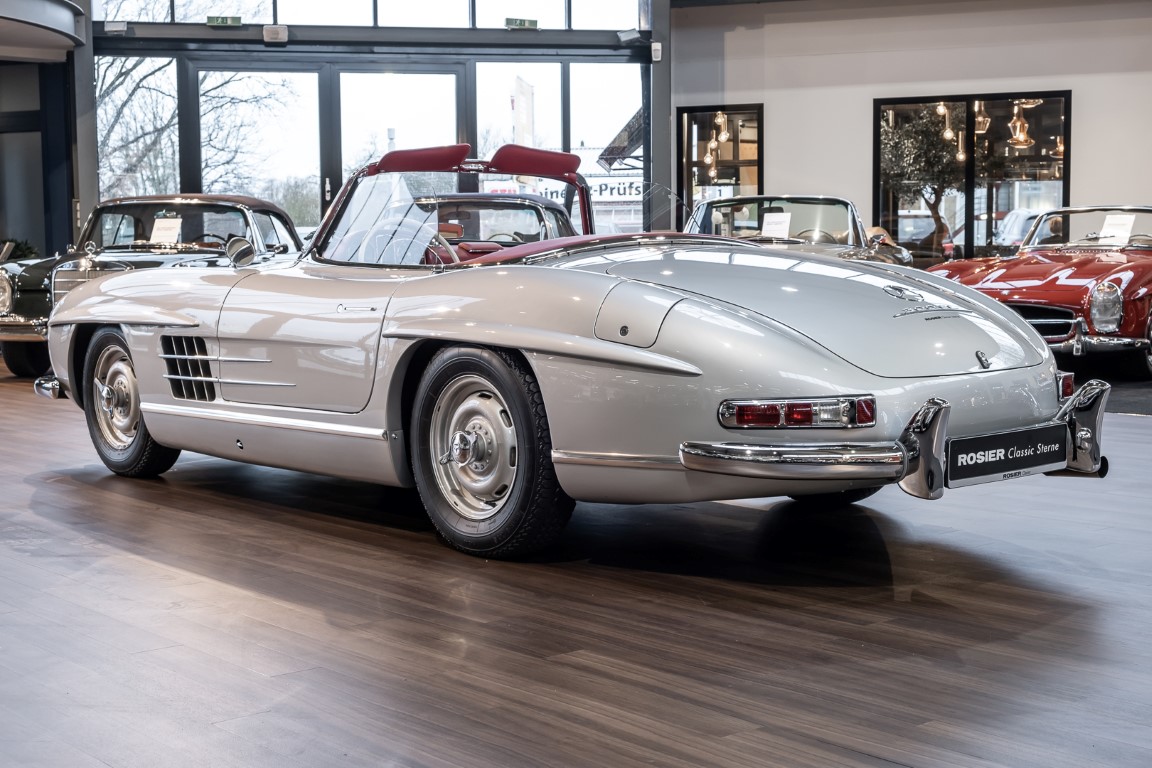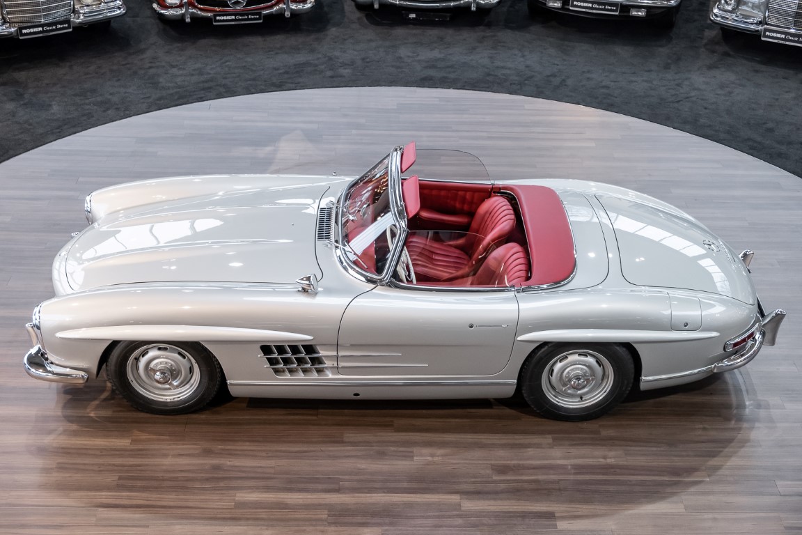 This Mercedes-Benz 300SL Roadster was completed in the factory on 9 December 1957 and made available for delivery to the customer. The first owner was the ROMA garage of Robert May & Sohn in the east of Frankfurt am Main. The car was subsequently sold to the USA. Bob Estes, a very well known car collector had brought it from Virginia in 1997 and included it in his collection. The documented speedometer reading at that time was 84,514 mls. Bob Estes hardly ever drove the car and handed it over to his son Dale Estes, who obviously did not find the time to drive the elegant roadster either. In 2001 the car was purchased by the renowned Mercedes classic expert Scott Grundfor in Kalamazoo Michigan. The excellent condition of the car and today's speedometer reading of only 84,983 indicates that the car has also undergone a major overhaul here. In 2001 the car went to Dr. Morton C. Wellington in Jacksonville/Florida, a lover and also collector of classic cars. Dr. Wellington is well known in the local classic car scene for his participation in top-class Concours events with his 1926 Rolls-Royce Piccadilly Roadster. 2012 the elegant 300SL Roadster was acquired by Richard Wolf, a respected history professor at the University of Santa Barbara. Afterwards the vehicle was added to an exquisite collection of exquisite individual pieces, from which the vehicle is now being sold. A uniquely beautiful matching numbers roadster in original paint and interior color scheme, equipped with rare Rudge hub caps. Do not miss it.
