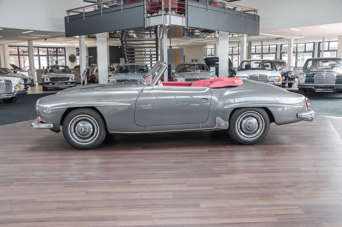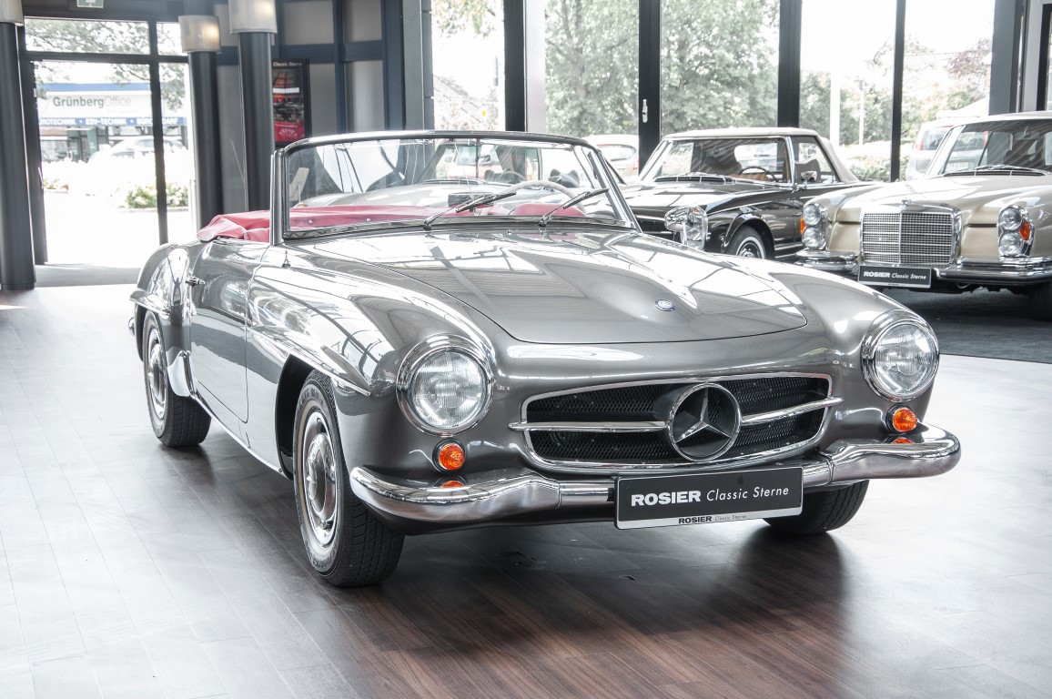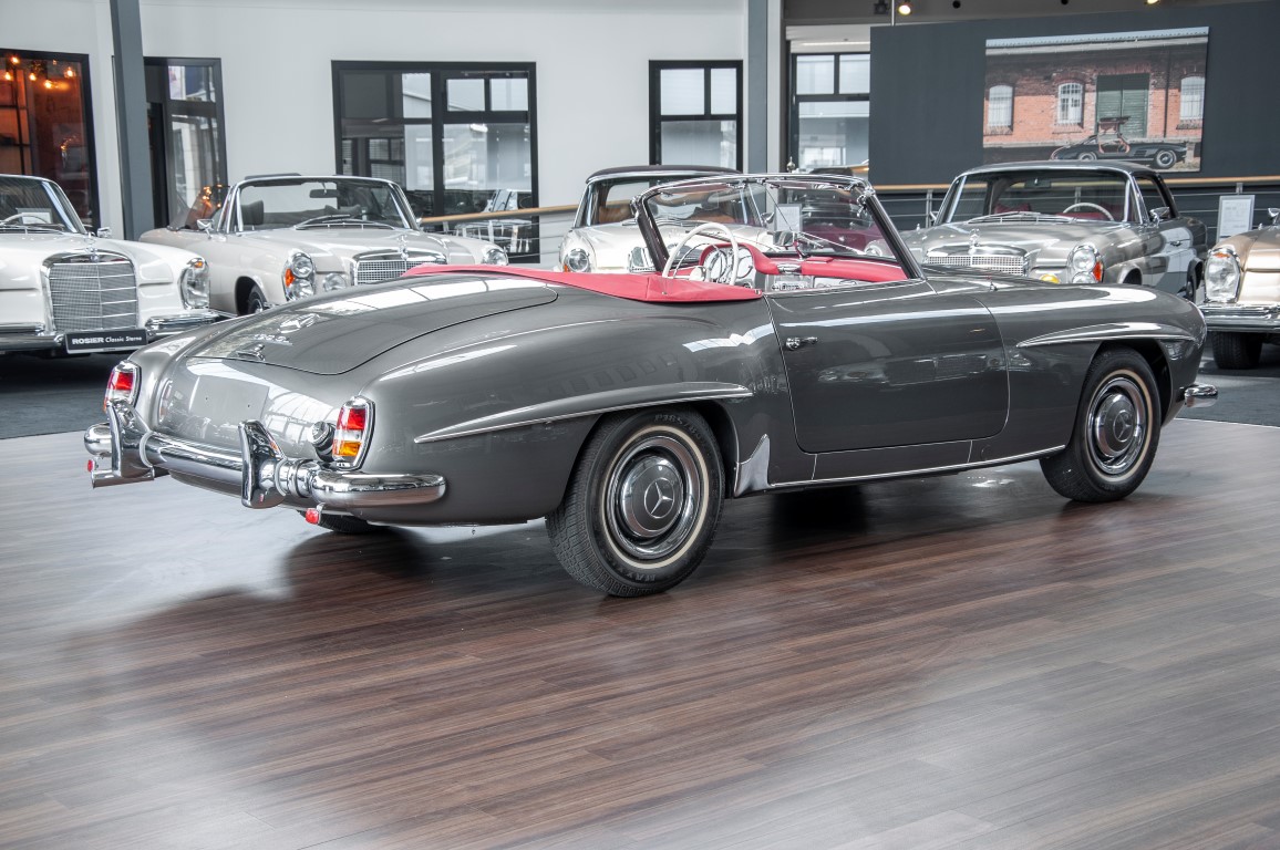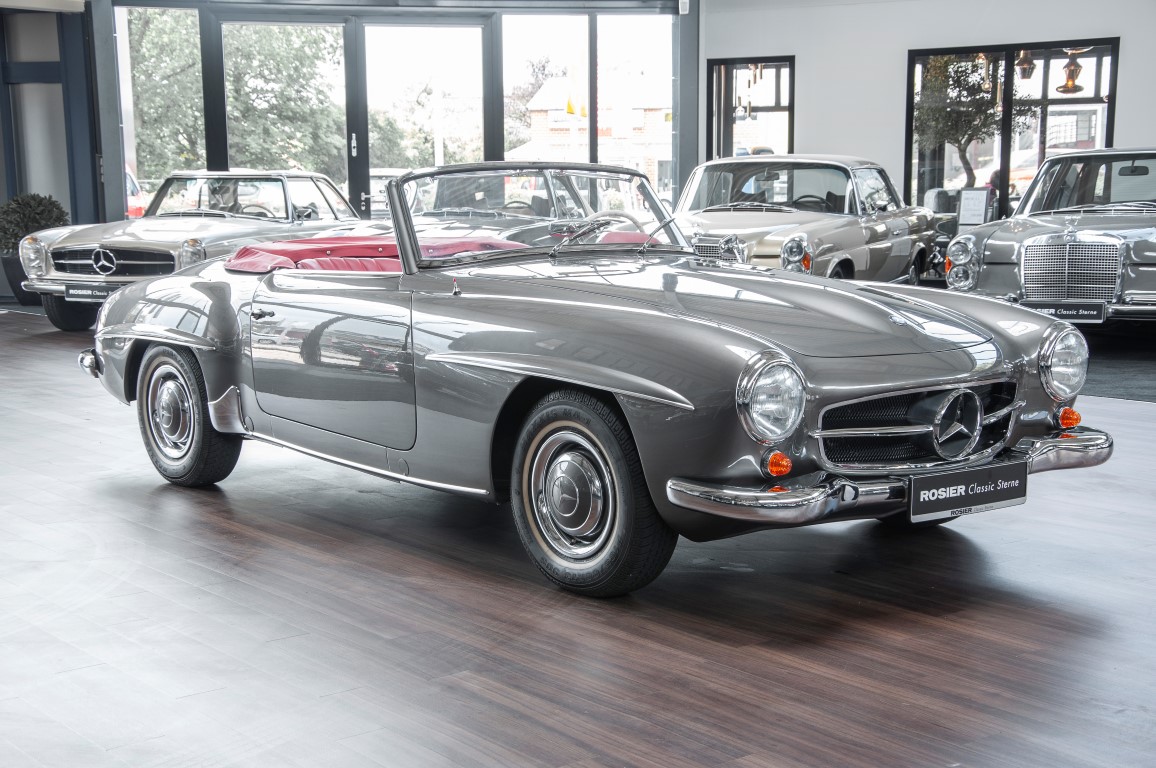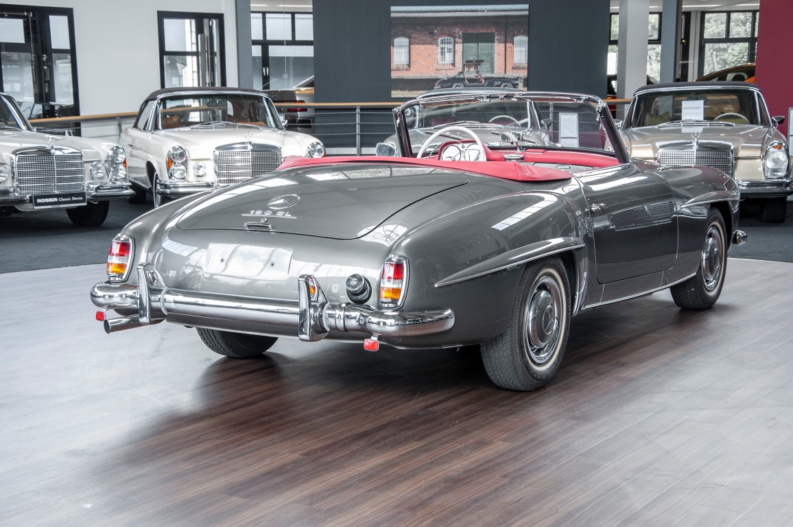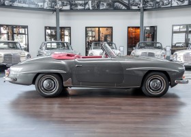 Dieser hochelegante Mercedes-Benz 190SL Roadster wurde im April 1959 an den Generalvertreter von Daimler-Benz, Joseph F. Weckerle, in das inzwischen unabhängig gewordene Französisch Marokko geliefert. Er war ein großer Fan dieser eleganten Roadster Serie und verkaufte sie gerne an die vermögende Oberschicht zu der er glänzende Kontakte pflegte. Er selbst gewann schon 1956 den „Großen Preis von Casablanca“ in einem Mercedes-Benz 190SL Tourensportwagen und hatte sich damit einen guten Namen gemacht. In der Folge fand der Roadster seinen Weg in die USA. Dort war er höchst beliebt und galt als eines der elegantesten Fahrzeuge der 1950er und beginnenden 1960er Jahre schlechthin. In 2011 kam der 190SL in sein Geburtsland, nach Deutschland zurück. Ein Mercedes Spezialist nahe der schwäbischen Hauptstadt Stuttgart hatte ihn erworben. Er unterzog den 190SL Roadster einer detailgenauen Vollrestaurierung. Das Ergebnis schwäbischer Handwerkskunst war traumhaft. Alles präsentierte sich wie neu. Die Farbgebung in der originalen Mercedes-Benz Farbe, DB 172 „anthrazitgrau-metallic“ in Verbindung mit dunkelrotem Leder, ließ den 190SL wirken wie seinen großen Bruder den 300SL. Eine einmalig schöne Ausstrahlung. Dem Charme dieses Roadsters erlag schon bald ein prominenter Schwabe, der den Wagen bis heute in seinem Besitz hielt. Lassen auch Sie sich vom Charme dieses Roadsters einfangen, beginnen Sie schon bald herrliche Ausfahrten mit offenem Verdeck und erfreuen Sie sich an freundlichem Zuwinken so mancher Teilnehmer im Straßenverkehr.