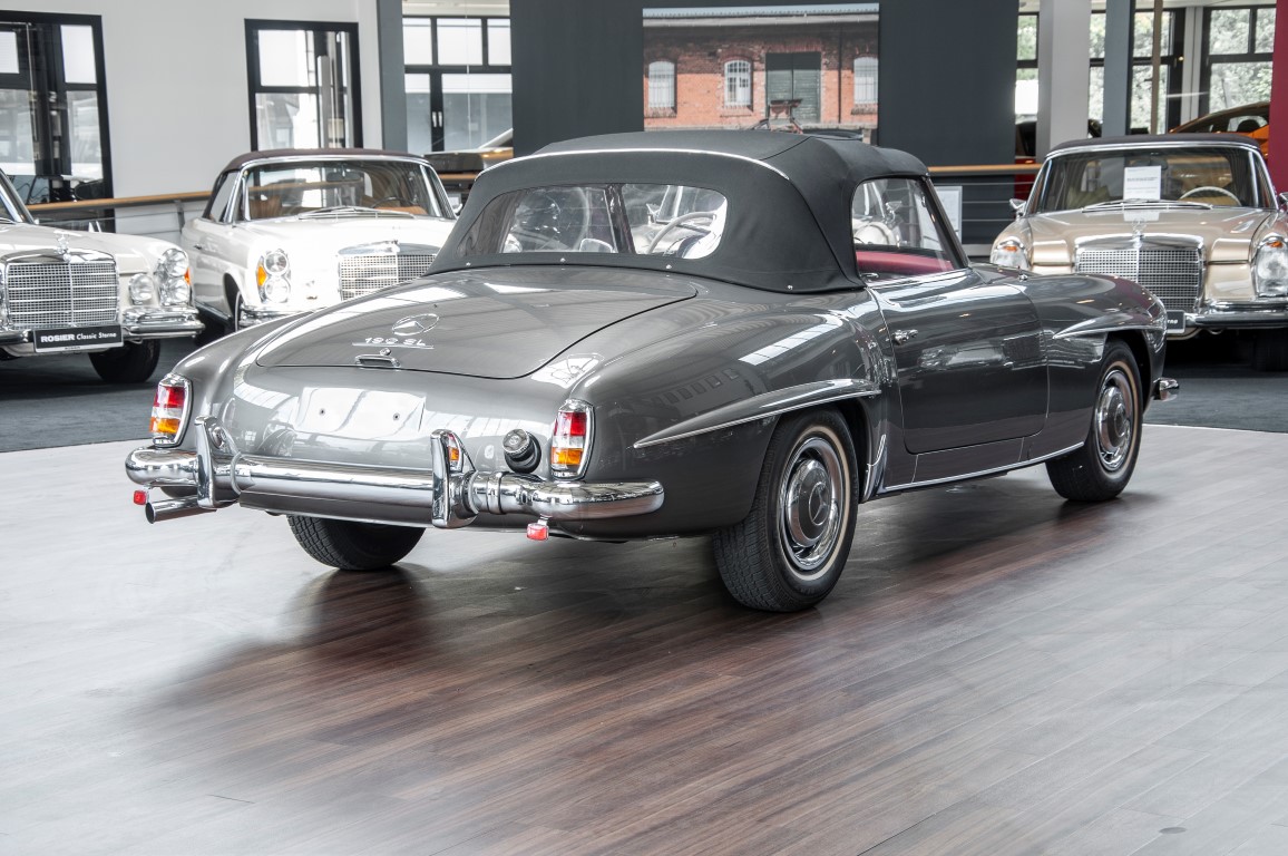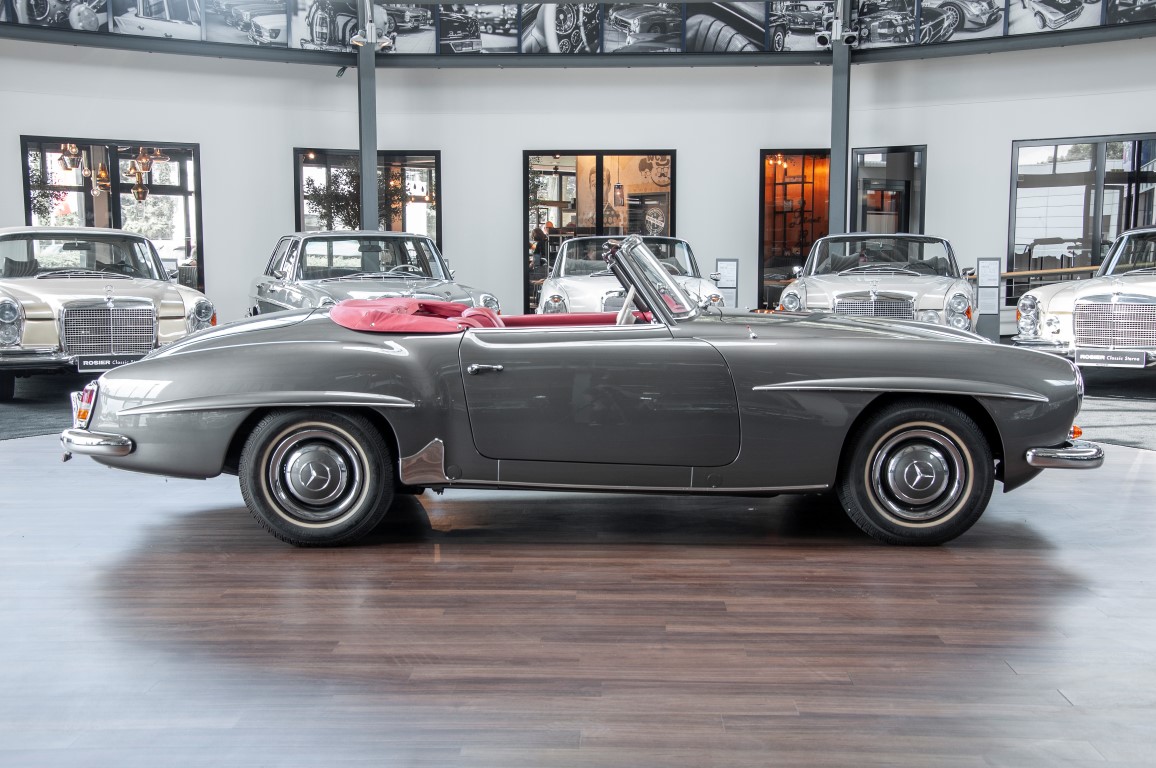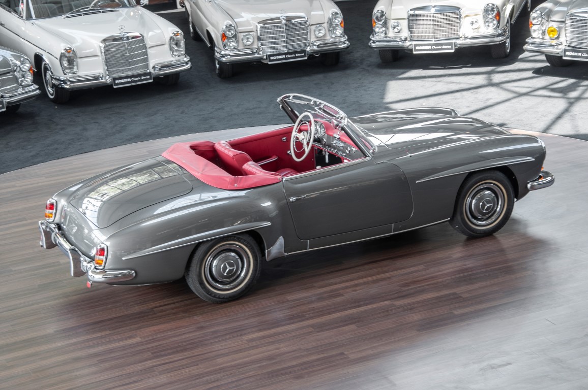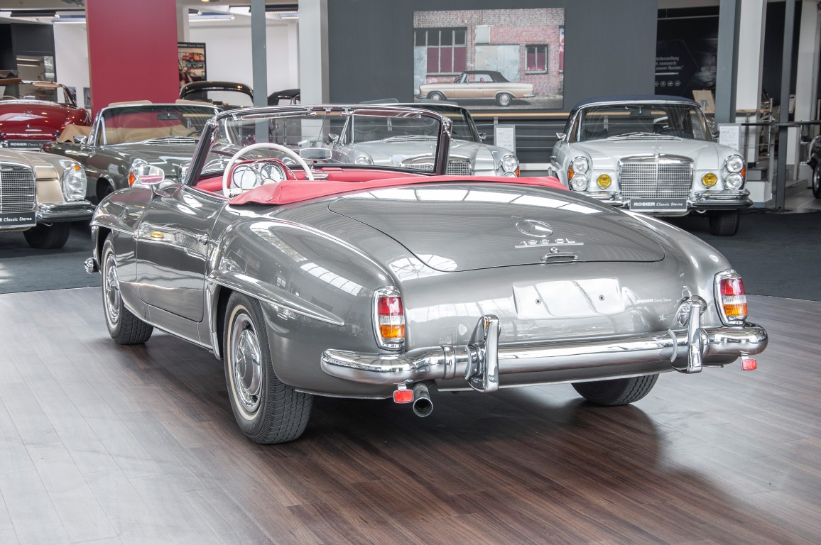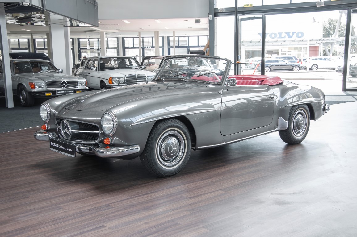 Dieser hochelegante Mercedes-Benz 190SL Roadster wurde im April 1959 an den Generalvertreter von Daimler-Benz, Joseph F. Weckerle, in das inzwischen unabhängig gewordene Französisch Marokko geliefert. Er war ein großer Fan dieser eleganten Roadster Serie und verkaufte sie gerne an die vermögende Oberschicht zu der er glänzende Kontakte pflegte. Er selbst gewann schon 1956 den „Großen Preis von Casablanca“ in einem Mercedes-Benz 190SL Tourensportwagen und hatte sich damit einen guten Namen gemacht. In der Folge fand der Roadster seinen Weg in die USA. Dort war er höchst beliebt und galt als eines der elegantesten Fahrzeuge der 1950er und beginnenden 1960er Jahre schlechthin. In 2011 kam der 190SL in sein Geburtsland, nach Deutschland zurück. Ein Mercedes Spezialist nahe der schwäbischen Hauptstadt Stuttgart hatte ihn erworben. Er unterzog den 190SL Roadster einer detailgenauen Vollrestaurierung. Das Ergebnis schwäbischer Handwerkskunst war traumhaft. Alles präsentierte sich wie neu. Die Farbgebung in der originalen Mercedes-Benz Farbe, DB 172 „anthrazitgrau-metallic“ in Verbindung mit dunkelrotem Leder, ließ den 190SL wirken wie seinen großen Bruder den 300SL. Eine einmalig schöne Ausstrahlung. Dem Charme dieses Roadsters erlag schon bald ein prominenter Schwabe, der den Wagen bis heute in seinem Besitz hielt. Lassen auch Sie sich vom Charme dieses Roadsters einfangen, beginnen Sie schon bald herrliche Ausfahrten mit offenem Verdeck und erfreuen Sie sich an freundlichem Zuwinken so mancher Teilnehmer im Straßenverkehr.