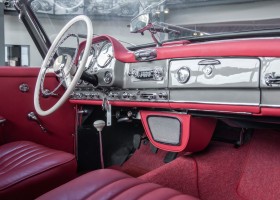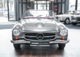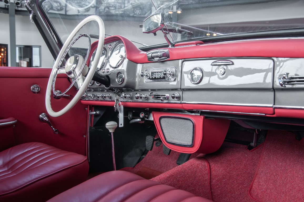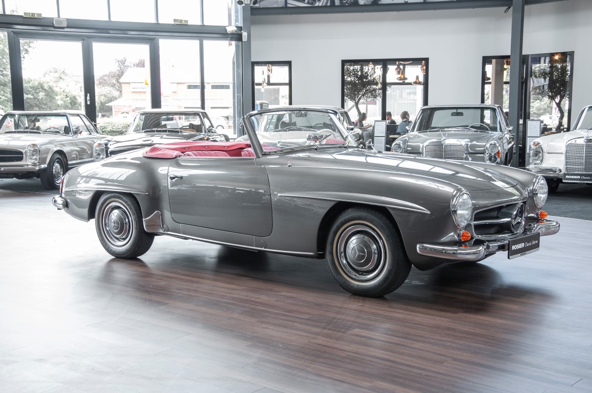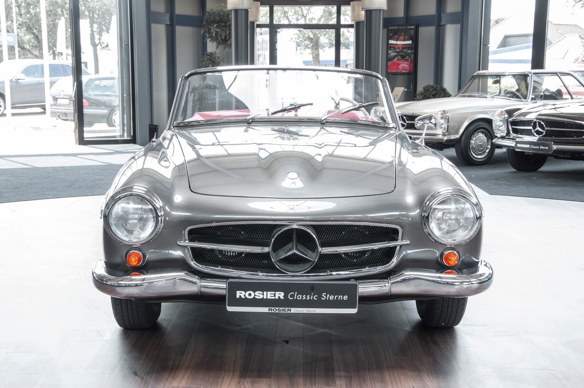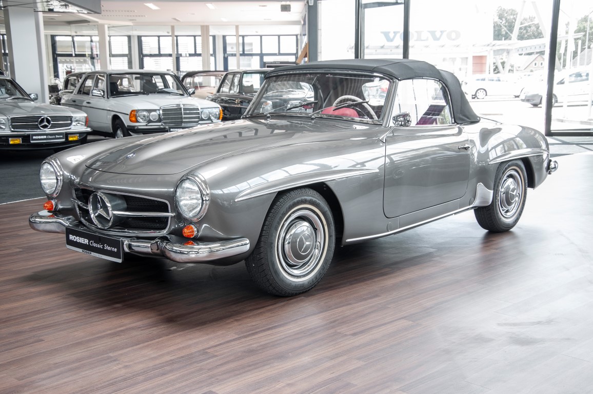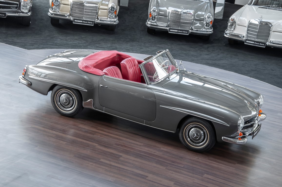 Dieser hochelegante Mercedes-Benz 190SL Roadster wurde im April 1959 an den Generalvertreter von Daimler-Benz, Joseph F. Weckerle, in das inzwischen unabhängig gewordene Französisch Marokko geliefert. Er war ein großer Fan dieser eleganten Roadster Serie und verkaufte sie gerne an die vermögende Oberschicht zu der er glänzende Kontakte pflegte. Er selbst gewann schon 1956 den „Großen Preis von Casablanca“ in einem Mercedes-Benz 190SL Tourensportwagen und hatte sich damit einen guten Namen gemacht. In der Folge fand der Roadster seinen Weg in die USA. Dort war er höchst beliebt und galt als eines der elegantesten Fahrzeuge der 1950er und beginnenden 1960er Jahre schlechthin. In 2011 kam der 190SL in sein Geburtsland, nach Deutschland zurück. Ein Mercedes Spezialist nahe der schwäbischen Hauptstadt Stuttgart hatte ihn erworben. Er unterzog den 190SL Roadster einer detailgenauen Vollrestaurierung. Das Ergebnis schwäbischer Handwerkskunst war traumhaft. Alles präsentierte sich wie neu. Die Farbgebung in der originalen Mercedes-Benz Farbe, DB 172 „anthrazitgrau-metallic“ in Verbindung mit dunkelrotem Leder, ließ den 190SL wirken wie seinen großen Bruder den 300SL. Eine einmalig schöne Ausstrahlung. Dem Charme dieses Roadsters erlag schon bald ein prominenter Schwabe, der den Wagen bis heute in seinem Besitz hielt. Lassen auch Sie sich vom Charme dieses Roadsters einfangen, beginnen Sie schon bald herrliche Ausfahrten mit offenem Verdeck und erfreuen Sie sich an freundlichem Zuwinken so mancher Teilnehmer im Straßenverkehr.