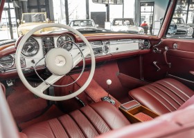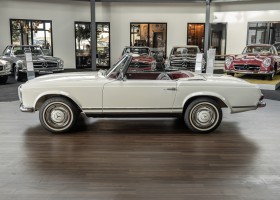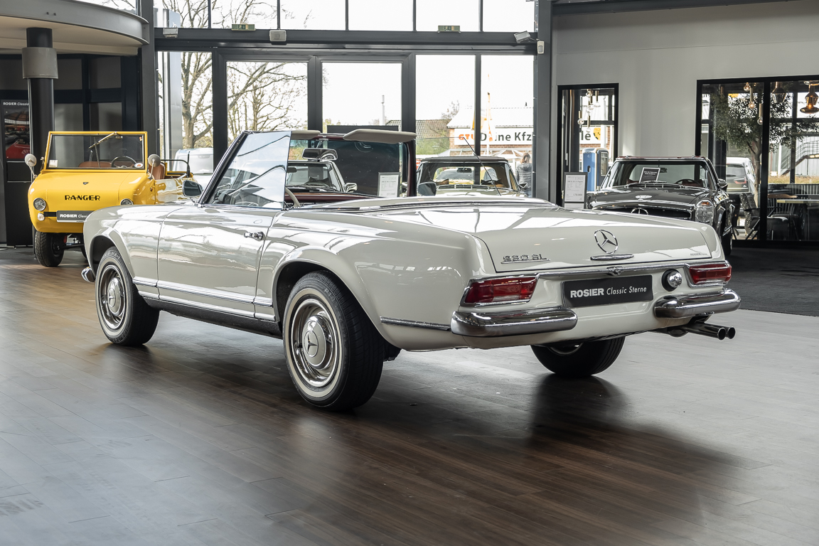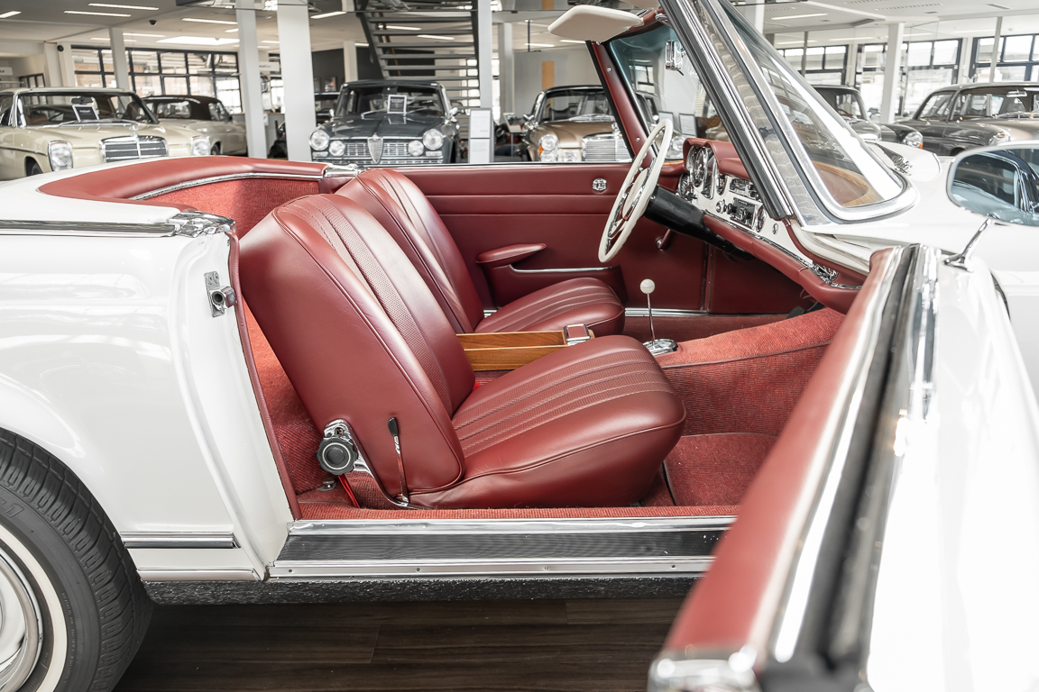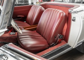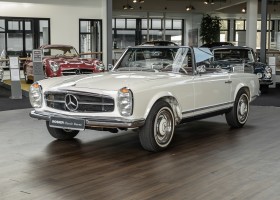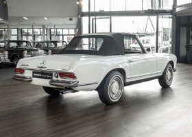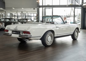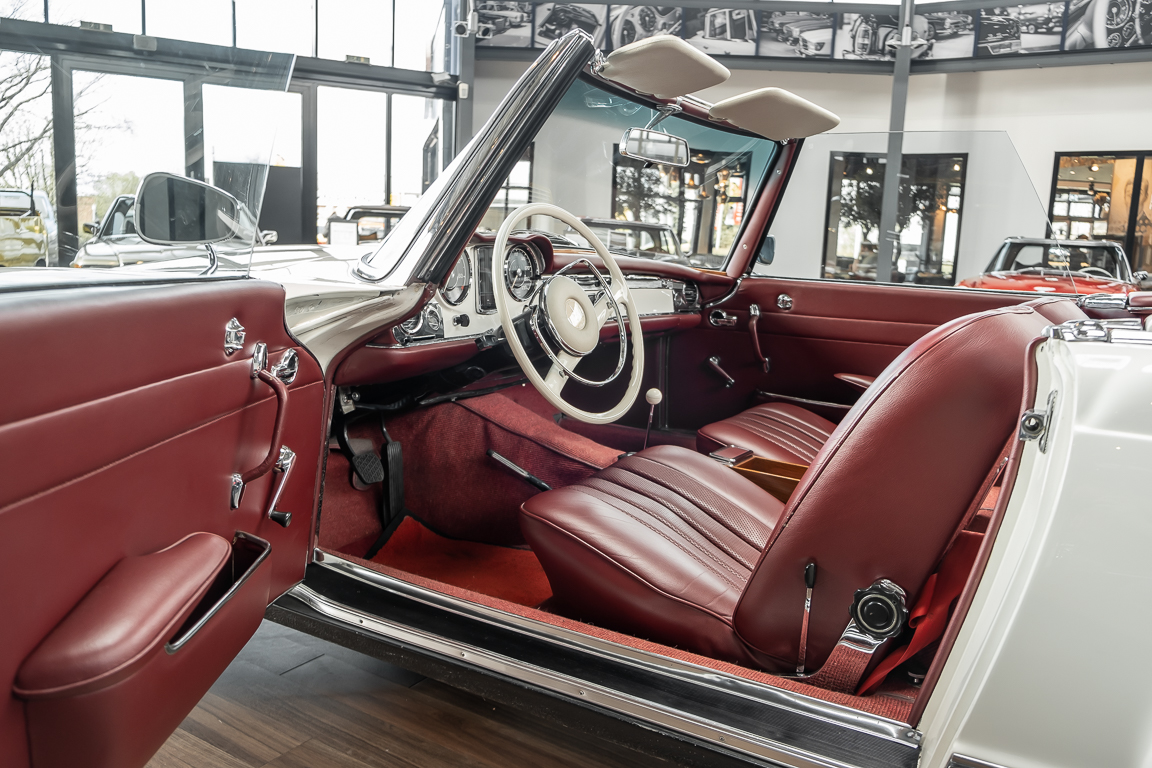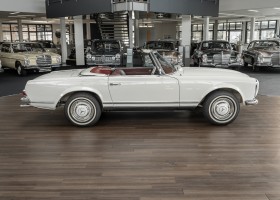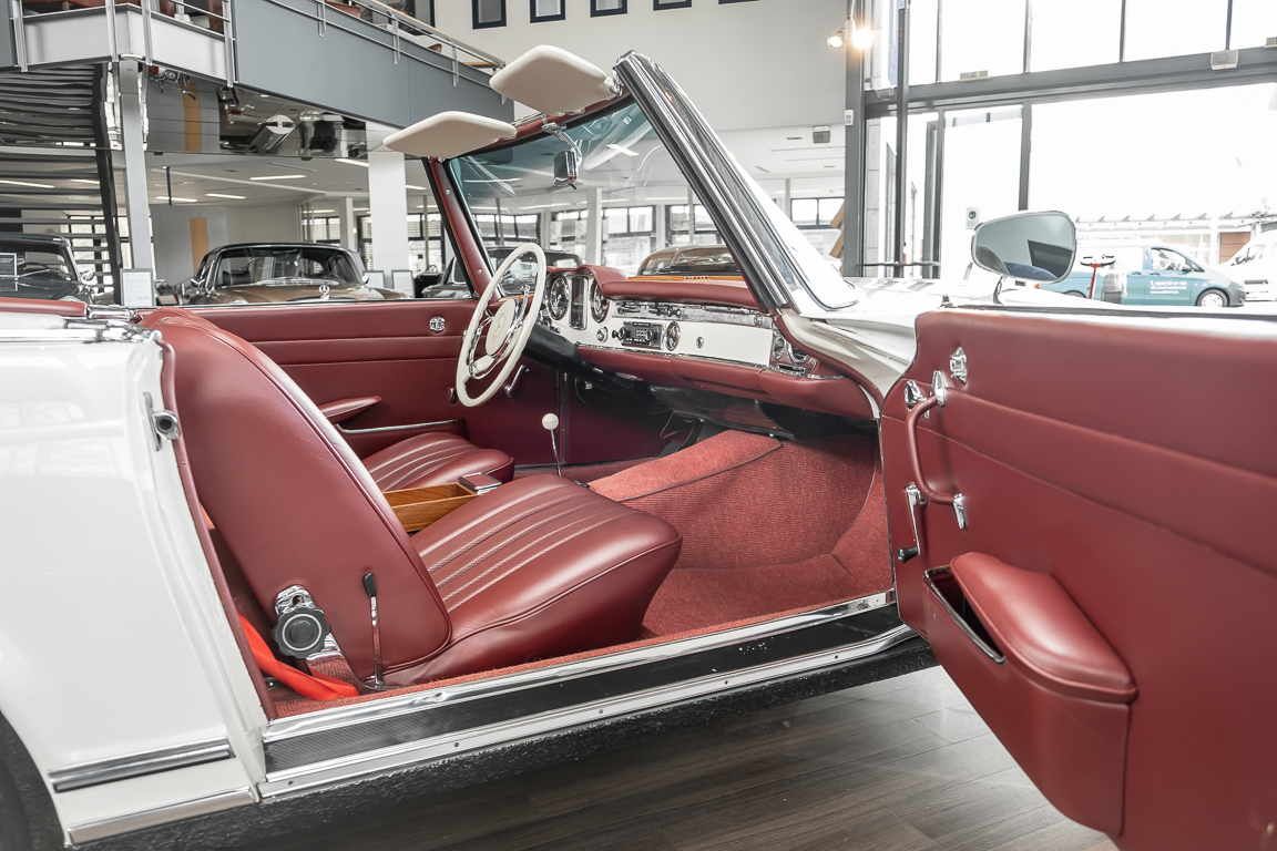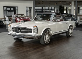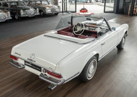 Diese elegante Mercedes-Benz 230SL Pagode aus 1966 wurde an Ihren erste Besitzer im sonnigen Kalifornien/USA ausgeliefert. Die Auslieferungsfarbe war 050 weiß in Verbindung mit rotem Leder. In 2011 erwarben wir den Wagen in Emeryville, einer beschaulichen Kleinstadt im Alameda County im Bundesstaat Kalifornien/USA. Die Substanz der mittlerweile 45 Jahre alten Pagode war ausgezeichnet. Aus Qualitätsüberlegungen heraus haben wir uns trotzdem entschieden, den Wagen umfangreich zu überarbeiten. In diesem Zug wurde auch das in die Jahre gekommene Interieur des Wagens von unserem Sattler in Spitzenqualität erneuert. Nach Fertigstellung in 2012 verkauften wir den Wagen an einen Liebhaber Klassischer Automobile hier in Niedersachsen. Der Wagen kam regelmäßig zu uns in den Service und erhielt vor etwa 1 Jahr eine neue Einspritzpumpe. Der enge Terminkalender des Besitzers lässt Ihm leider nicht viel Zeit für die Nutzung der Pagode. Gerade einmal rund 6.000 km kamen in den letzten 10 Jahren zusammen. So hat sich der bisherige Besitzer nun dazu entschieden, den Wagen in eine neue liebevolle Hand abzugeben. Die Aufgabe des Verkaufs haben wir gerne übernommen. Gerne zeigen wir Ihnen die Pagode ausführlich hier in unserem Showroom in Oldenburg, Sie werden begeistert sein.
