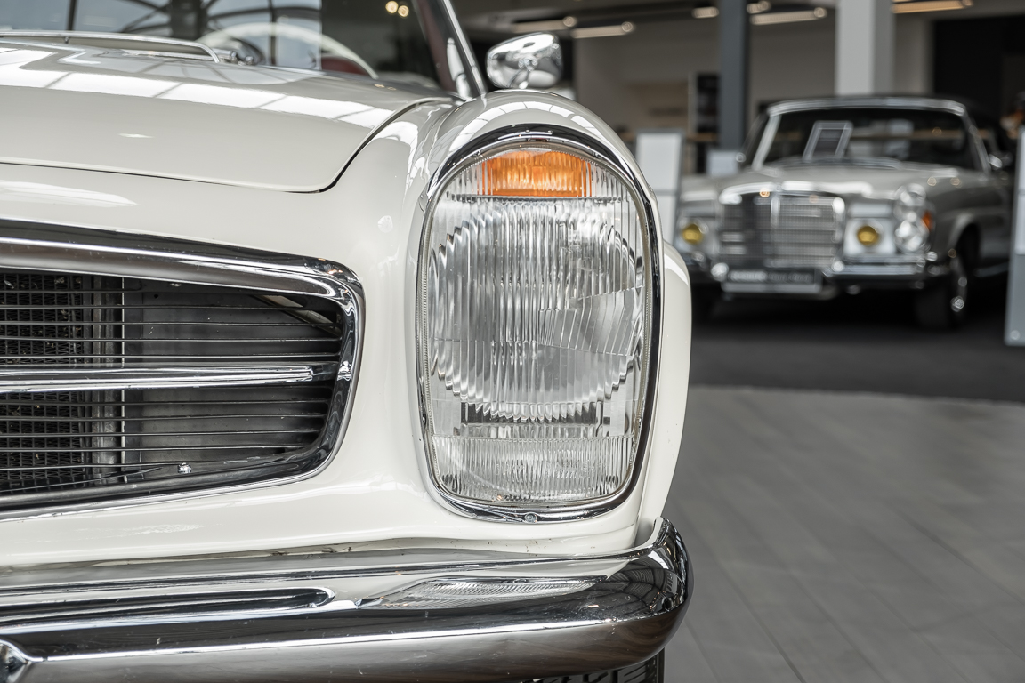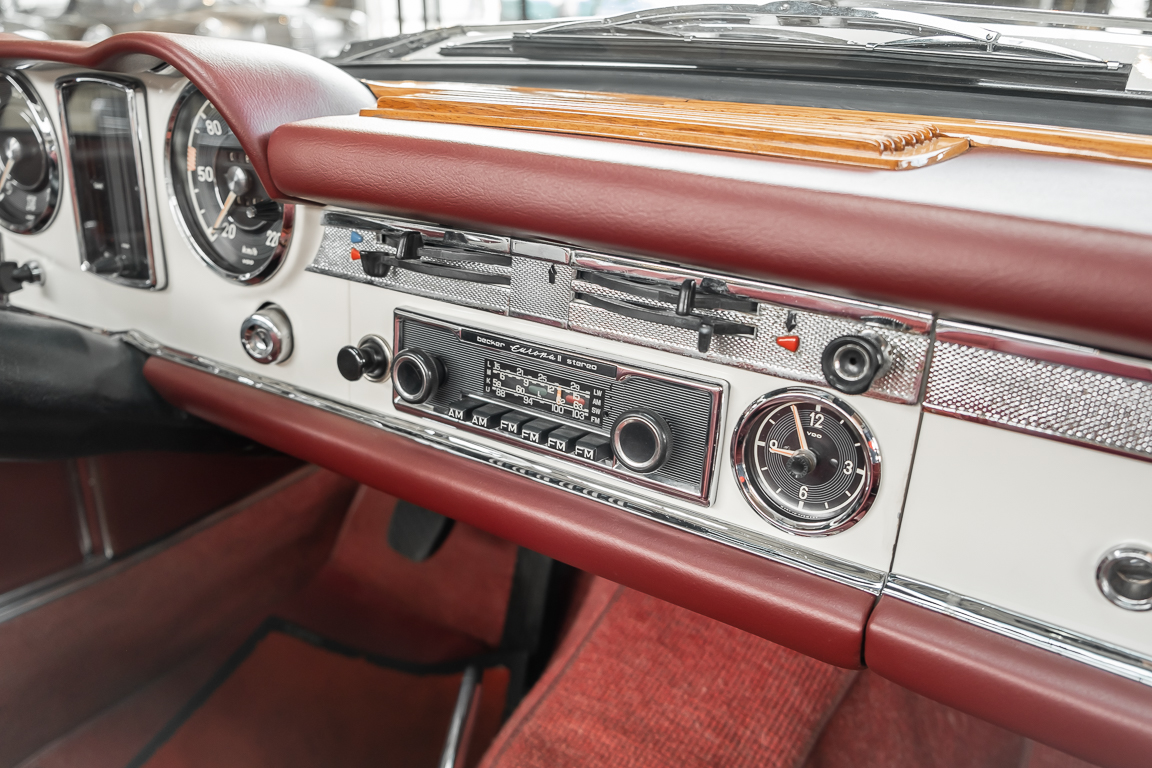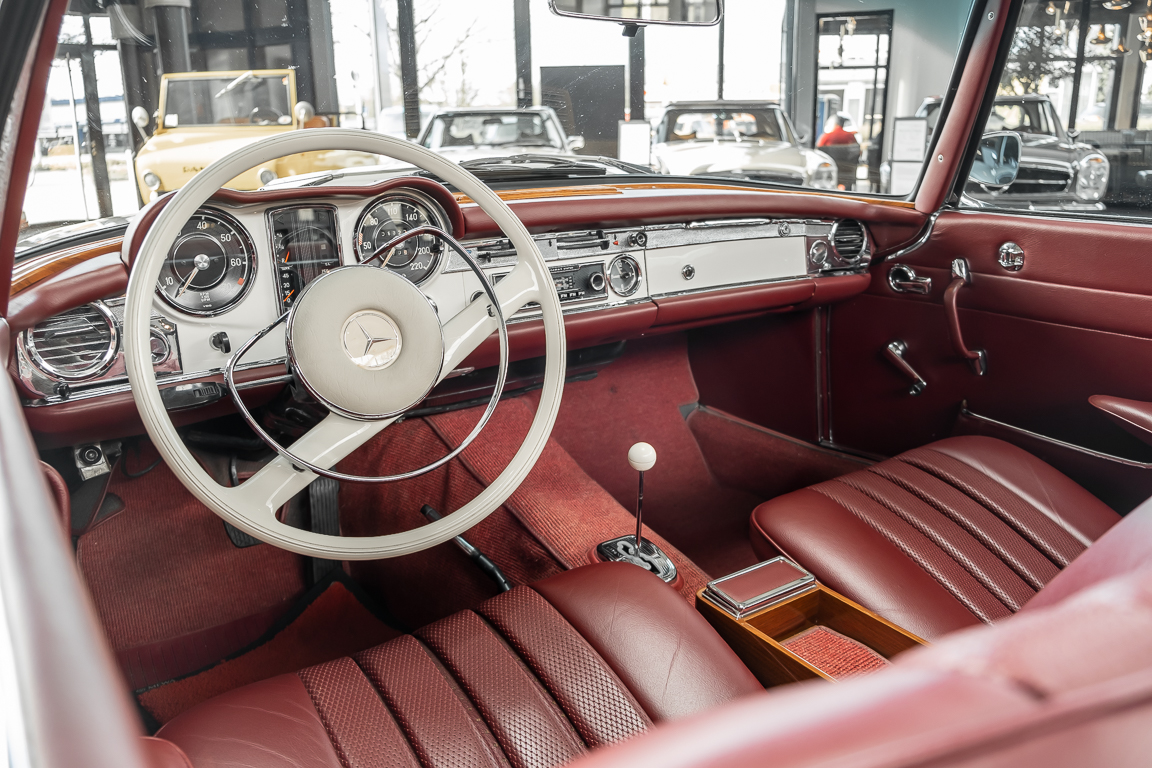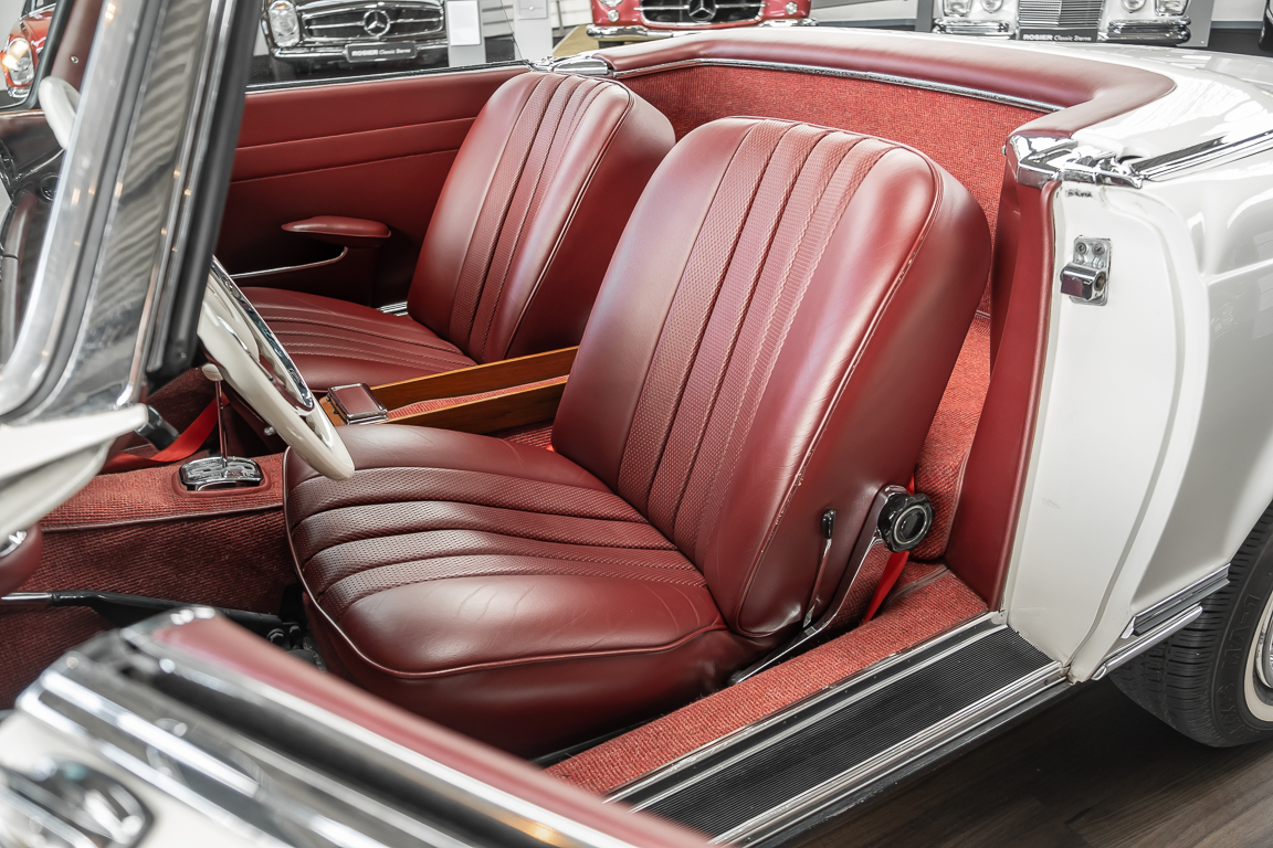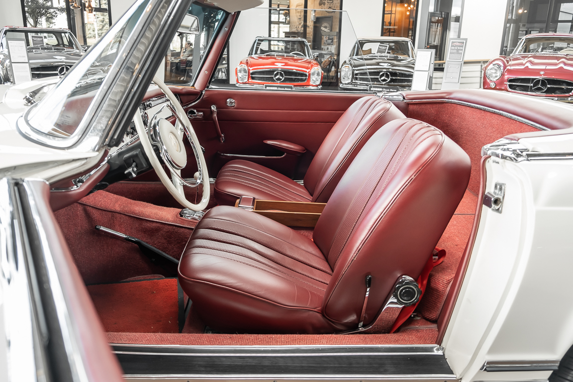 Diese elegante Mercedes-Benz 230SL Pagode aus 1966 wurde an Ihren erste Besitzer im sonnigen Kalifornien/USA ausgeliefert. Die Auslieferungsfarbe war 050 weiß in Verbindung mit rotem Leder. In 2011 erwarben wir den Wagen in Emeryville, einer beschaulichen Kleinstadt im Alameda County im Bundesstaat Kalifornien/USA. Die Substanz der mittlerweile 45 Jahre alten Pagode war ausgezeichnet. Aus Qualitätsüberlegungen heraus haben wir uns trotzdem entschieden, den Wagen umfangreich zu überarbeiten. In diesem Zug wurde auch das in die Jahre gekommene Interieur des Wagens von unserem Sattler in Spitzenqualität erneuert. Nach Fertigstellung in 2012 verkauften wir den Wagen an einen Liebhaber Klassischer Automobile hier in Niedersachsen. Der Wagen kam regelmäßig zu uns in den Service und erhielt vor etwa 1 Jahr eine neue Einspritzpumpe. Der enge Terminkalender des Besitzers lässt Ihm leider nicht viel Zeit für die Nutzung der Pagode. Gerade einmal rund 6.000 km kamen in den letzten 10 Jahren zusammen. So hat sich der bisherige Besitzer nun dazu entschieden, den Wagen in eine neue liebevolle Hand abzugeben. Die Aufgabe des Verkaufs haben wir gerne übernommen. Gerne zeigen wir Ihnen die Pagode ausführlich hier in unserem Showroom in Oldenburg, Sie werden begeistert sein.