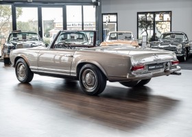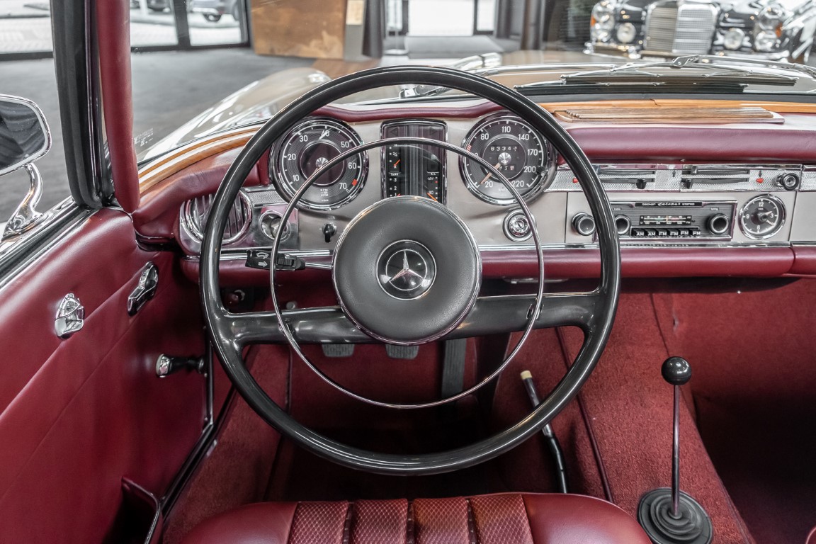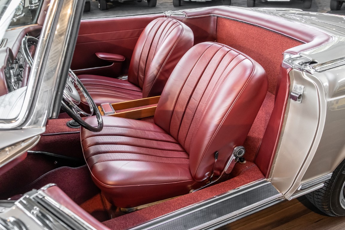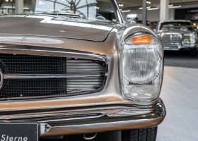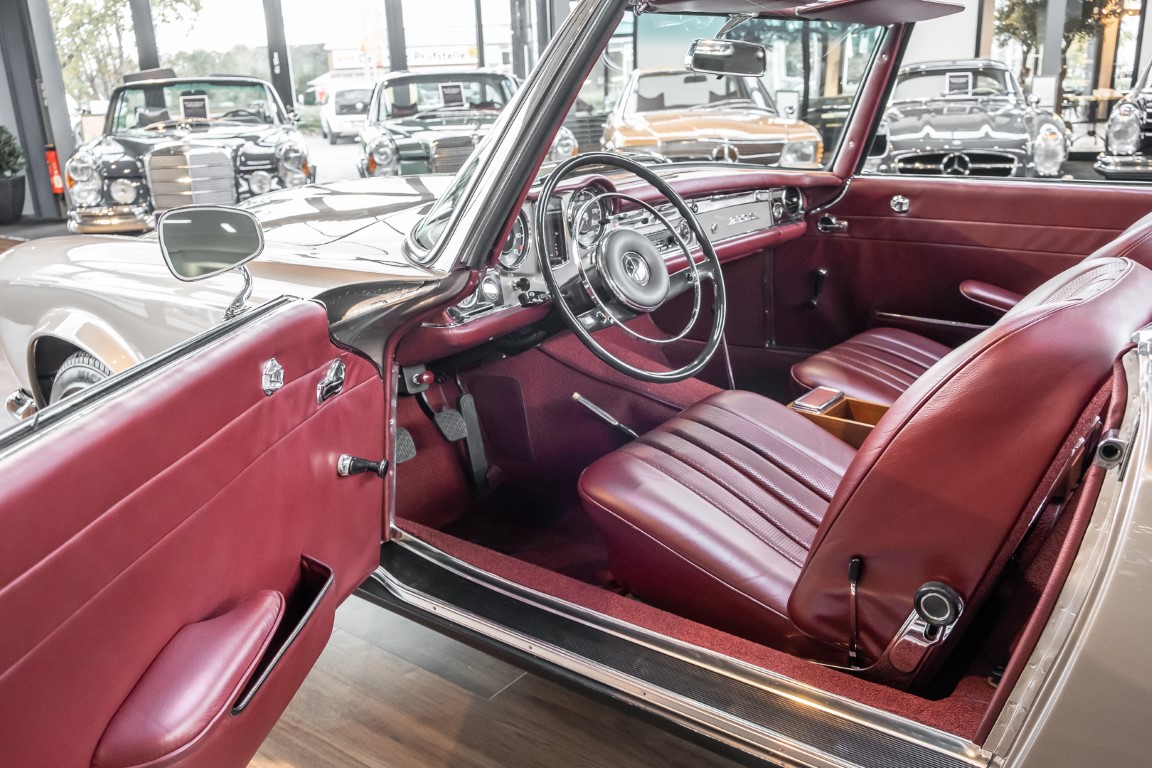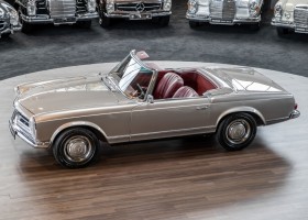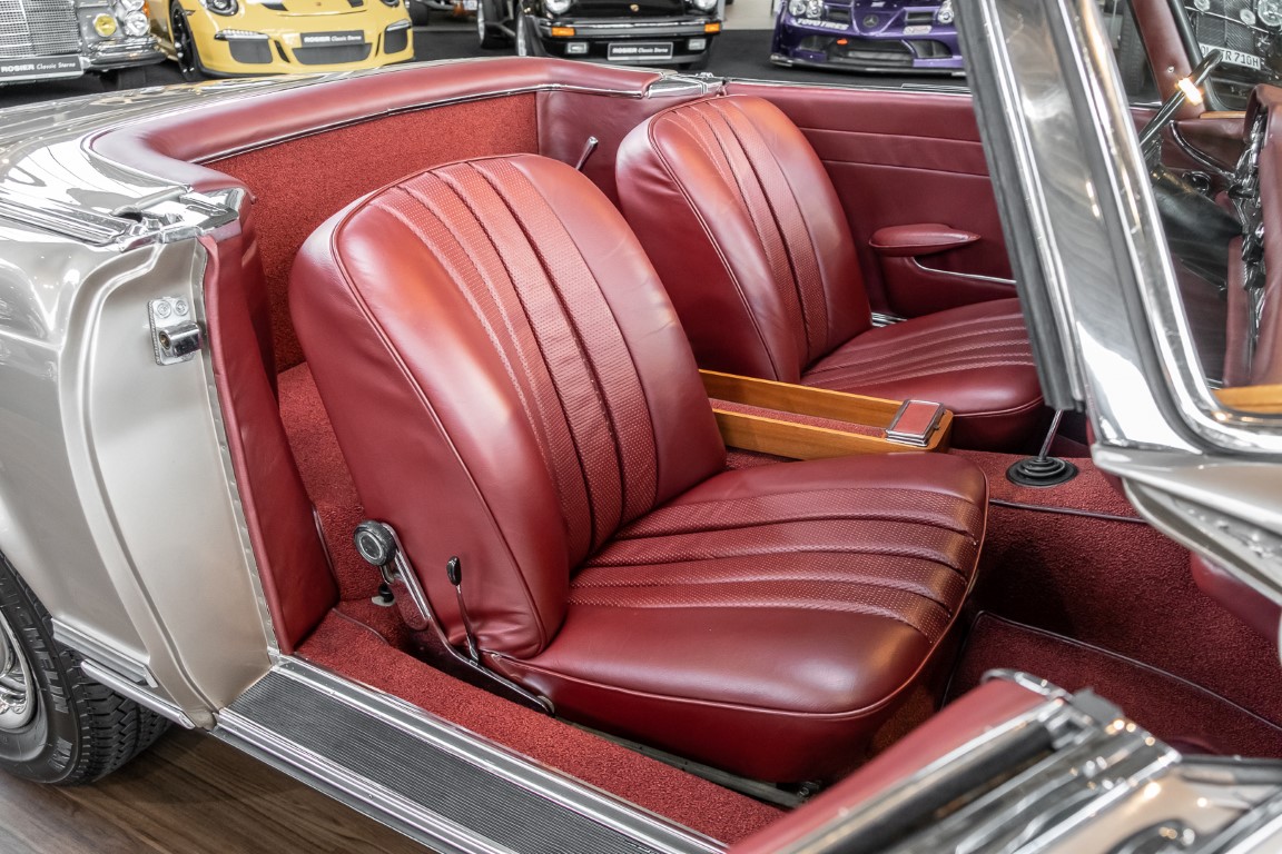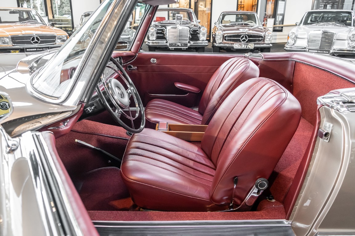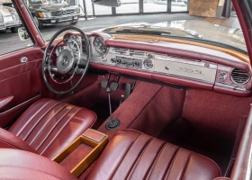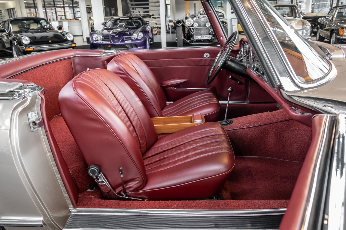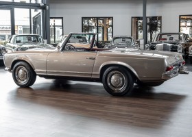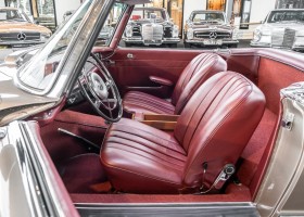 Hier wurde der Wagen einer kompletten Restaurierung unterzogen: die Karosserie wurde komplett entlackt und erhielt einen neuen Lackaufbau im wundervoll passenden Farbton Beigegrau Metallic (DB 728). Der Motor, das Getriebe und die Achsen wurden überholt. Alle Nebenaggregate wurden revidiert und erneuert, wo es nötig war. Eine neue Innenausstattung im Farbton Bordeaux und ein neues Stoffverdeck in Mercedes Qualität wurden verbaut. Eine Servolenkung und Colorglas wurden nachgerüstet. In unserer Manufaktur musste sich das Fahrzeug anschließend noch einmal den strengen Blicken unserer Spezialisten unterziehen, die am Unterboden des Fahrzeuges noch einmal Hand anlagen, um den letzten Schliff zu geben.