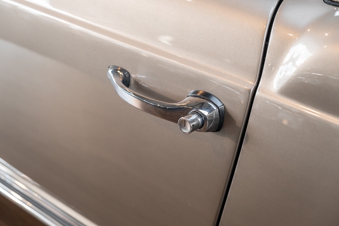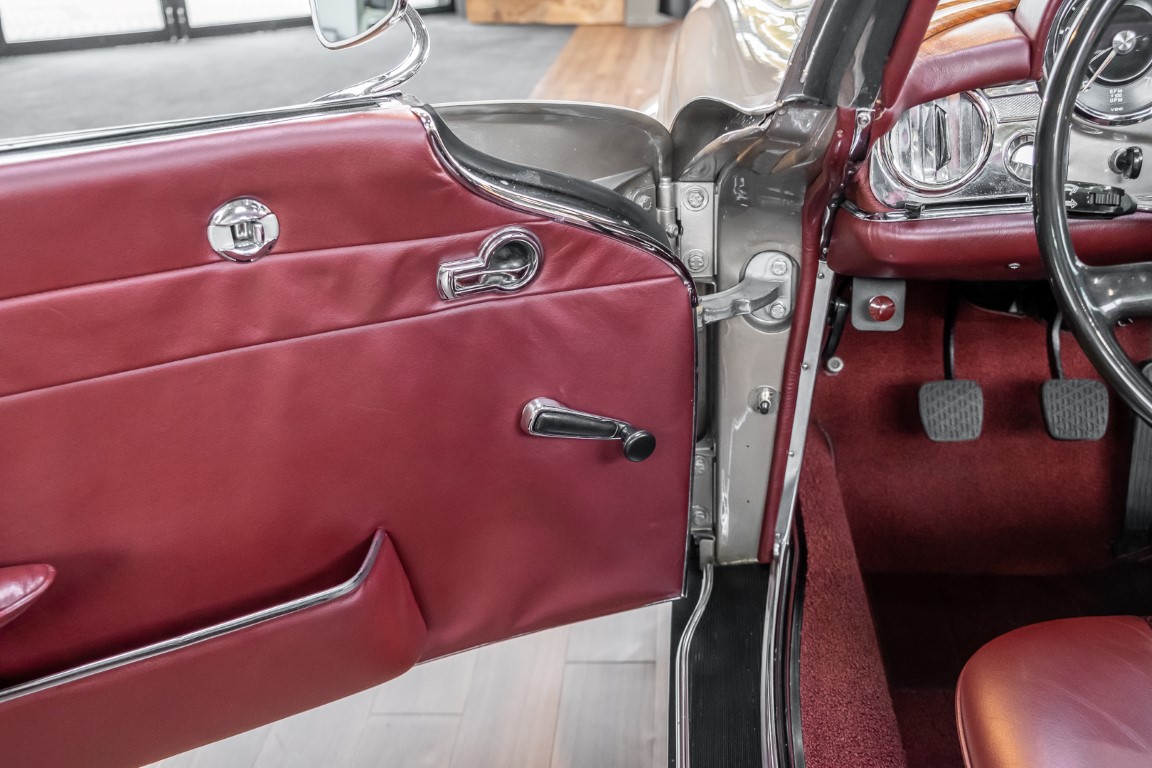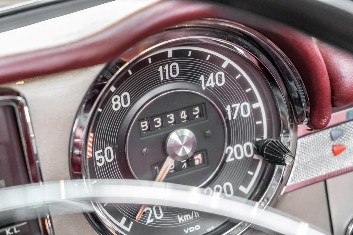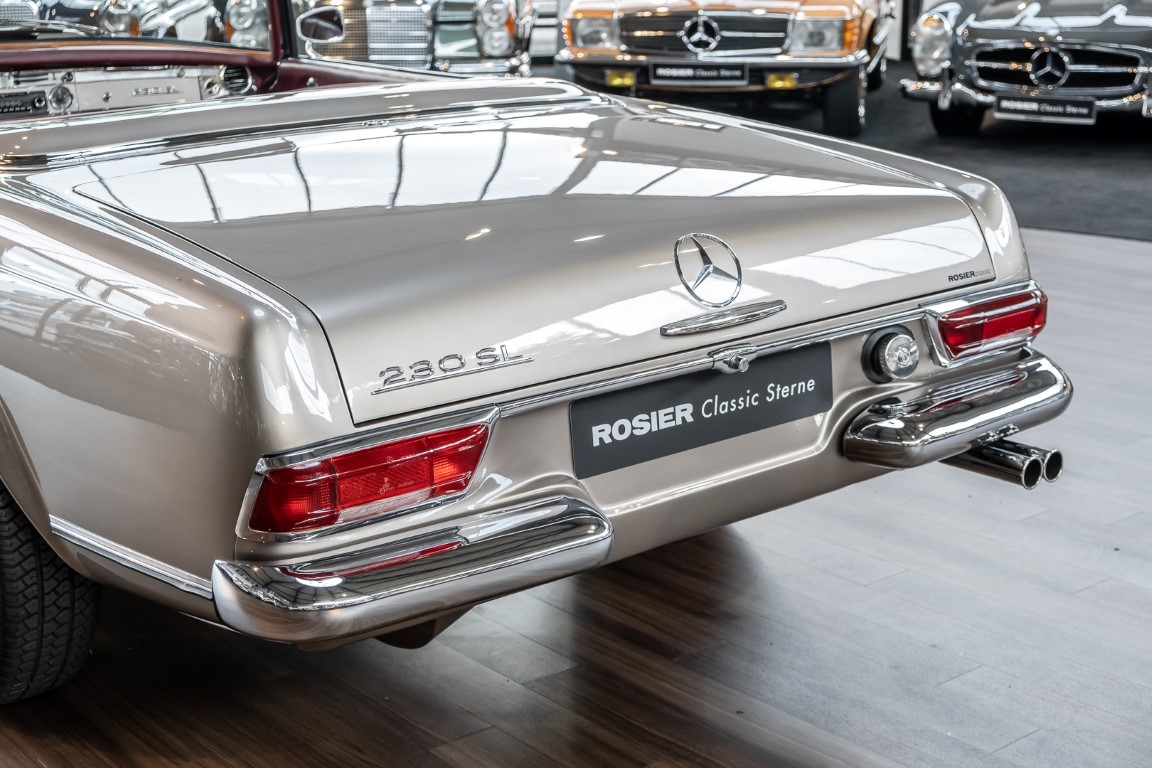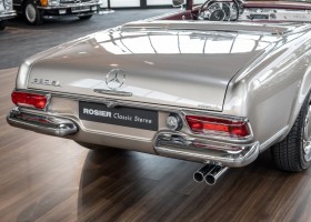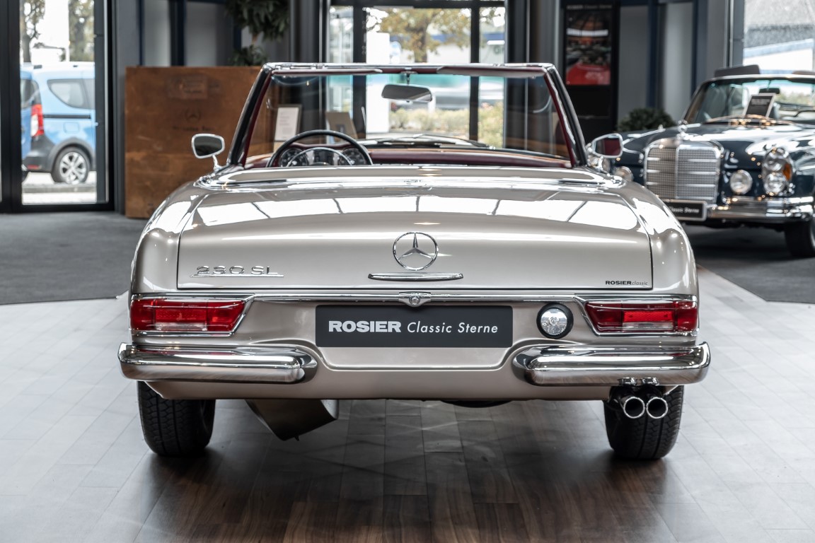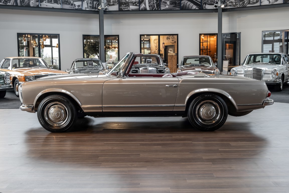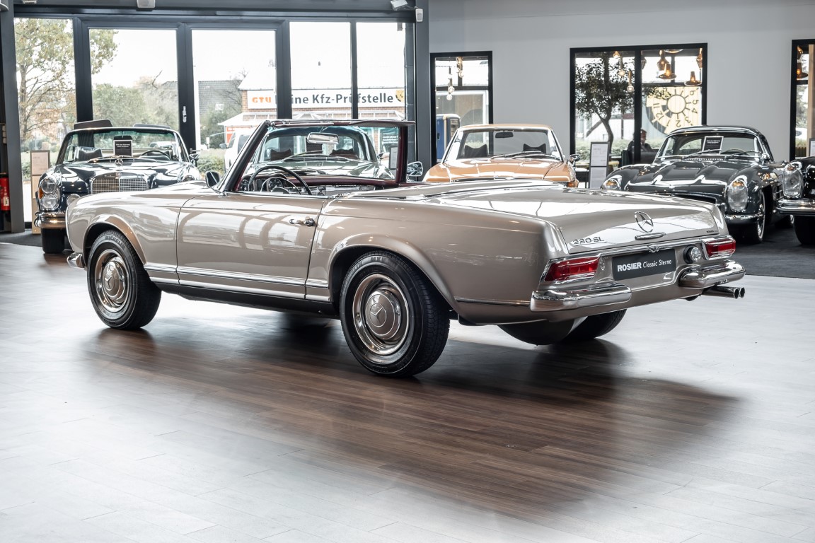 Hier wurde der Wagen einer kompletten Restaurierung unterzogen: die Karosserie wurde komplett entlackt und erhielt einen neuen Lackaufbau im wundervoll passenden Farbton Beigegrau Metallic (DB 728). Der Motor, das Getriebe und die Achsen wurden überholt. Alle Nebenaggregate wurden revidiert und erneuert, wo es nötig war. Eine neue Innenausstattung im Farbton Bordeaux und ein neues Stoffverdeck in Mercedes Qualität wurden verbaut. Eine Servolenkung und Colorglas wurden nachgerüstet. In unserer Manufaktur musste sich das Fahrzeug anschließend noch einmal den strengen Blicken unserer Spezialisten unterziehen, die am Unterboden des Fahrzeuges noch einmal Hand anlagen, um den letzten Schliff zu geben.