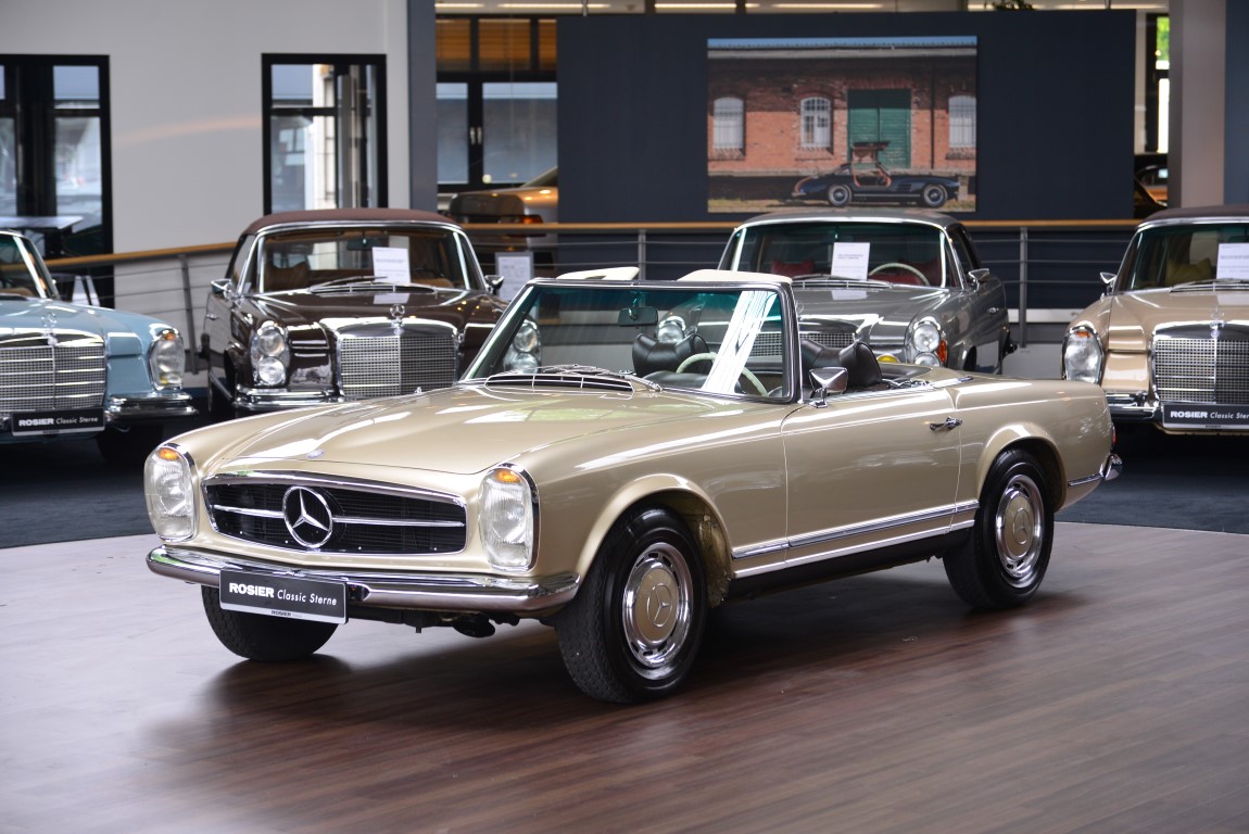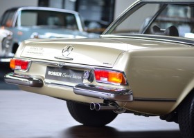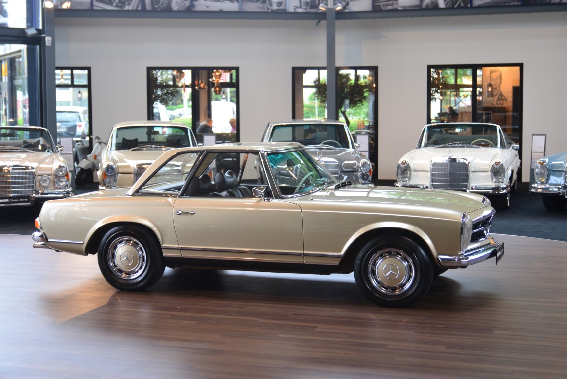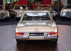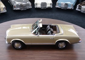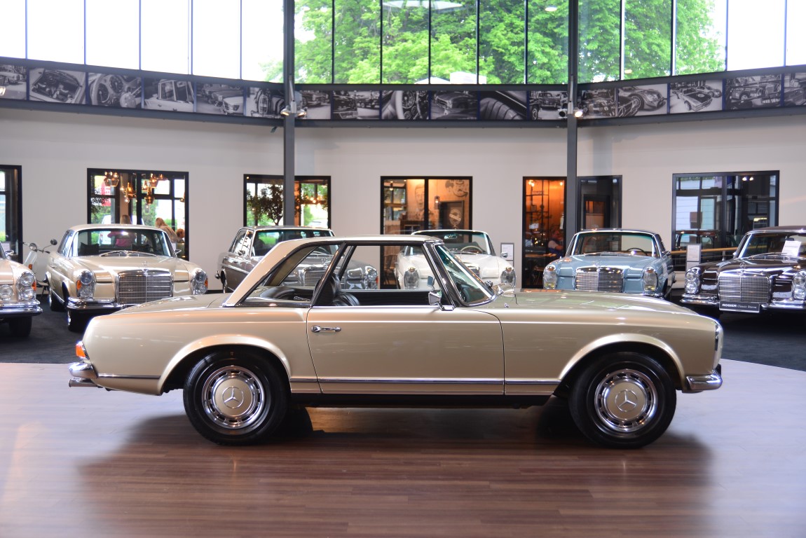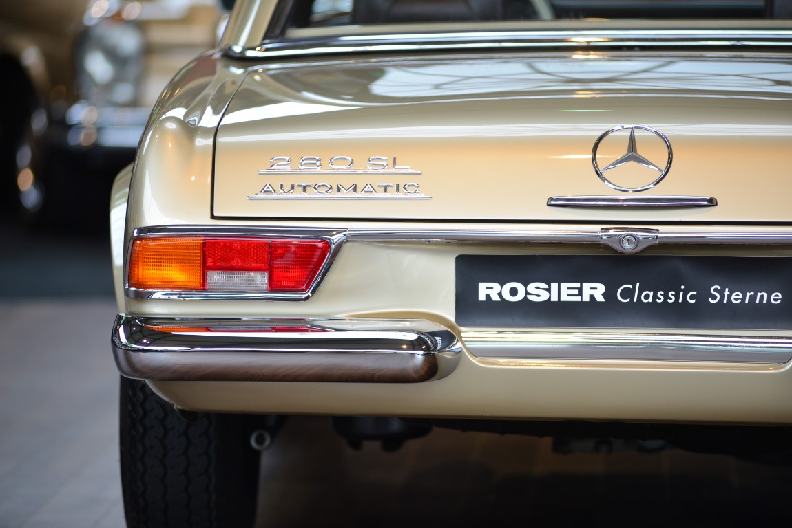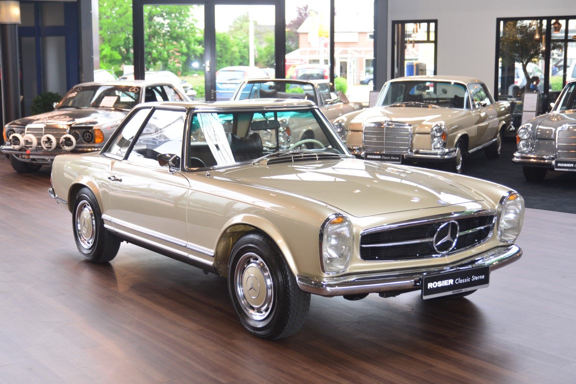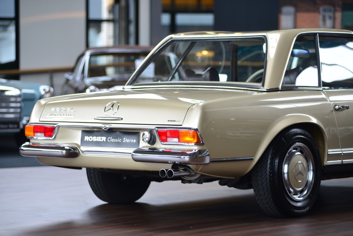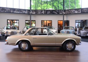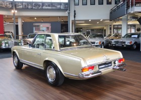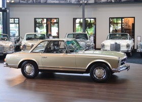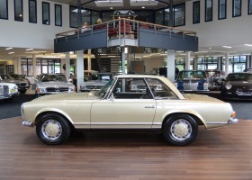 Dieser Mercedes-Benz 280SL Roadster aus der so beliebten Serie W113 wurde am 18.04.1968 an ein alteingesessenes Möbelhaus in Hamburg geliefert. Die Wartung wurde meist bei Mercedes-Benz in Hamburg gemacht, wie es noch vorhandene Rechnungskopien belegen. Ein neues Werks-Getriebe wurde in 1981 verbaut, was der originale Aggregate-Pass belegt. Der Wagen blieb dort bis er in 2007 an einen Hotelier in Belgien verkauft wurde. Der Mercedes-Benz Partner in Mechelen sorgte all die Jahre für die bestmögliche Wartung und Erhaltung des Wagens. Der Hotelier behielt den Roadster bis 2014 in seinem Besitz. In 2014 kam die elegante Pagode in hervorragendem Zustand zu Mercedes-Benz Partner Autohaus Rosier in der Ammerländer Heerstraße in Oldenburg. Eine umfangreiche Inspektion wurde durchgeführt, der Wagen wurde in Bestzustand versetzt. Die Lederausstattung wurde durch die für beste Lederarbeiten bekannte Autosattlerei Mönnich in Oldenburg originalgetreu erneuert. Ein Liebhaber klassischer Mercedes-Benz Fahrzeuge hatte großen Gefallen an dem Wagen gefunden und ihn für seine Sammlung erworben. Zur Erhaltung des Wagens und Vermeidung von Standschäden wurde die Pagode ab und an, nur bei gutem Wetter, für Fahrten eingesetzt. Nachdem nun die Sammlung etwas verkleintwerden soll, freuen wir uns, Ihnen diese herrliche Pagode wieder anbieten zu dürfen. Alles funktioniert, keinerlei Wartungsstau, fertig zum Einsatz auch auf langen Strecken.