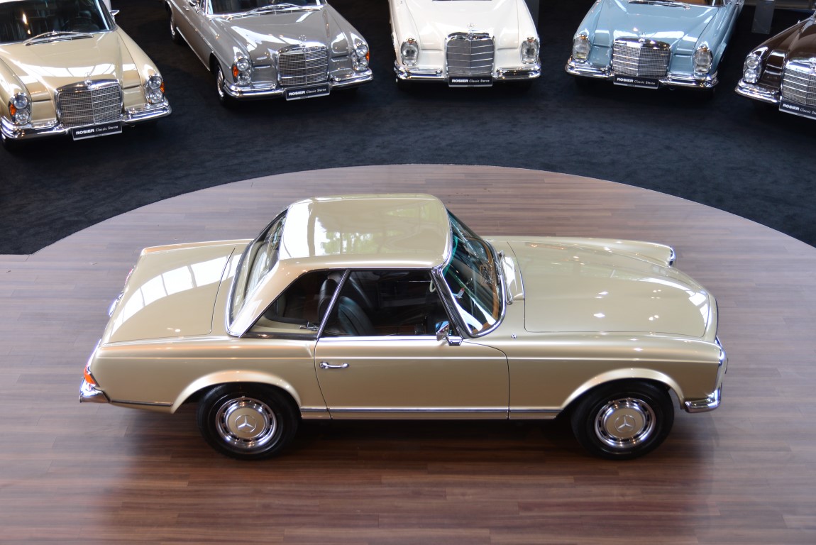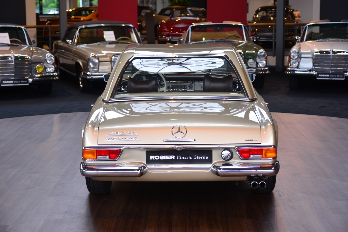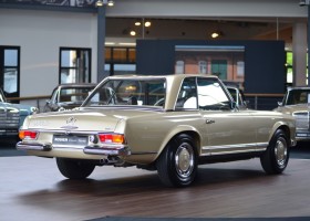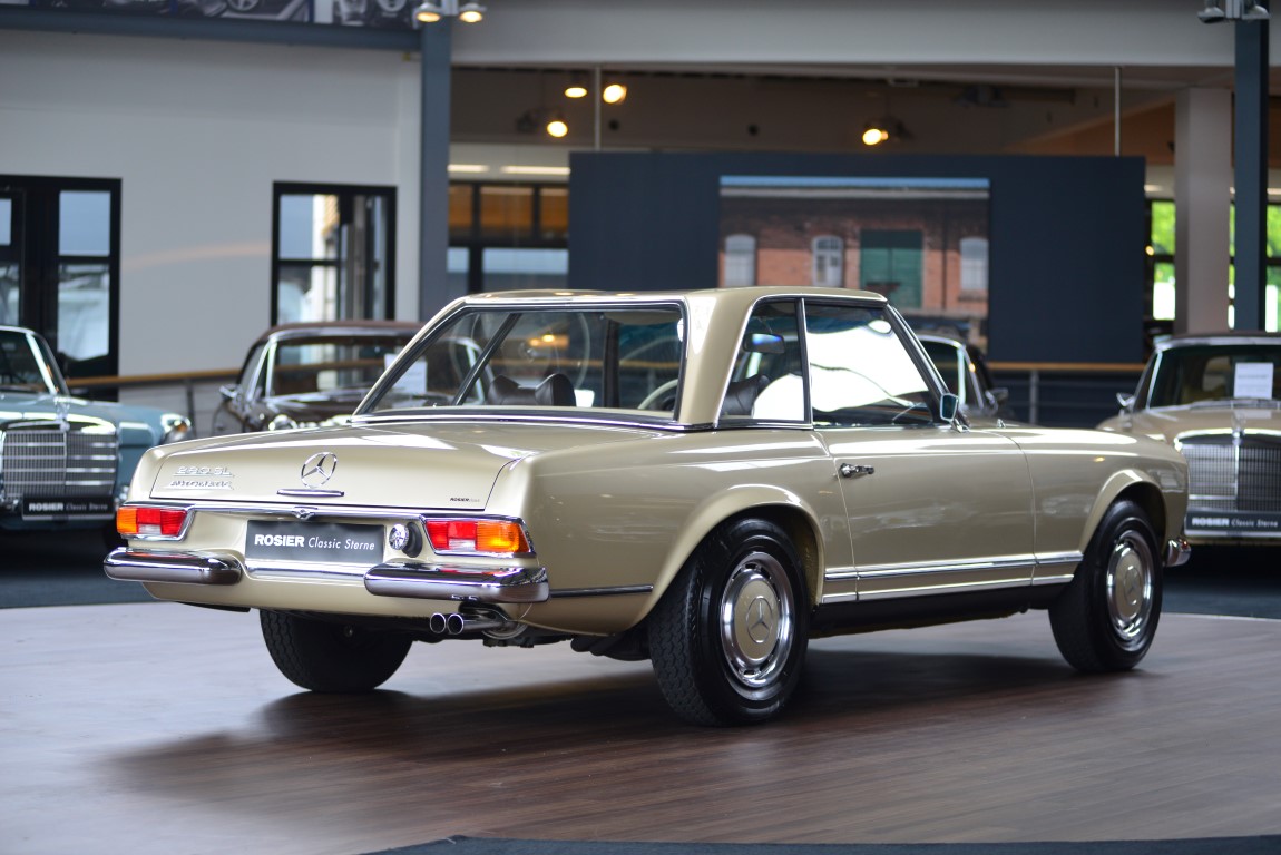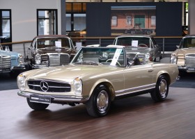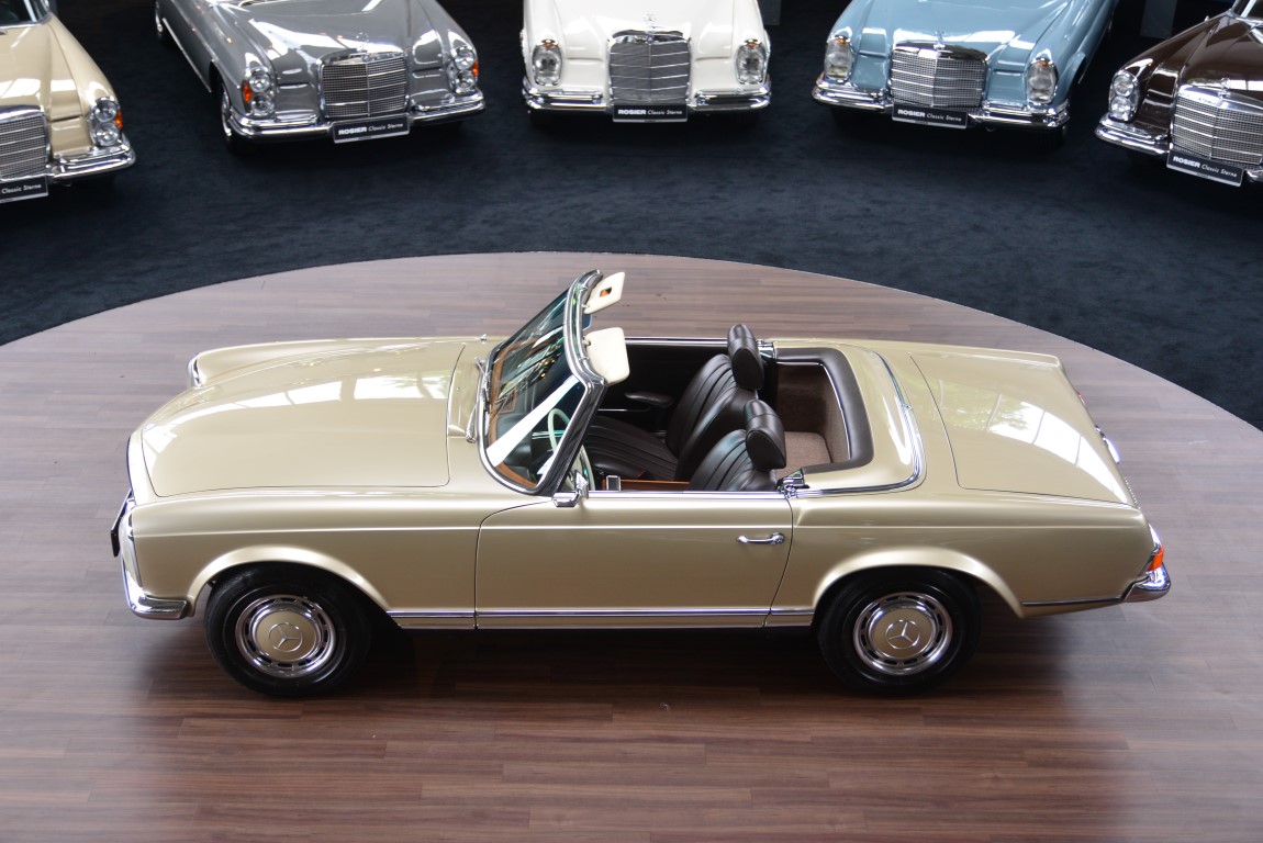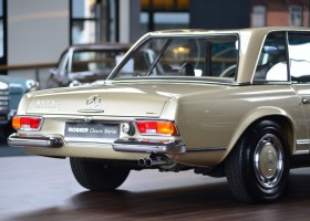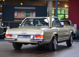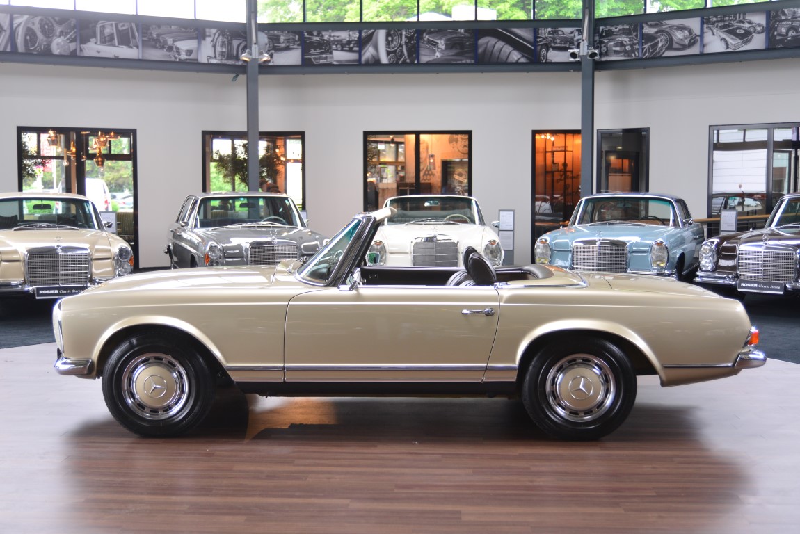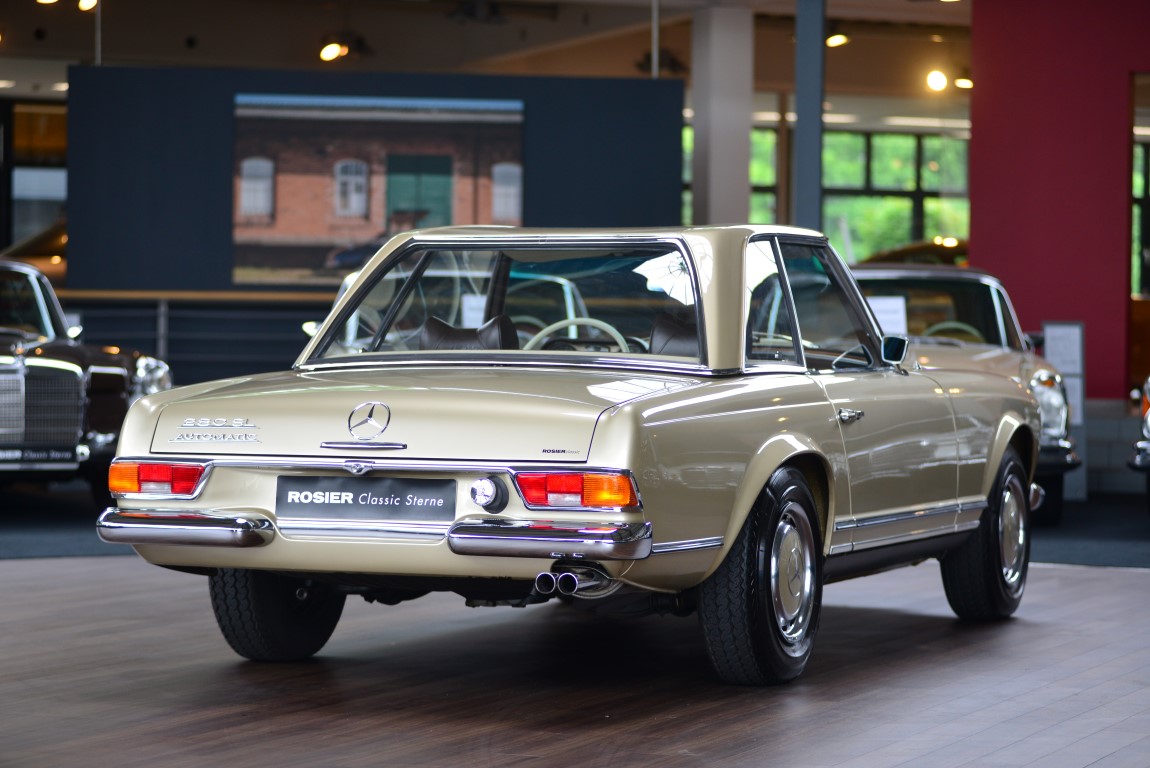 Dieser Mercedes-Benz 280SL Roadster aus der so beliebten Serie W113 wurde am 18.04.1968 an ein alteingesessenes Möbelhaus in Hamburg geliefert. Die Wartung wurde meist bei Mercedes-Benz in Hamburg gemacht, wie es noch vorhandene Rechnungskopien belegen. Ein neues Werks-Getriebe wurde in 1981 verbaut, was der originale Aggregate-Pass belegt. Der Wagen blieb dort bis er in 2007 an einen Hotelier in Belgien verkauft wurde. Der Mercedes-Benz Partner in Mechelen sorgte all die Jahre für die bestmögliche Wartung und Erhaltung des Wagens. Der Hotelier behielt den Roadster bis 2014 in seinem Besitz. In 2014 kam die elegante Pagode in hervorragendem Zustand zu Mercedes-Benz Partner Autohaus Rosier in der Ammerländer Heerstraße in Oldenburg. Eine umfangreiche Inspektion wurde durchgeführt, der Wagen wurde in Bestzustand versetzt. Die Lederausstattung wurde durch die für beste Lederarbeiten bekannte Autosattlerei Mönnich in Oldenburg originalgetreu erneuert. Ein Liebhaber klassischer Mercedes-Benz Fahrzeuge hatte großen Gefallen an dem Wagen gefunden und ihn für seine Sammlung erworben. Zur Erhaltung des Wagens und Vermeidung von Standschäden wurde die Pagode ab und an, nur bei gutem Wetter, für Fahrten eingesetzt. Nachdem nun die Sammlung etwas verkleintwerden soll, freuen wir uns, Ihnen diese herrliche Pagode wieder anbieten zu dürfen. Alles funktioniert, keinerlei Wartungsstau, fertig zum Einsatz auch auf langen Strecken.