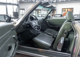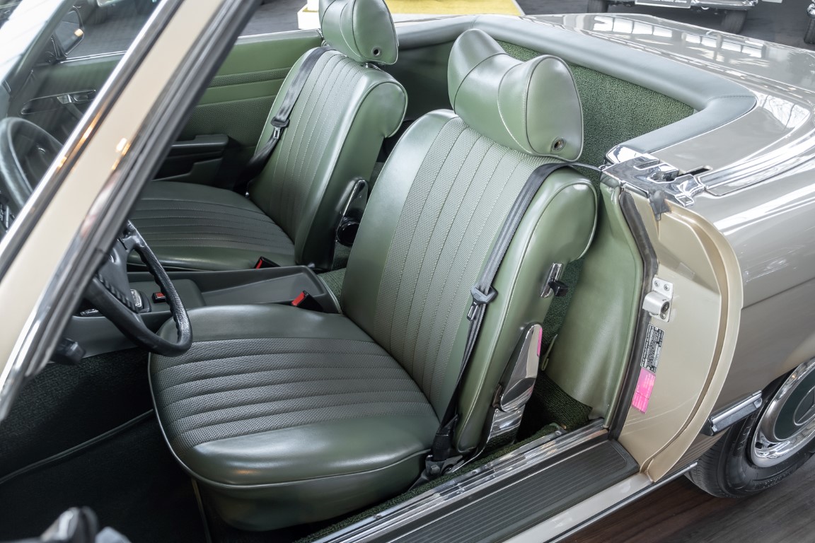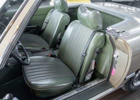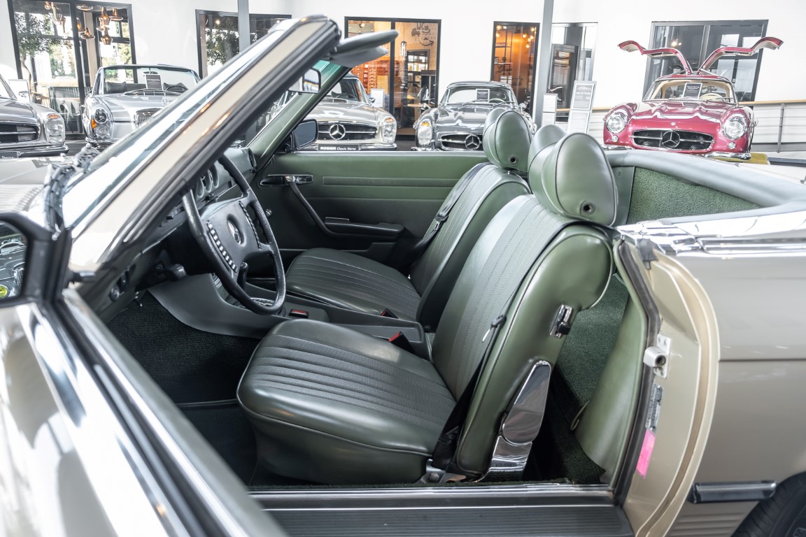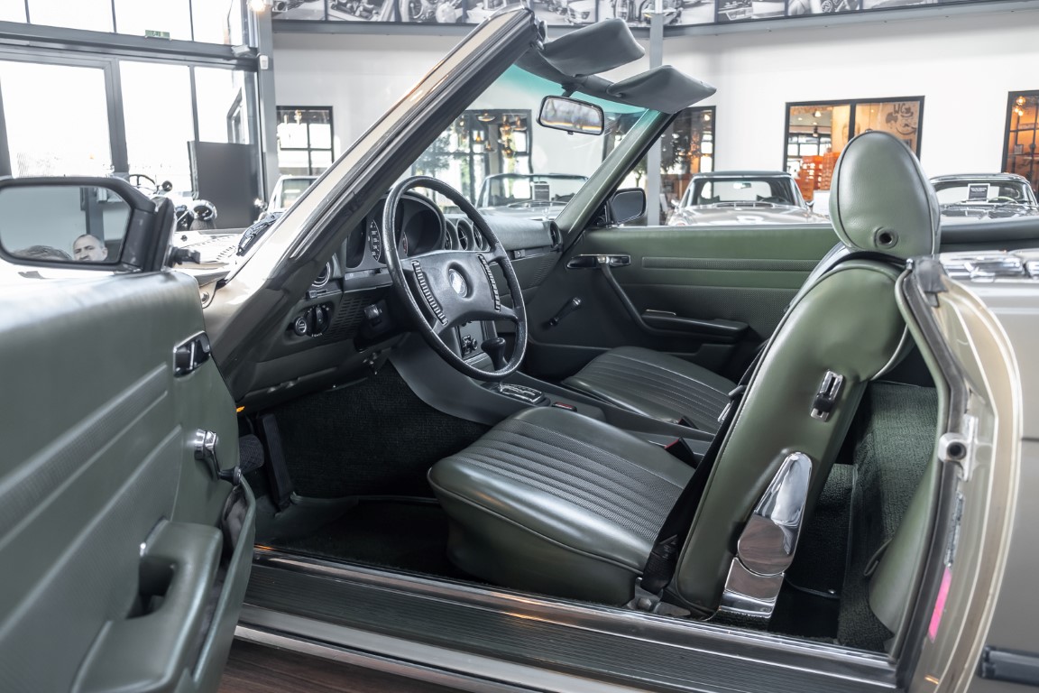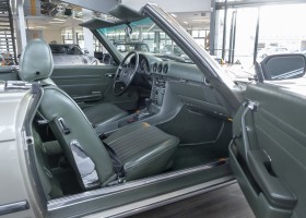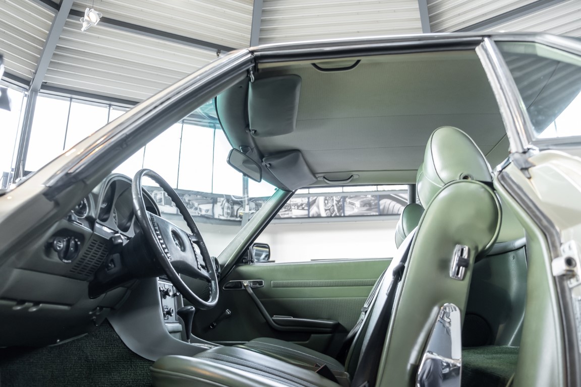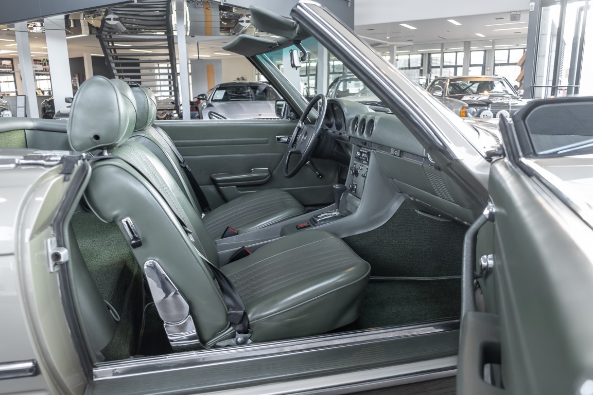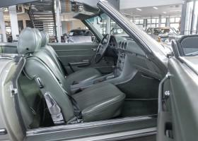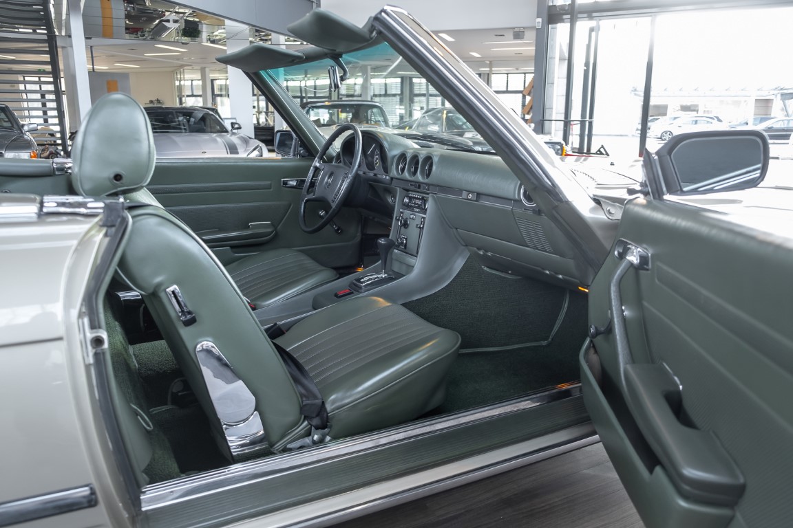 Die Serienproduktion des Mercedes-Benz 350SL Roadsters begann im April 1971 im Werk Sindelfingen. Der hier  angebotene Roadster wurde am 25. Oktober 1971 fertiggestellt und in die USA geliefert. Es handelt sich somit um ein ganz frühes Modell und ist für Sammler höchst interessant. Er wurde im Januar 1972 auf den Erstbesitzer zugelassen und verblieb all die Jahre in den USA. Aus der ländlichen ca. 7.000 Einwohner-Gemeinde Sutherlin in Oregon/USA, nur etwa 1 Stunde entfernt von der Winchester Bay am Nord Pacific wurde das Fahrzeug nach Deutschland eingeführt. Der Zustand des Wagens ist sehr original, die unverwüstliche MB-Tex Ausstattung in Olivgrün (166) befindet sich bis heute in einem sehr guten Zustand, die Lackierung wurde offensichtlich vor Jahren erneuert. Der Gesamtzustand des Wagens ist  höchst erfreulich, der Unterboden wurde Trockeneisgestrahlt und befindet sich in sauberem und ordentlichen Zustand. Der Motor läuft kraftvoll und weich, das Getriebe wurde erst kürzlich von unseren Spezialisten überholt und schaltet wie man es von einem Mercedes erwartet. Ein rundum toller 107er, der mit seinem starken V8 Motor und einer besonders  stilsicheren Farbkombination zu überzeugen weiß. Steigen Sie ein und erfahren Sie es selbst.
