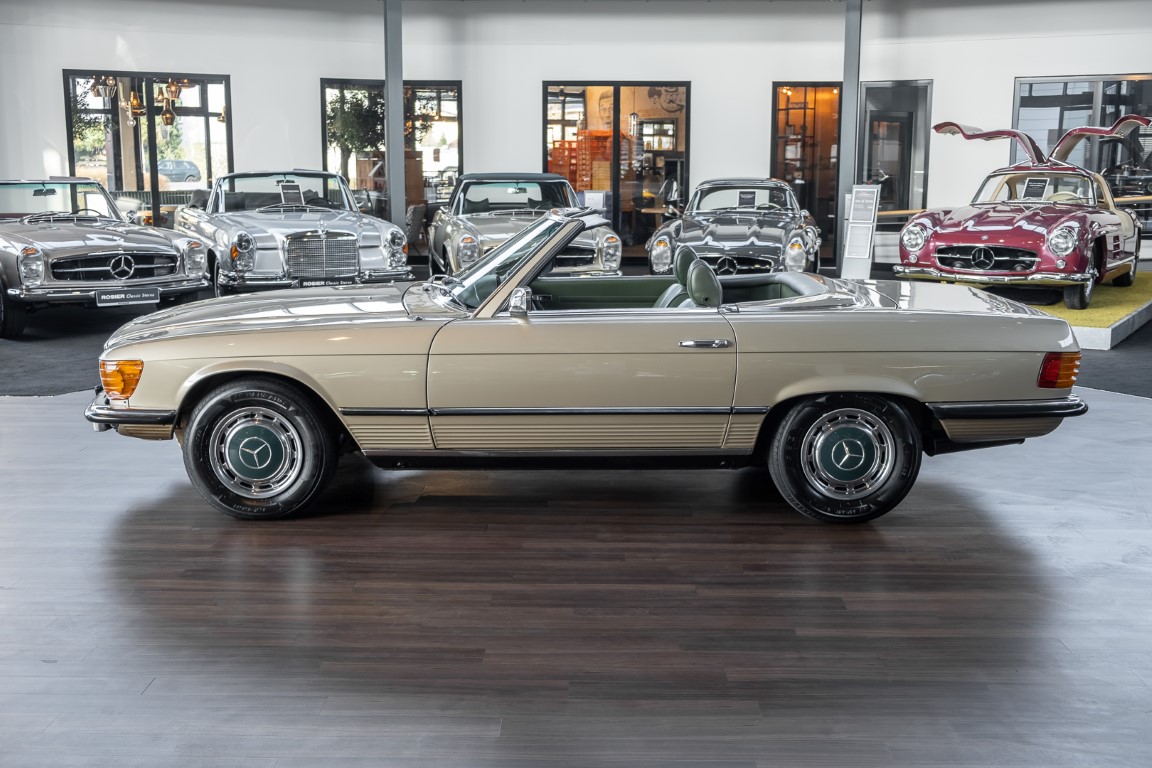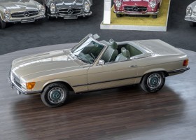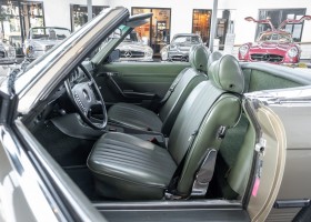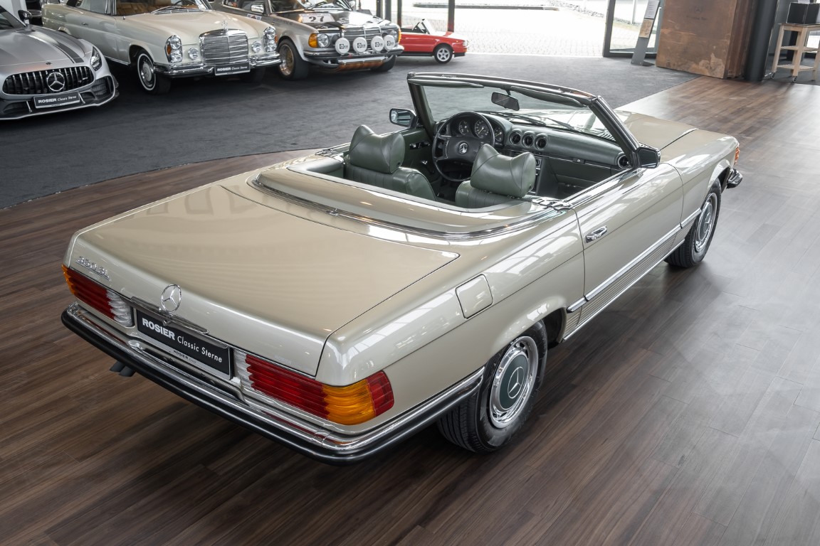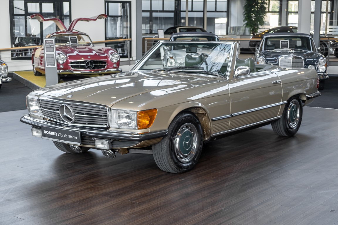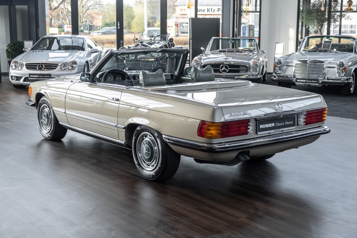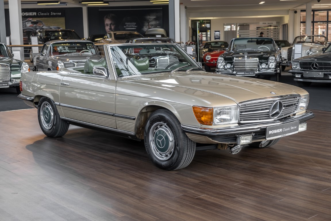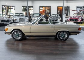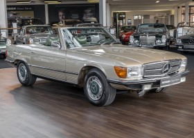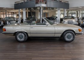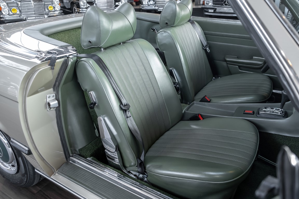 Die Serienproduktion des Mercedes-Benz 350SL Roadsters begann im April 1971 im Werk Sindelfingen. Der hier  angebotene Roadster wurde am 25. Oktober 1971 fertiggestellt und in die USA geliefert. Es handelt sich somit um ein ganz frühes Modell und ist für Sammler höchst interessant. Er wurde im Januar 1972 auf den Erstbesitzer zugelassen und verblieb all die Jahre in den USA. Aus der ländlichen ca. 7.000 Einwohner-Gemeinde Sutherlin in Oregon/USA, nur etwa 1 Stunde entfernt von der Winchester Bay am Nord Pacific wurde das Fahrzeug nach Deutschland eingeführt. Der Zustand des Wagens ist sehr original, die unverwüstliche MB-Tex Ausstattung in Olivgrün (166) befindet sich bis heute in einem sehr guten Zustand, die Lackierung wurde offensichtlich vor Jahren erneuert. Der Gesamtzustand des Wagens ist  höchst erfreulich, der Unterboden wurde Trockeneisgestrahlt und befindet sich in sauberem und ordentlichen Zustand. Der Motor läuft kraftvoll und weich, das Getriebe wurde erst kürzlich von unseren Spezialisten überholt und schaltet wie man es von einem Mercedes erwartet. Ein rundum toller 107er, der mit seinem starken V8 Motor und einer besonders  stilsicheren Farbkombination zu überzeugen weiß. Steigen Sie ein und erfahren Sie es selbst.