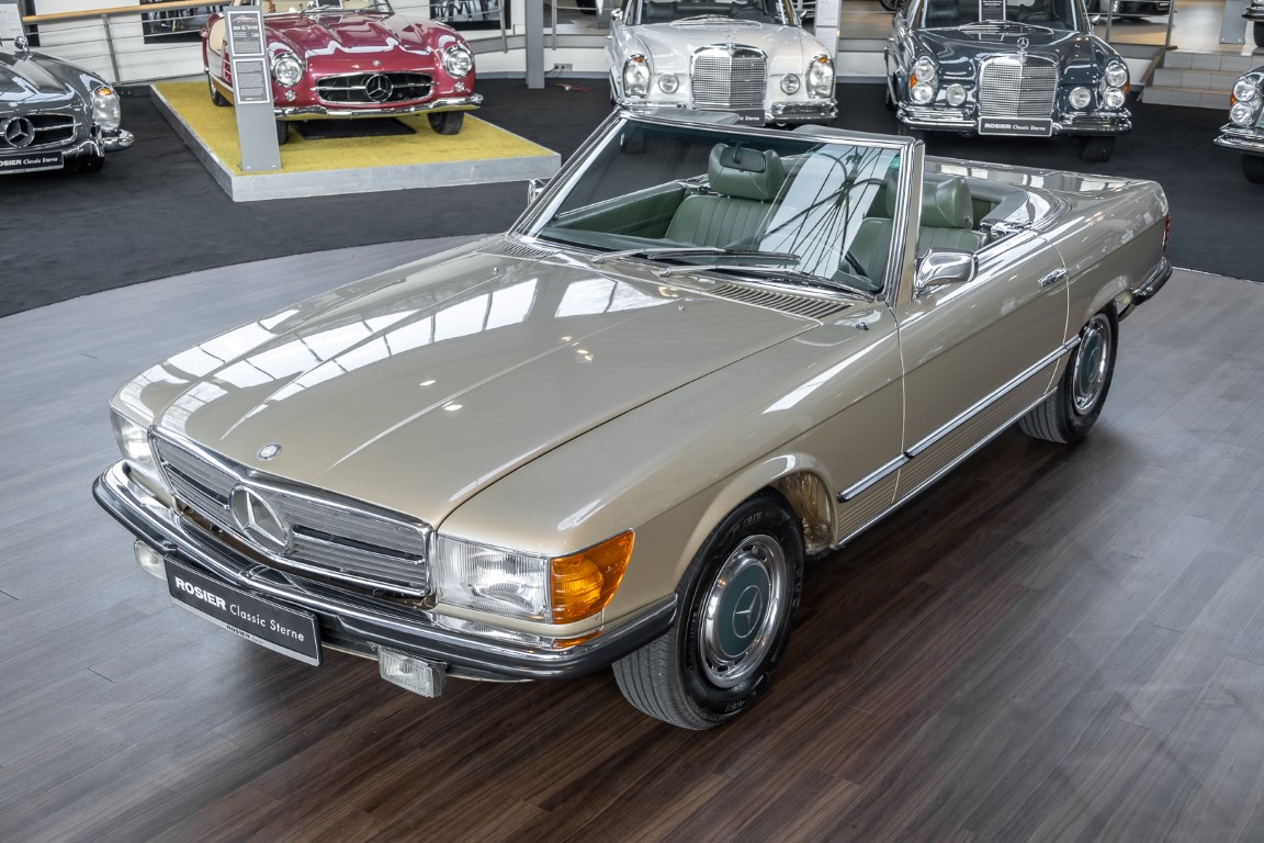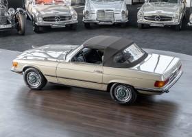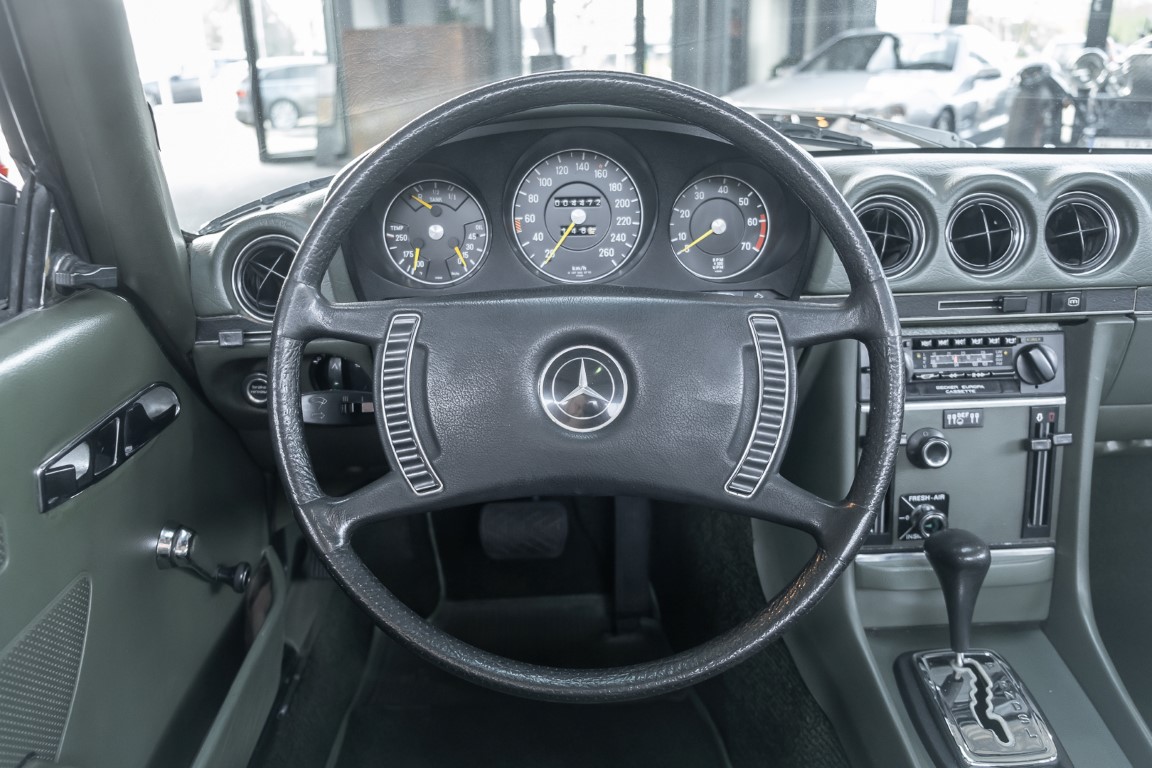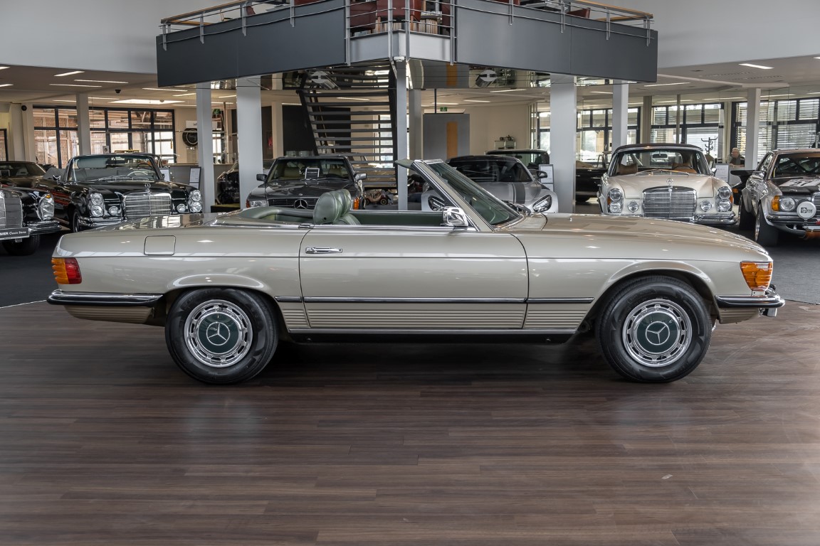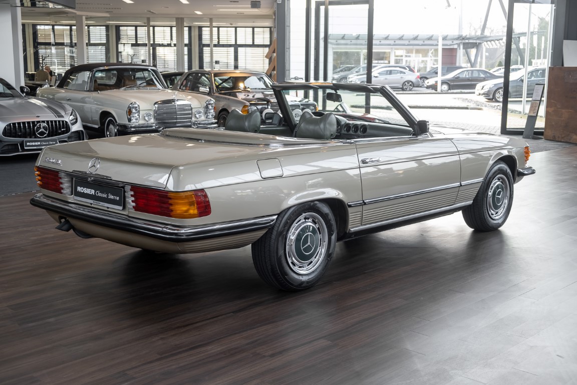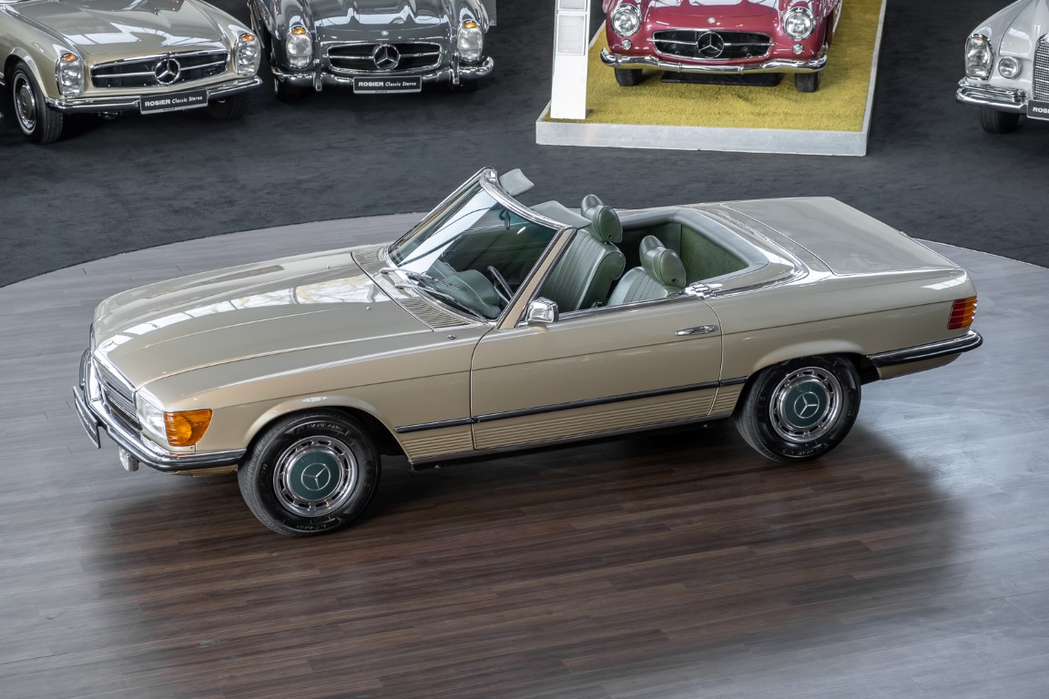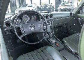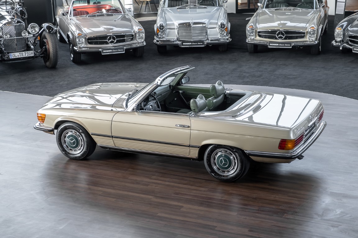 Die Serienproduktion des Mercedes-Benz 350SL Roadsters begann im April 1971 im Werk Sindelfingen. Der hier  angebotene Roadster wurde am 25. Oktober 1971 fertiggestellt und in die USA geliefert. Es handelt sich somit um ein ganz frühes Modell und ist für Sammler höchst interessant. Er wurde im Januar 1972 auf den Erstbesitzer zugelassen und verblieb all die Jahre in den USA. Aus der ländlichen ca. 7.000 Einwohner-Gemeinde Sutherlin in Oregon/USA, nur etwa 1 Stunde entfernt von der Winchester Bay am Nord Pacific wurde das Fahrzeug nach Deutschland eingeführt. Der Zustand des Wagens ist sehr original, die unverwüstliche MB-Tex Ausstattung in Olivgrün (166) befindet sich bis heute in einem sehr guten Zustand, die Lackierung wurde offensichtlich vor Jahren erneuert. Der Gesamtzustand des Wagens ist  höchst erfreulich, der Unterboden wurde Trockeneisgestrahlt und befindet sich in sauberem und ordentlichen Zustand. Der Motor läuft kraftvoll und weich, das Getriebe wurde erst kürzlich von unseren Spezialisten überholt und schaltet wie man es von einem Mercedes erwartet. Ein rundum toller 107er, der mit seinem starken V8 Motor und einer besonders  stilsicheren Farbkombination zu überzeugen weiß. Steigen Sie ein und erfahren Sie es selbst.