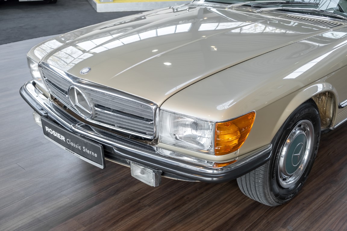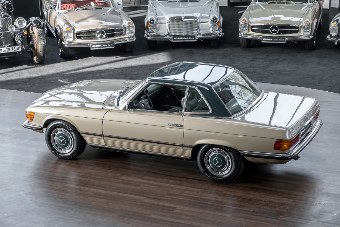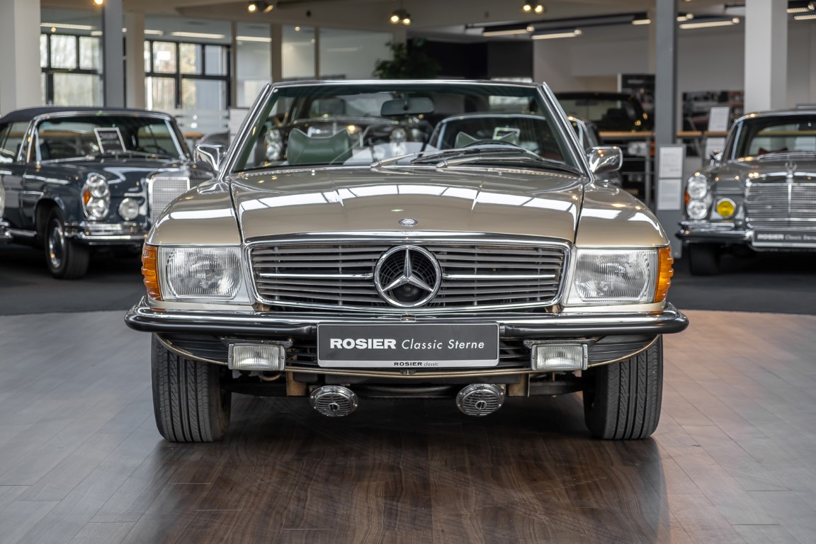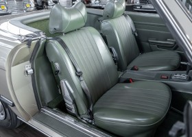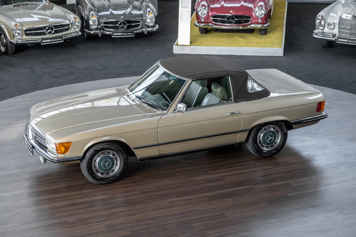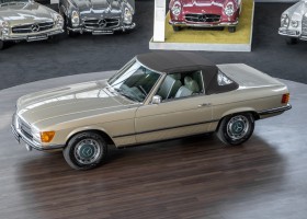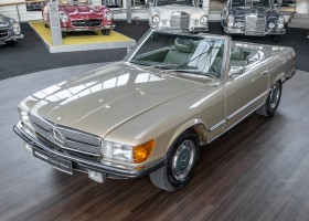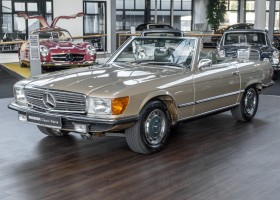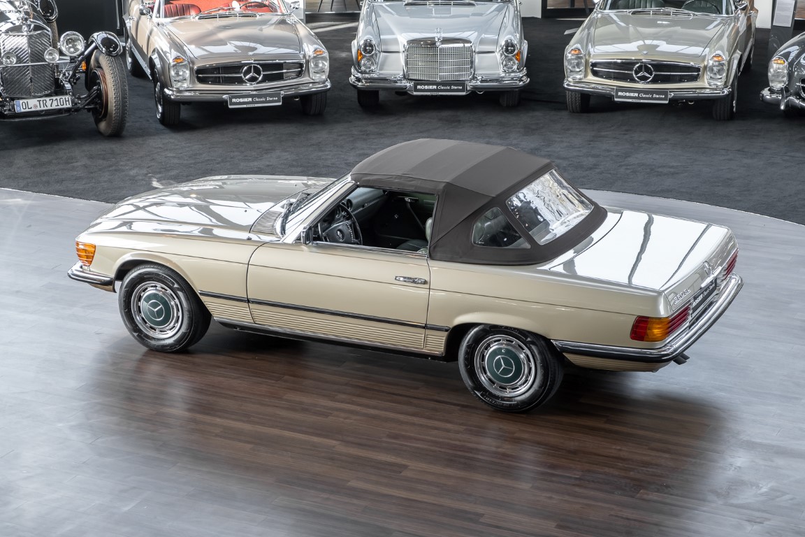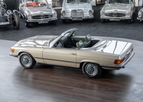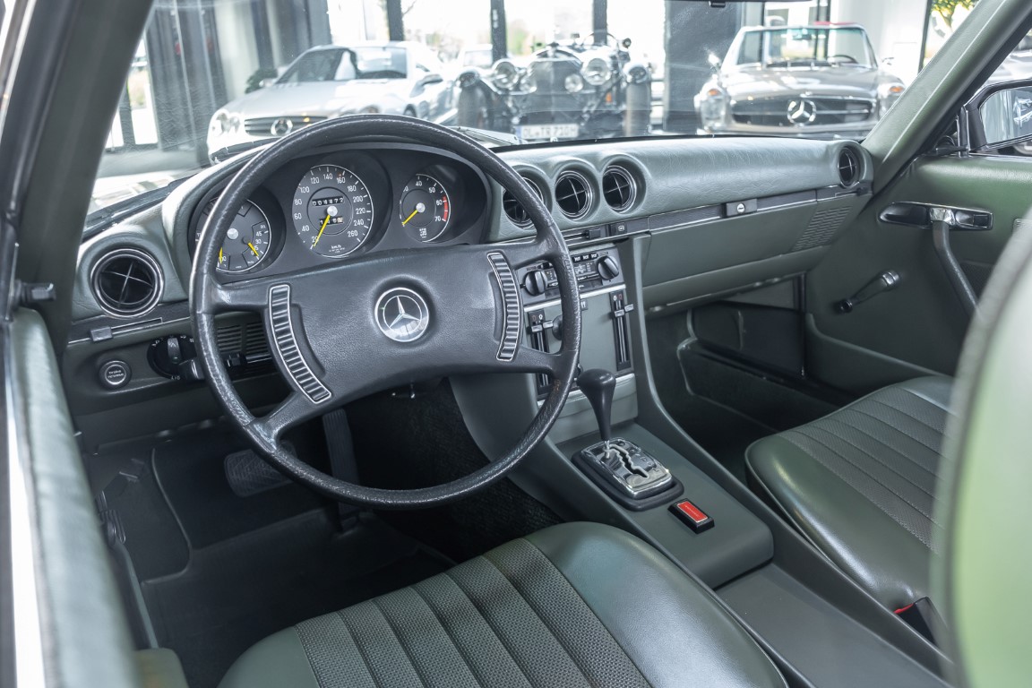 Die Serienproduktion des Mercedes-Benz 350SL Roadsters begann im April 1971 im Werk Sindelfingen. Der hier  angebotene Roadster wurde am 25. Oktober 1971 fertiggestellt und in die USA geliefert. Es handelt sich somit um ein ganz frühes Modell und ist für Sammler höchst interessant. Er wurde im Januar 1972 auf den Erstbesitzer zugelassen und verblieb all die Jahre in den USA. Aus der ländlichen ca. 7.000 Einwohner-Gemeinde Sutherlin in Oregon/USA, nur etwa 1 Stunde entfernt von der Winchester Bay am Nord Pacific wurde das Fahrzeug nach Deutschland eingeführt. Der Zustand des Wagens ist sehr original, die unverwüstliche MB-Tex Ausstattung in Olivgrün (166) befindet sich bis heute in einem sehr guten Zustand, die Lackierung wurde offensichtlich vor Jahren erneuert. Der Gesamtzustand des Wagens ist  höchst erfreulich, der Unterboden wurde Trockeneisgestrahlt und befindet sich in sauberem und ordentlichen Zustand. Der Motor läuft kraftvoll und weich, das Getriebe wurde erst kürzlich von unseren Spezialisten überholt und schaltet wie man es von einem Mercedes erwartet. Ein rundum toller 107er, der mit seinem starken V8 Motor und einer besonders  stilsicheren Farbkombination zu überzeugen weiß. Steigen Sie ein und erfahren Sie es selbst.