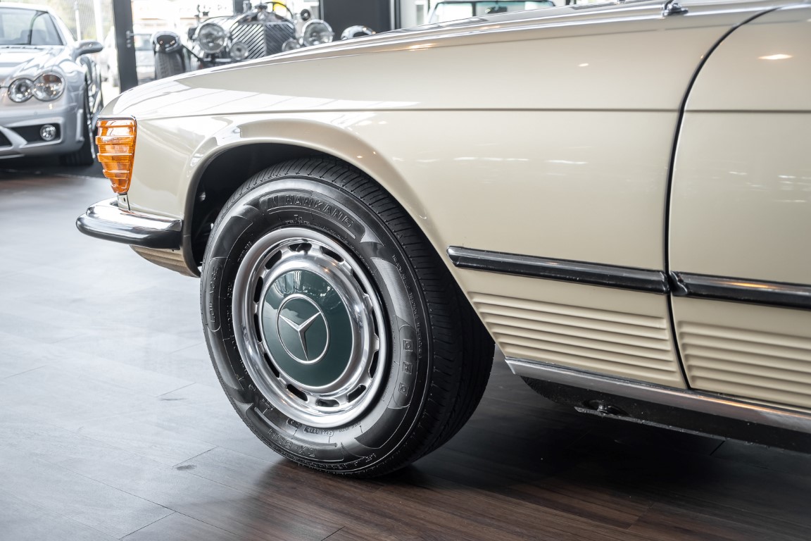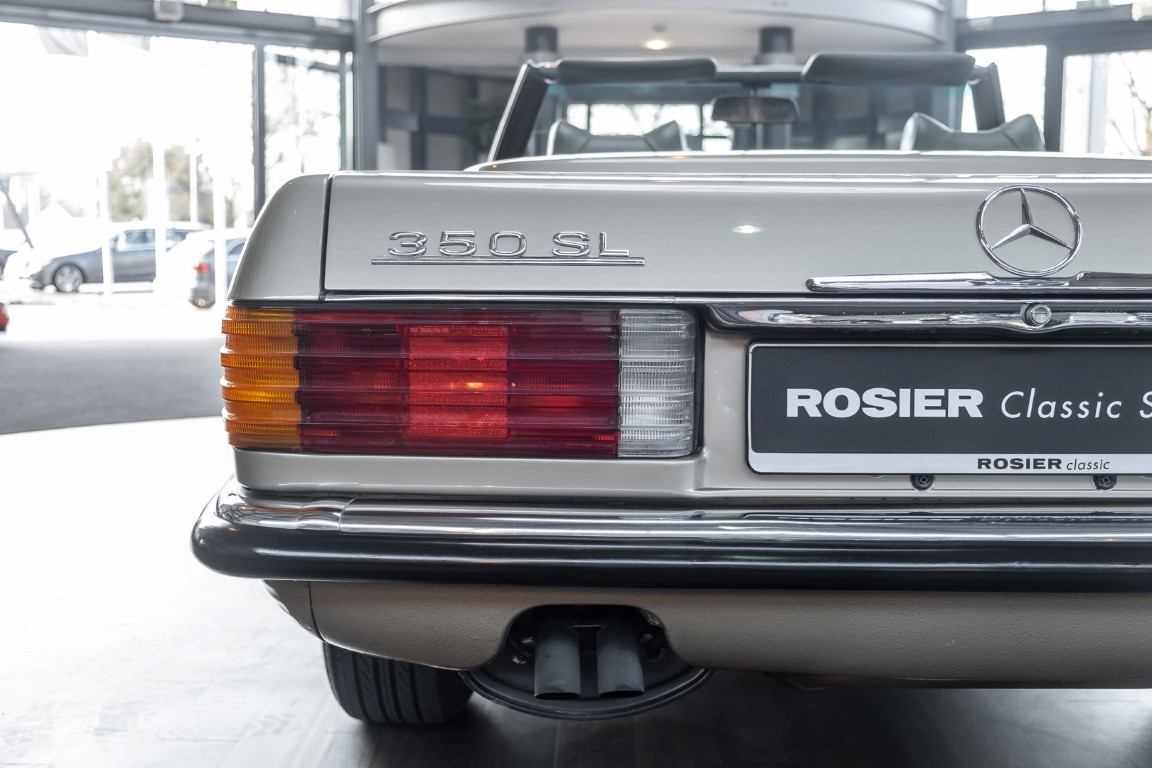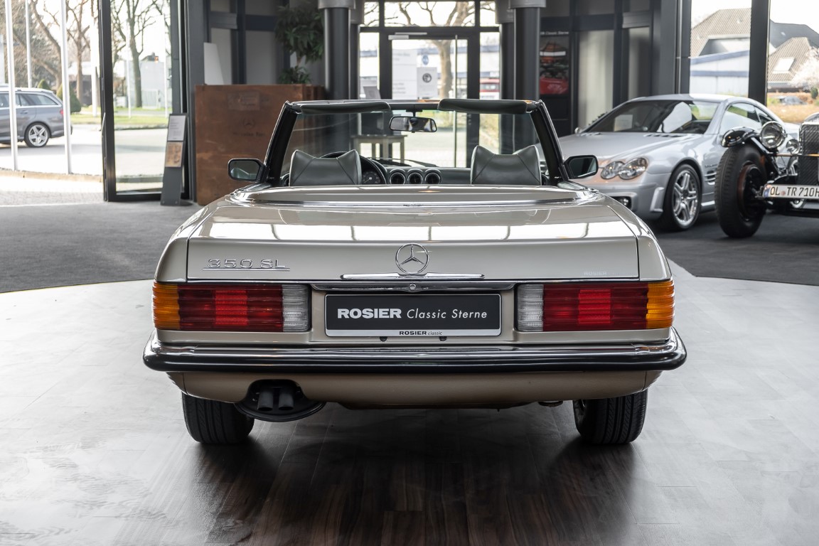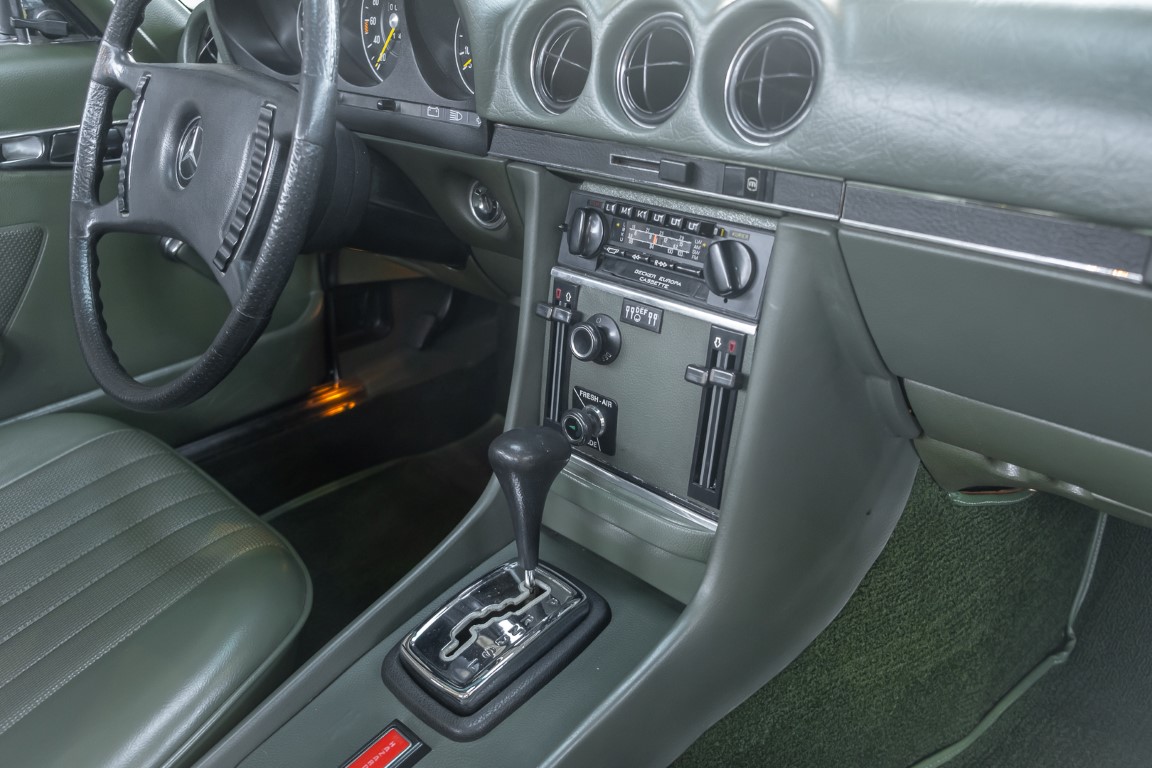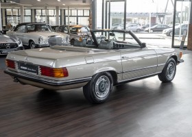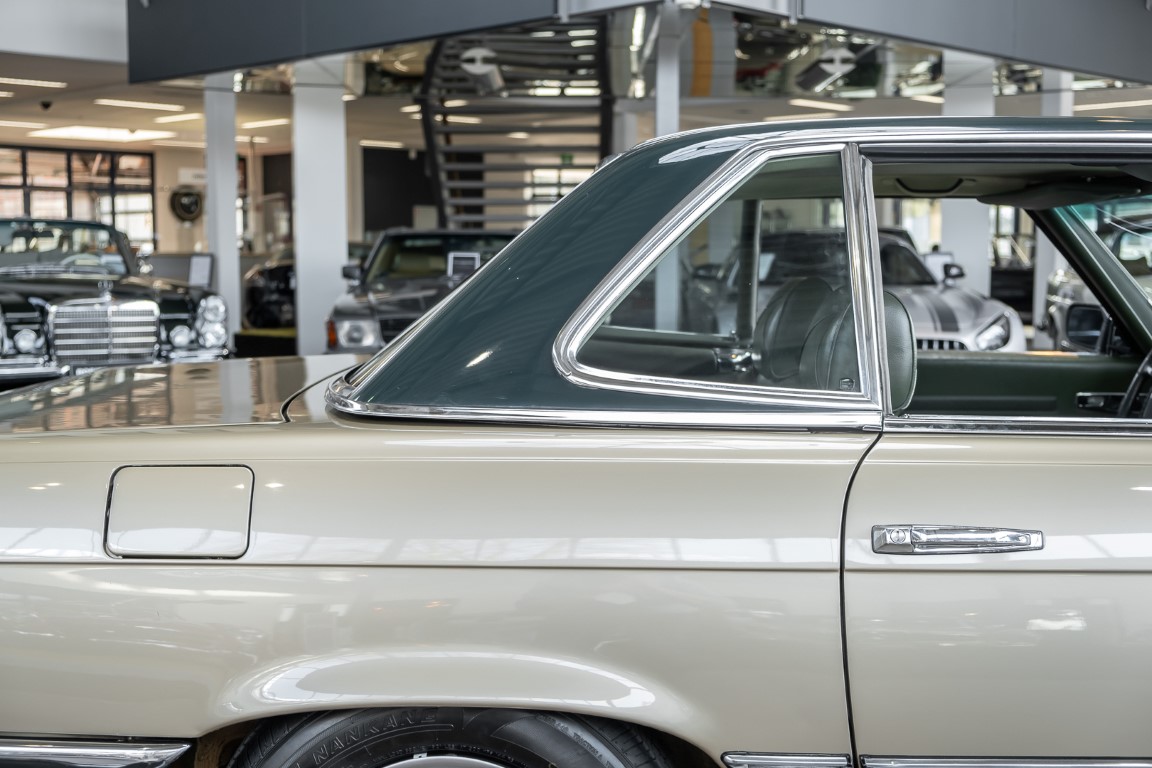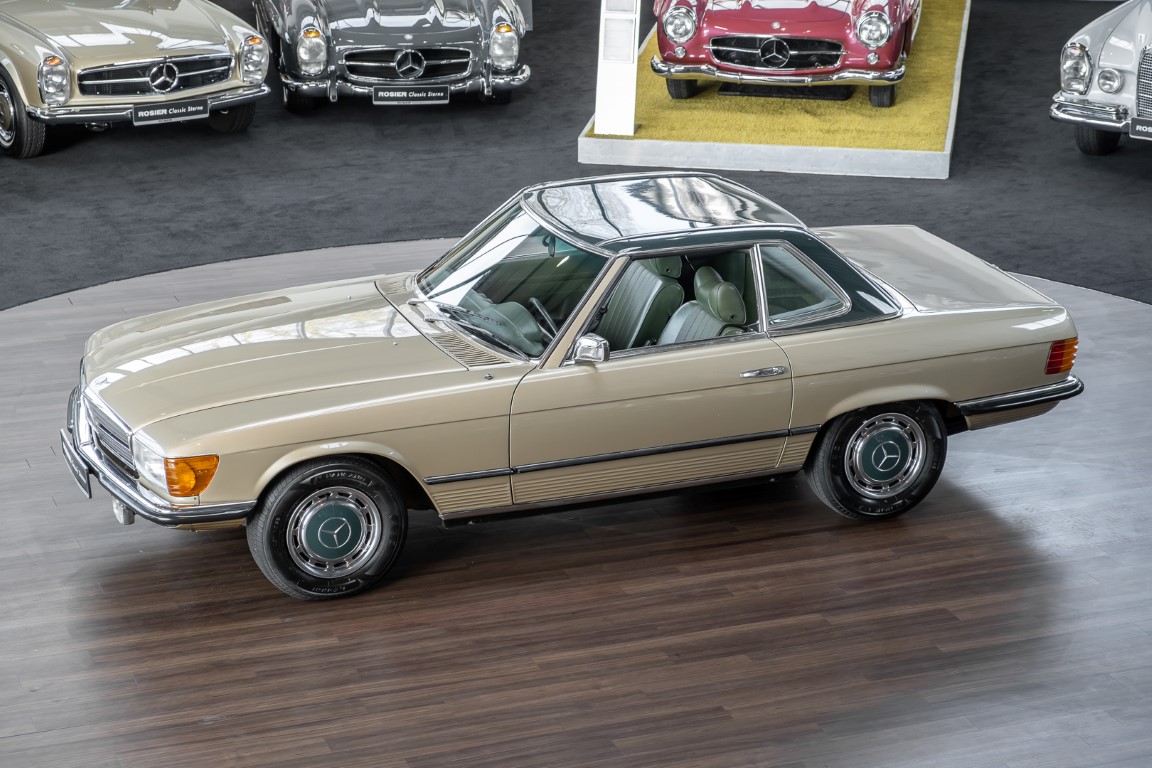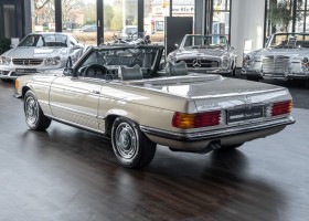 Die Serienproduktion des Mercedes-Benz 350SL Roadsters begann im April 1971 im Werk Sindelfingen. Der hier  angebotene Roadster wurde am 25. Oktober 1971 fertiggestellt und in die USA geliefert. Es handelt sich somit um ein ganz frühes Modell und ist für Sammler höchst interessant. Er wurde im Januar 1972 auf den Erstbesitzer zugelassen und verblieb all die Jahre in den USA. Aus der ländlichen ca. 7.000 Einwohner-Gemeinde Sutherlin in Oregon/USA, nur etwa 1 Stunde entfernt von der Winchester Bay am Nord Pacific wurde das Fahrzeug nach Deutschland eingeführt. Der Zustand des Wagens ist sehr original, die unverwüstliche MB-Tex Ausstattung in Olivgrün (166) befindet sich bis heute in einem sehr guten Zustand, die Lackierung wurde offensichtlich vor Jahren erneuert. Der Gesamtzustand des Wagens ist  höchst erfreulich, der Unterboden wurde Trockeneisgestrahlt und befindet sich in sauberem und ordentlichen Zustand. Der Motor läuft kraftvoll und weich, das Getriebe wurde erst kürzlich von unseren Spezialisten überholt und schaltet wie man es von einem Mercedes erwartet. Ein rundum toller 107er, der mit seinem starken V8 Motor und einer besonders  stilsicheren Farbkombination zu überzeugen weiß. Steigen Sie ein und erfahren Sie es selbst.