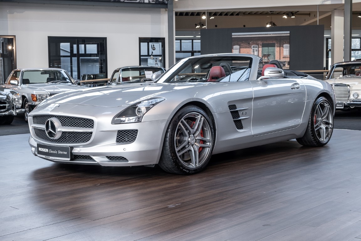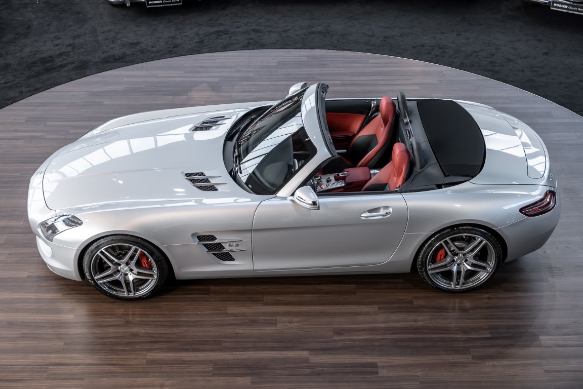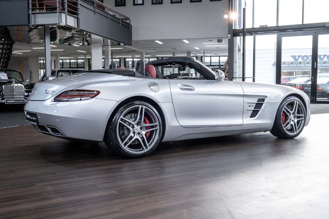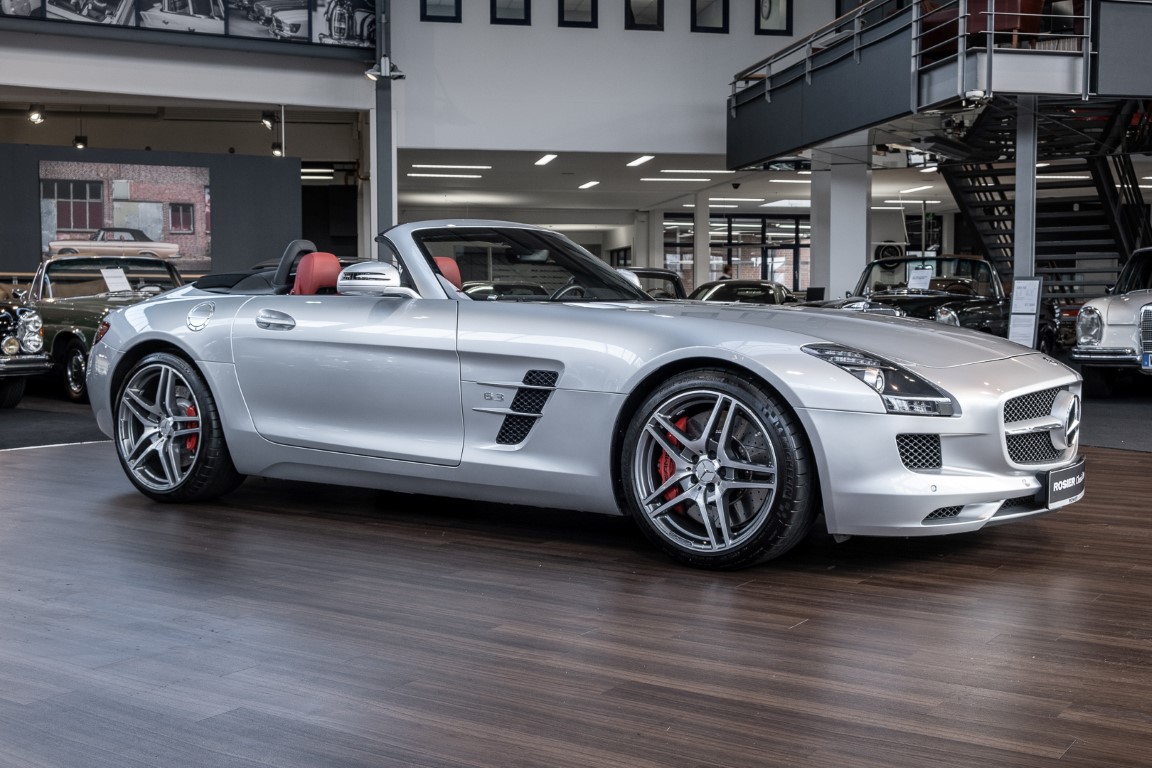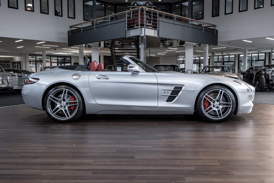 Dieser wundervolle SLS AMG Roadster in der klassisch-sportlichen Kombination „Iridiumsilber Metallic“ mit rotem AMG Exklusiv Leder ist im wahrsten Sinne des Wortes ein Silberpfeil.