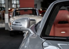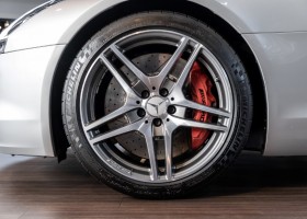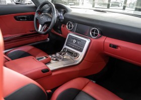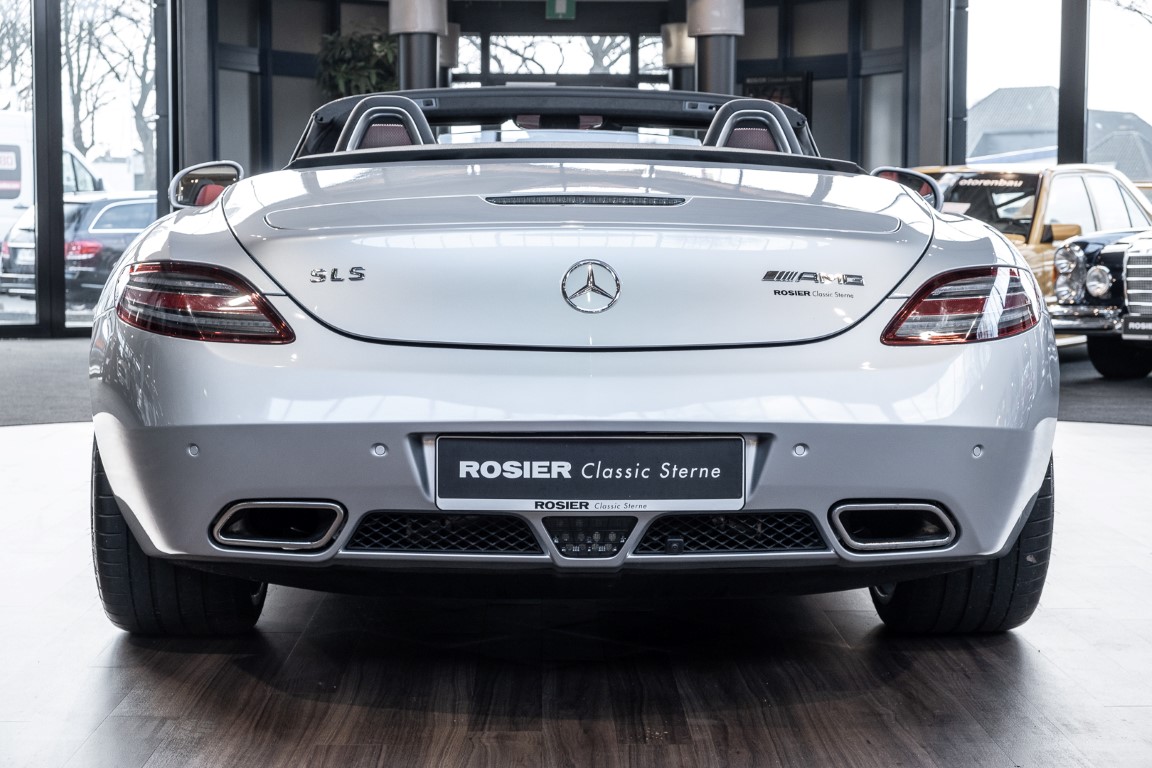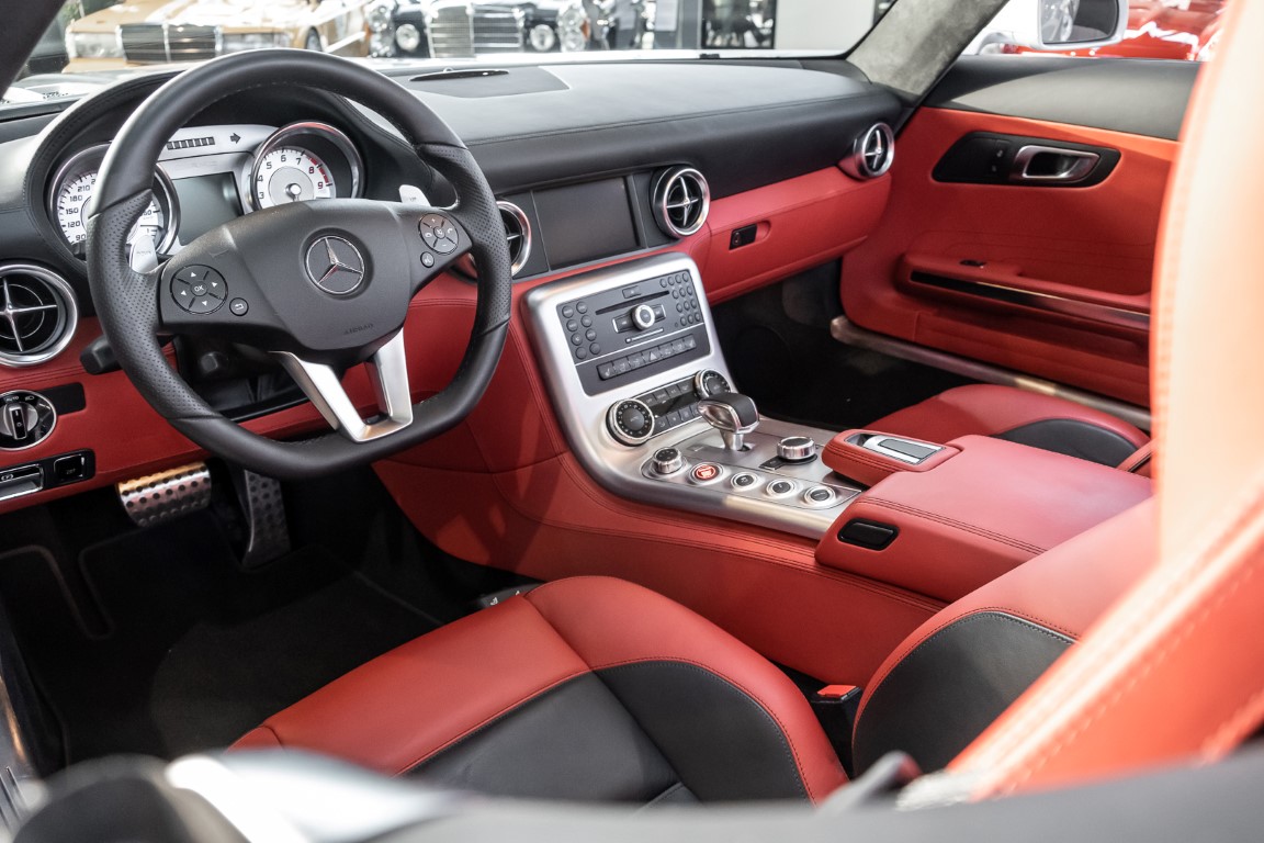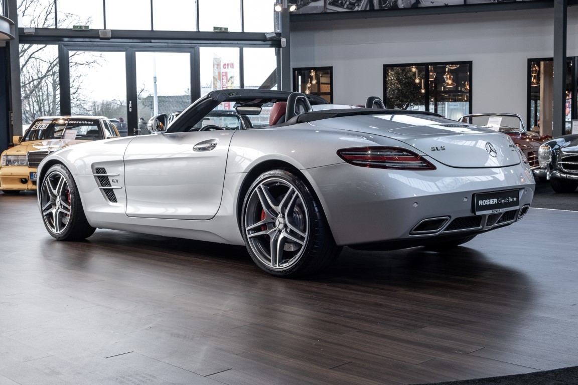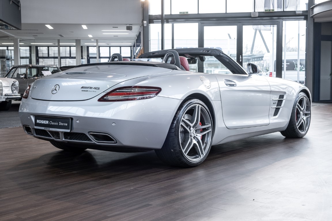 Dieser wundervolle SLS AMG Roadster in der klassisch-sportlichen Kombination „Iridiumsilber Metallic“ mit rotem AMG Exklusiv Leder ist im wahrsten Sinne des Wortes ein Silberpfeil.