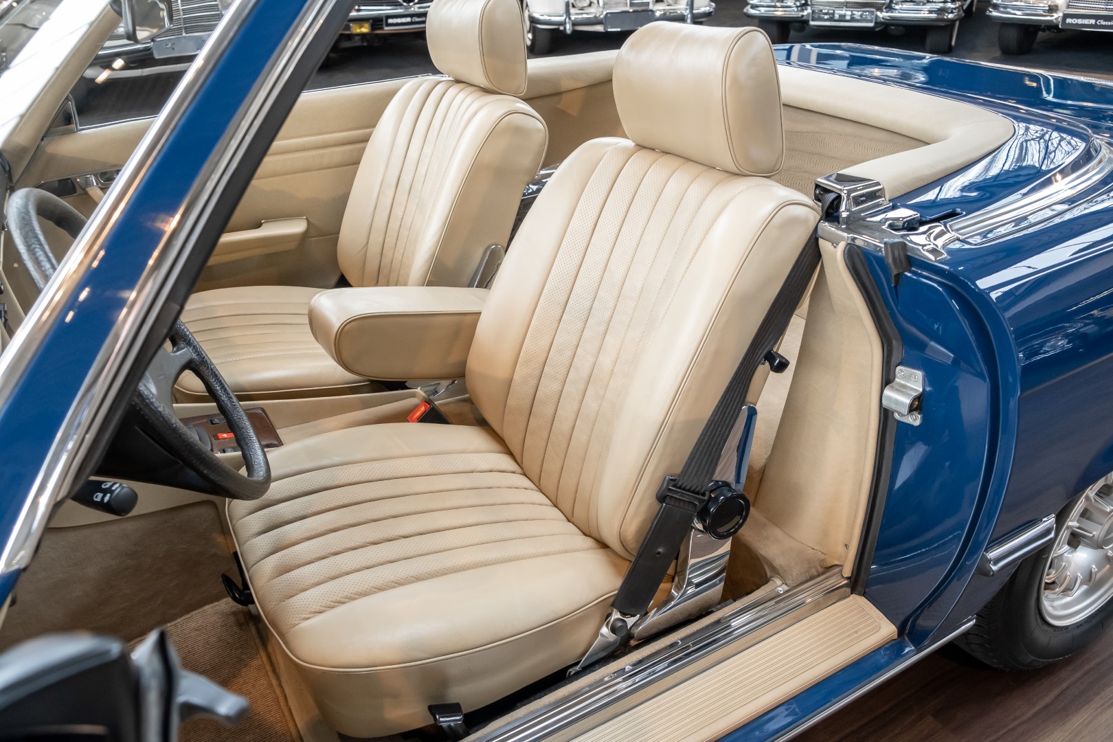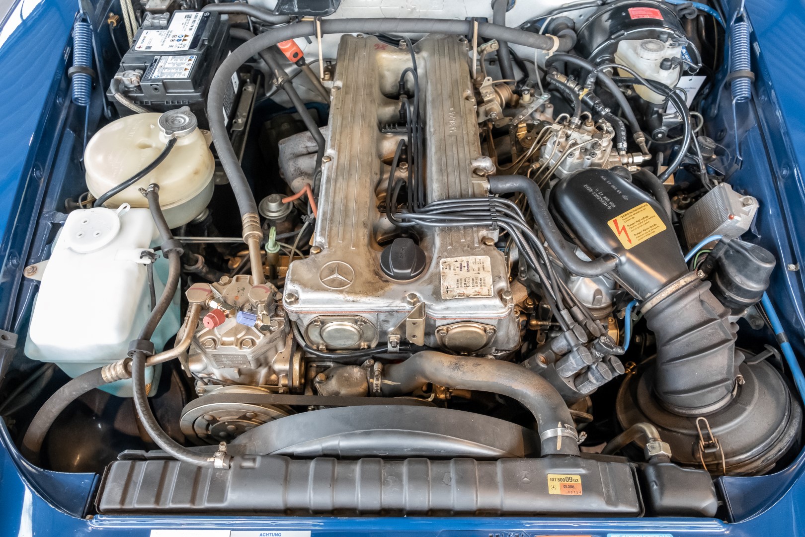 A proud 62,708.21 DM was paid by the then purchaser - a successful dealer for agricultural machinery and parts from Bonn - for the roadster dream in surf blue (900. The list of optional extras was comparatively long: leather upholstery in cream (255), automatic transmission, center armrest, air conditioning, electric windows and alloy wheels gave the roadster that certain something and the owner's very own touch. The cassette radio Becker Grand Prix was also on board. Of course, all documents are also available here: from the operating instructions and the demonstration cassette to the warranty checkbook and the original sound head cleaning sticks!
