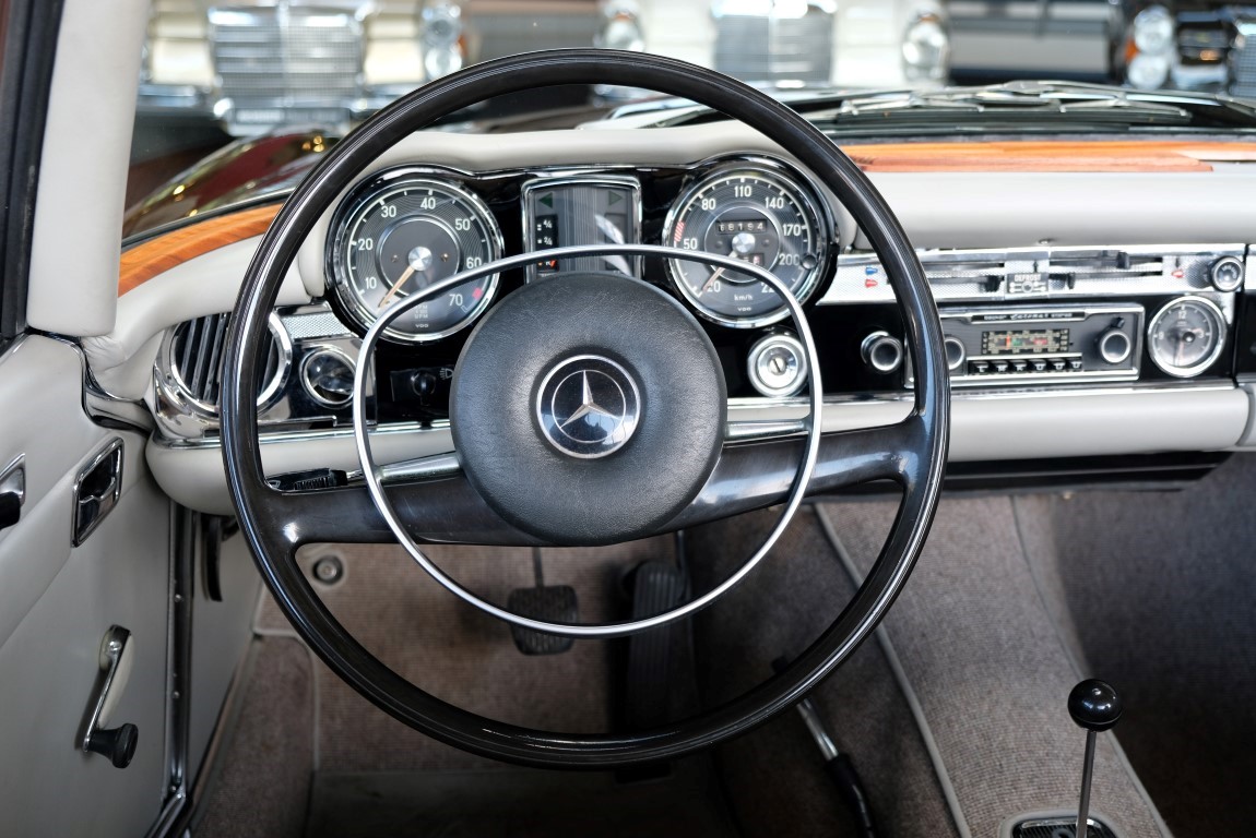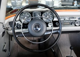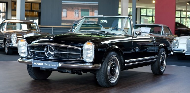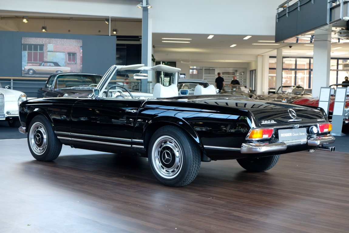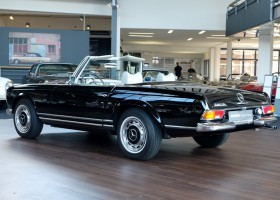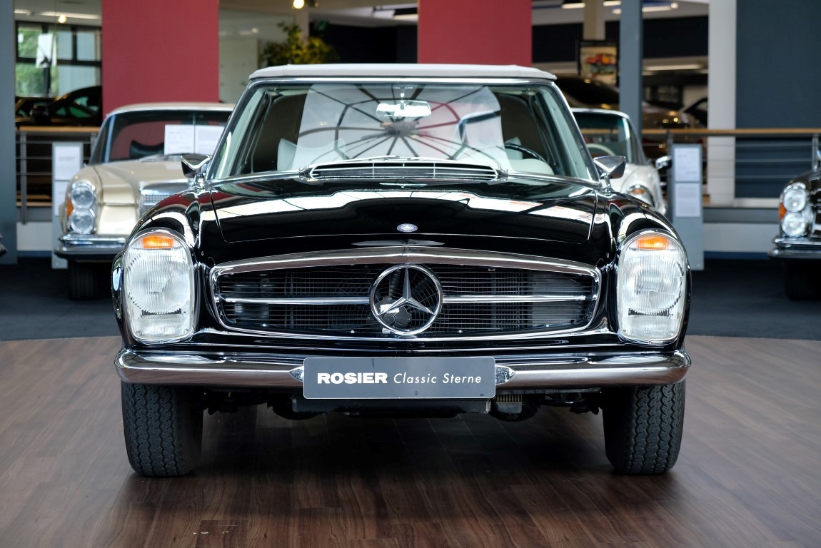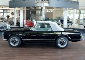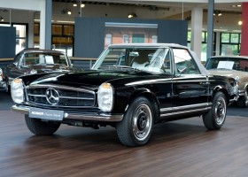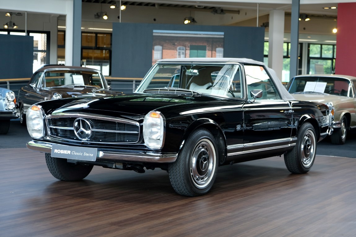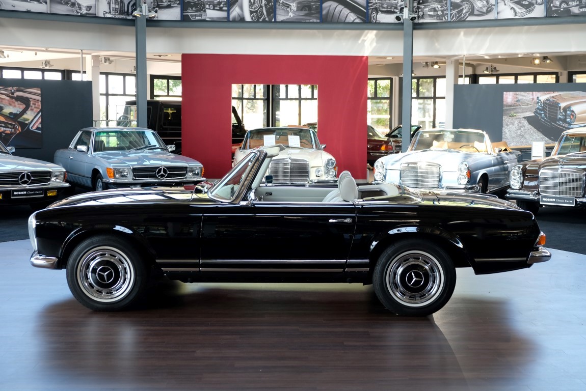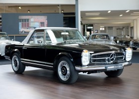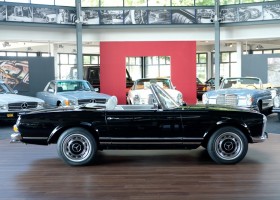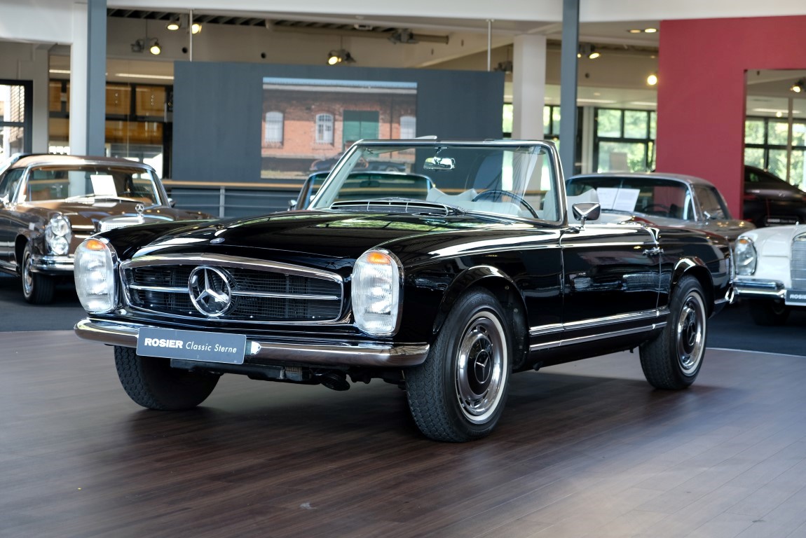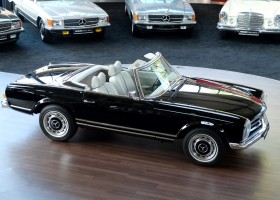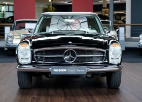They were just around 70 years old and wanted to fulfill a long-cherished dream.They had a lot of fun at the pagoda. You kept the pagoda for about 12 years and did not give it until you decided to move to a retirement home. So the car came to Germany, to Rosier Classic sterne in Oldenburg. Here the car was subjected to extensive restoration, in the scope of which the car was completely disassembled and rebuilt. The technique has been revised and a new paint applied. When the car was completed in 2013, he found a new home in the high-quality collection of a long-standing customer of the house. Now that the collection was supplemented by another high-quality classic, had to give way to space of one of the existing vehicles. We had the choice and opted for the black 280 SL pagoda. A dream car that will surely find a new home quickly.