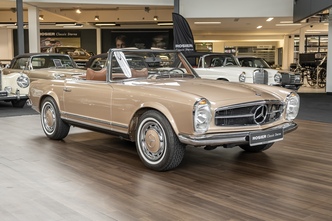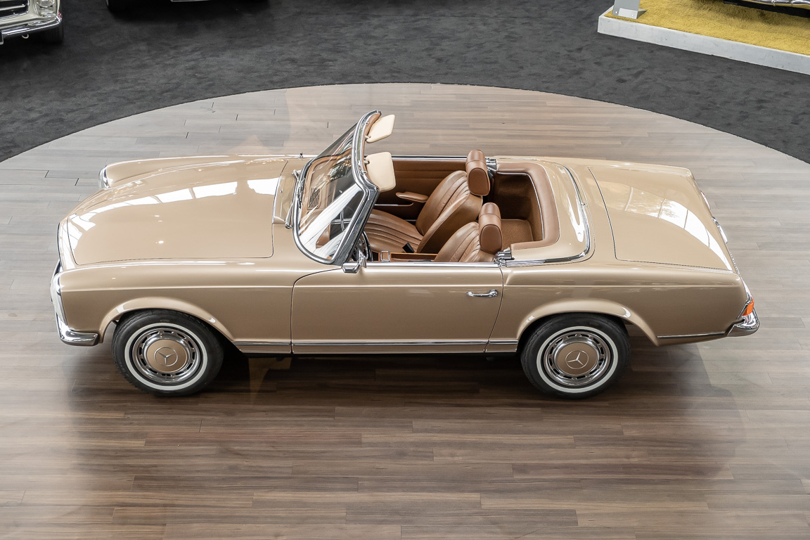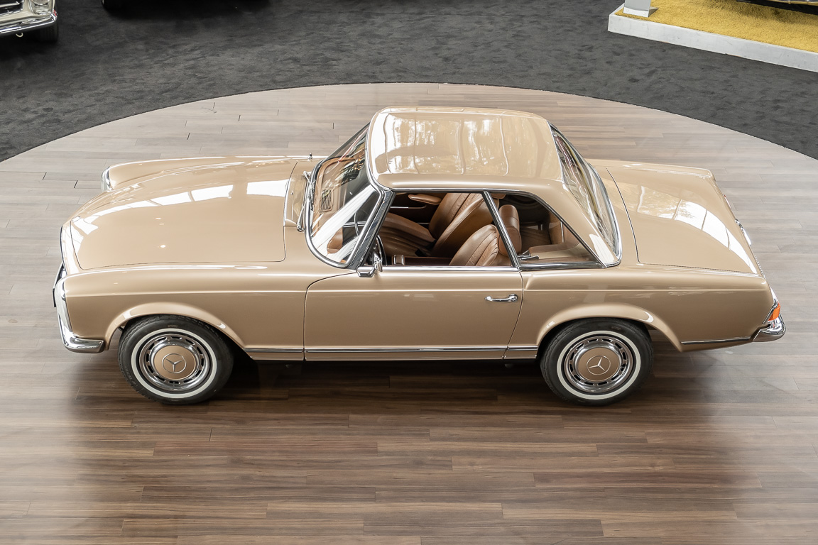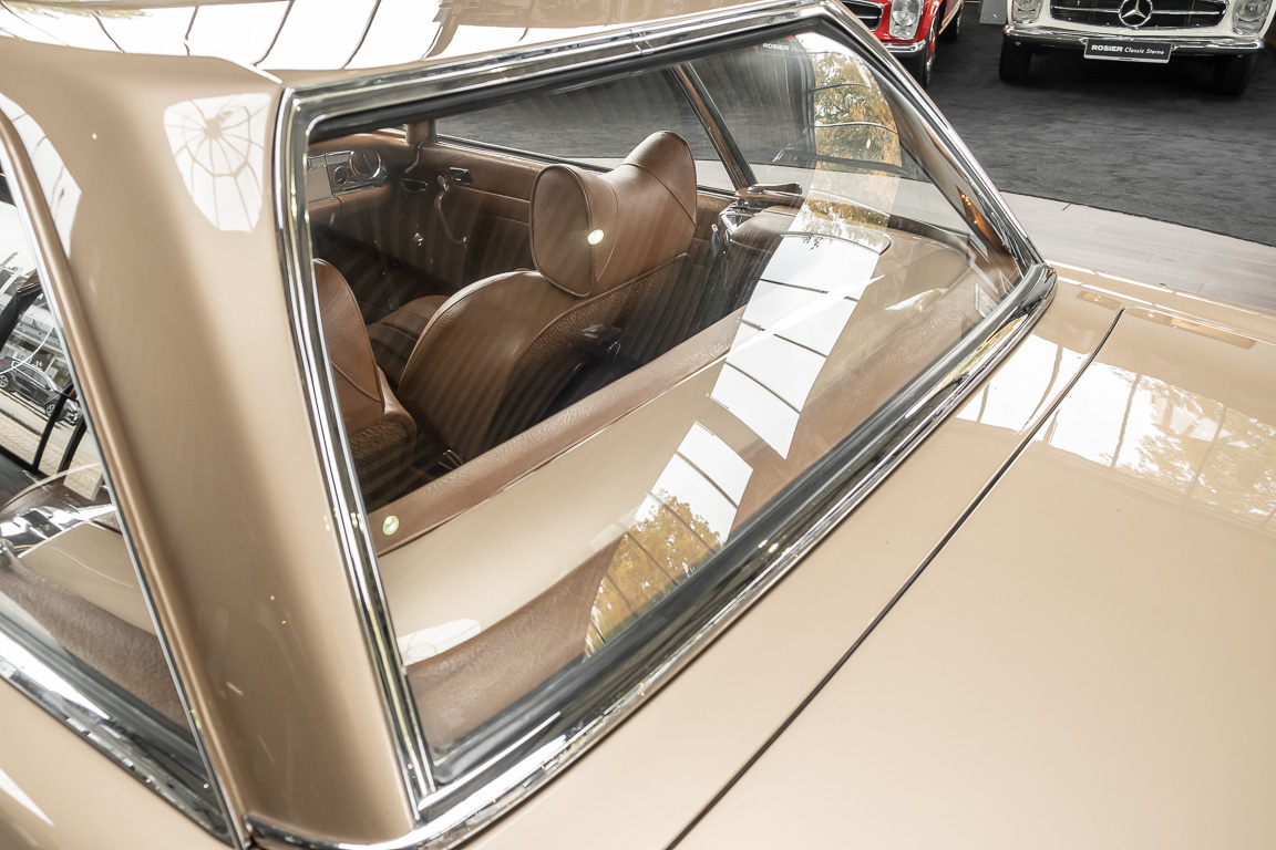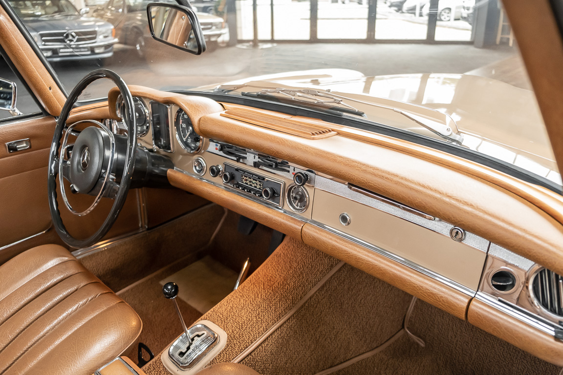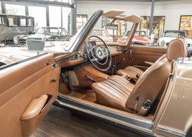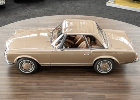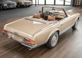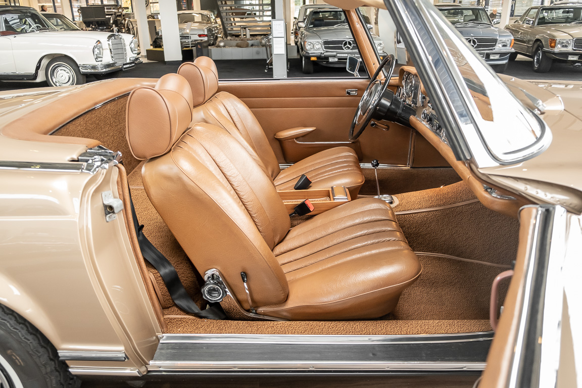 The offered Mercedes-Benz 280SL Pagoda was completed in 1969 in the Mercedes factory and delivered to the USA. The elegant color scheme in Sand Beige Metallic in combination with cognac-colored interior emphasized the elegant appearance to a very special extent even at that time. In March 1972, the car was sold by its first owner to London, Great Britain. It came into the possession of a diplomat's family who lived next to Primrose Hill not far from the wonderfully beautiful Regent's Park, in an elegant area of London. Presumably it was the lady of the house who used the car in London and in Geneva, Switzerland. After about 30 years of ownership, the family decided to sell the Pagoda. So in February 2001, a Swiss restaurateur from picturesque Fribourg in western Switzerland took over the Pagoda. During his ownership, a factory exchange engine was installed at an authorized Mercedes-Benz partner in July 2001. The original invoice for just under CHF 30,000 is available. In 2003 the car was acquired by a German manufacturer for his collection. He had the Pagoda professionally overhauled where necessary and restored it to its current dream condition. After almost 20 years in collector's possession and care, the chic roadster is to get a new home. Take your chance on a solid vehicle, with a great traceable history. We are happy to advise you.