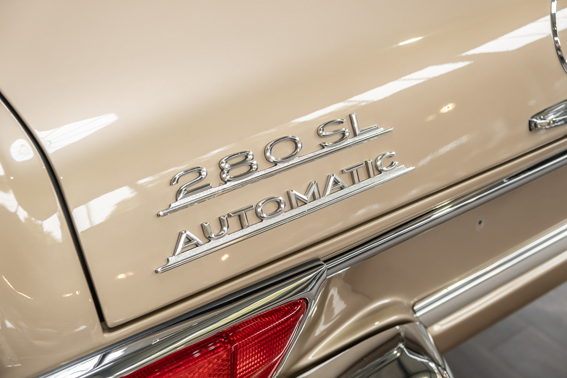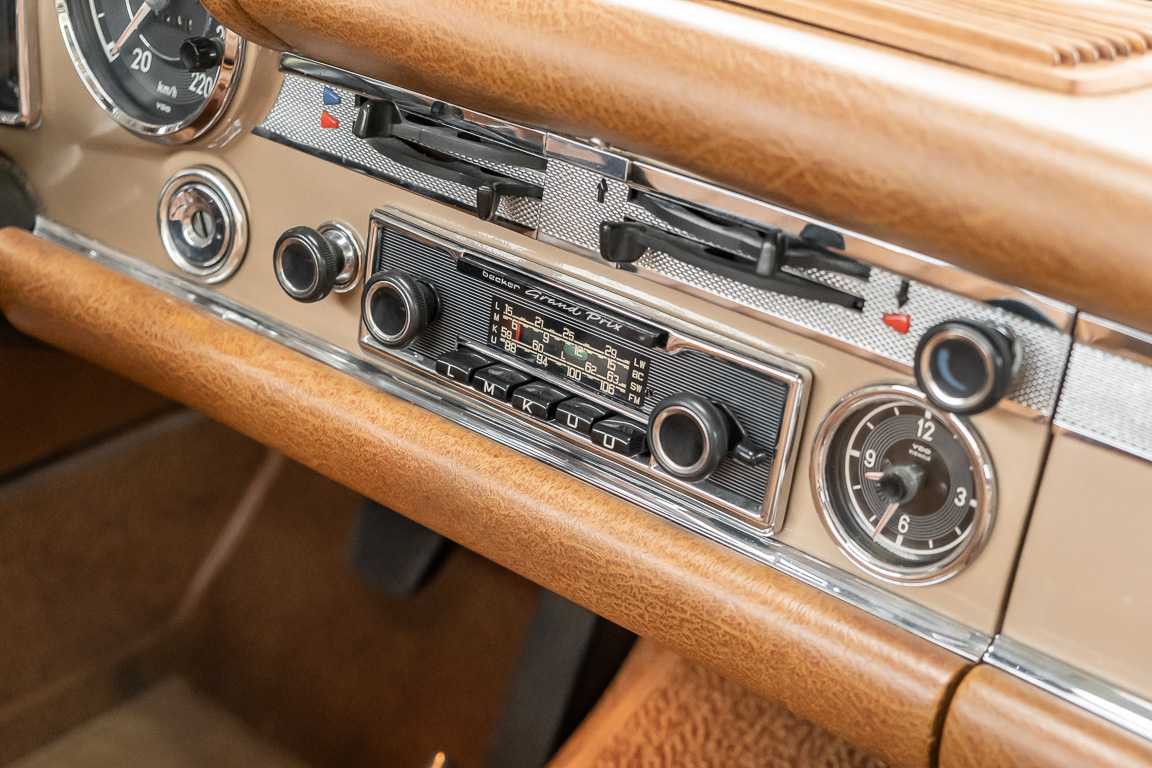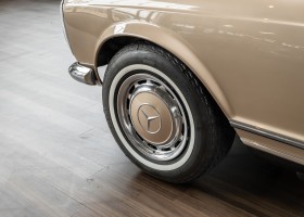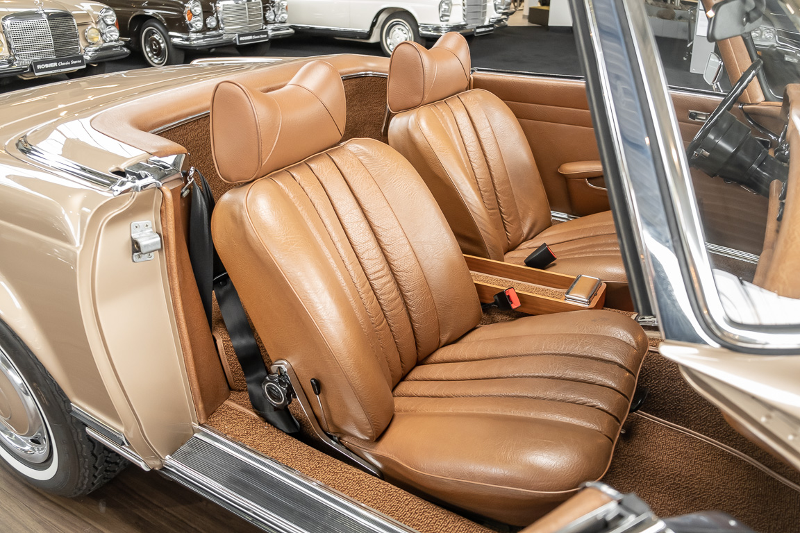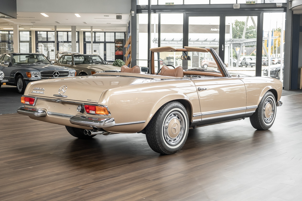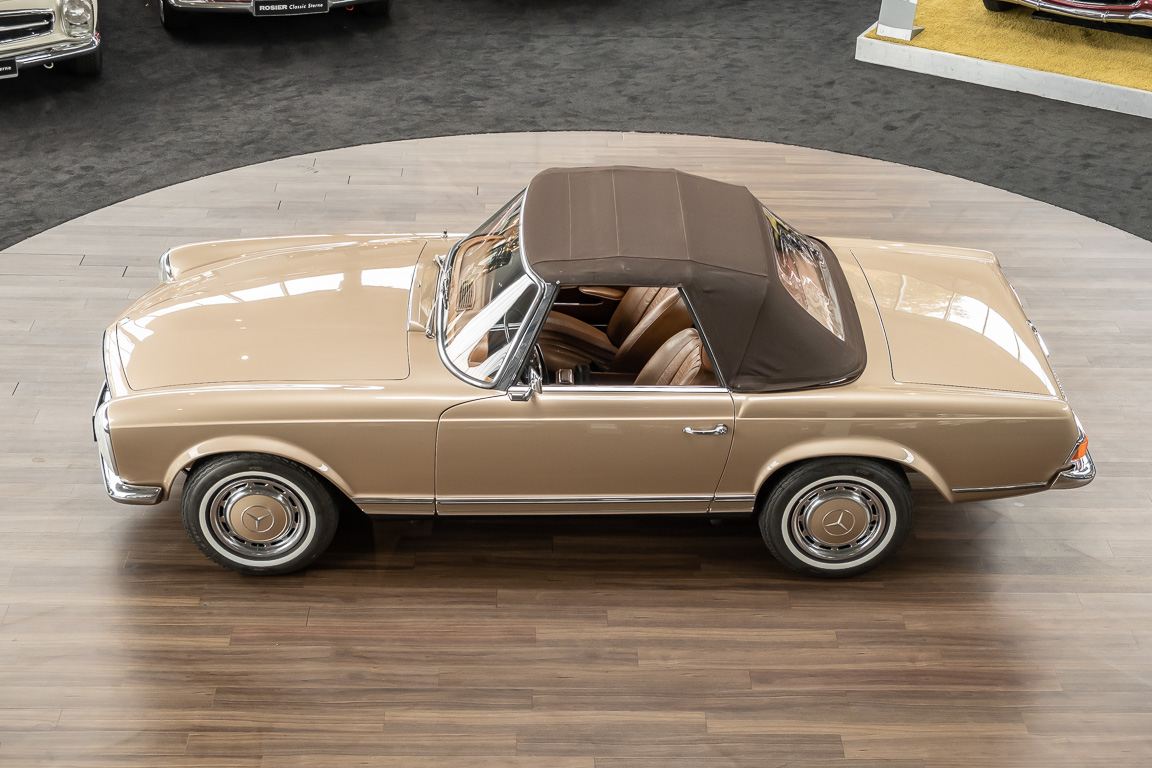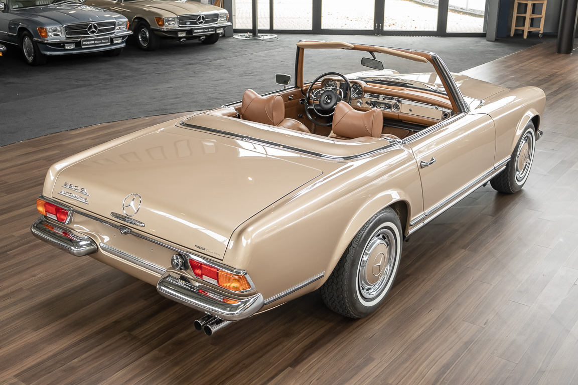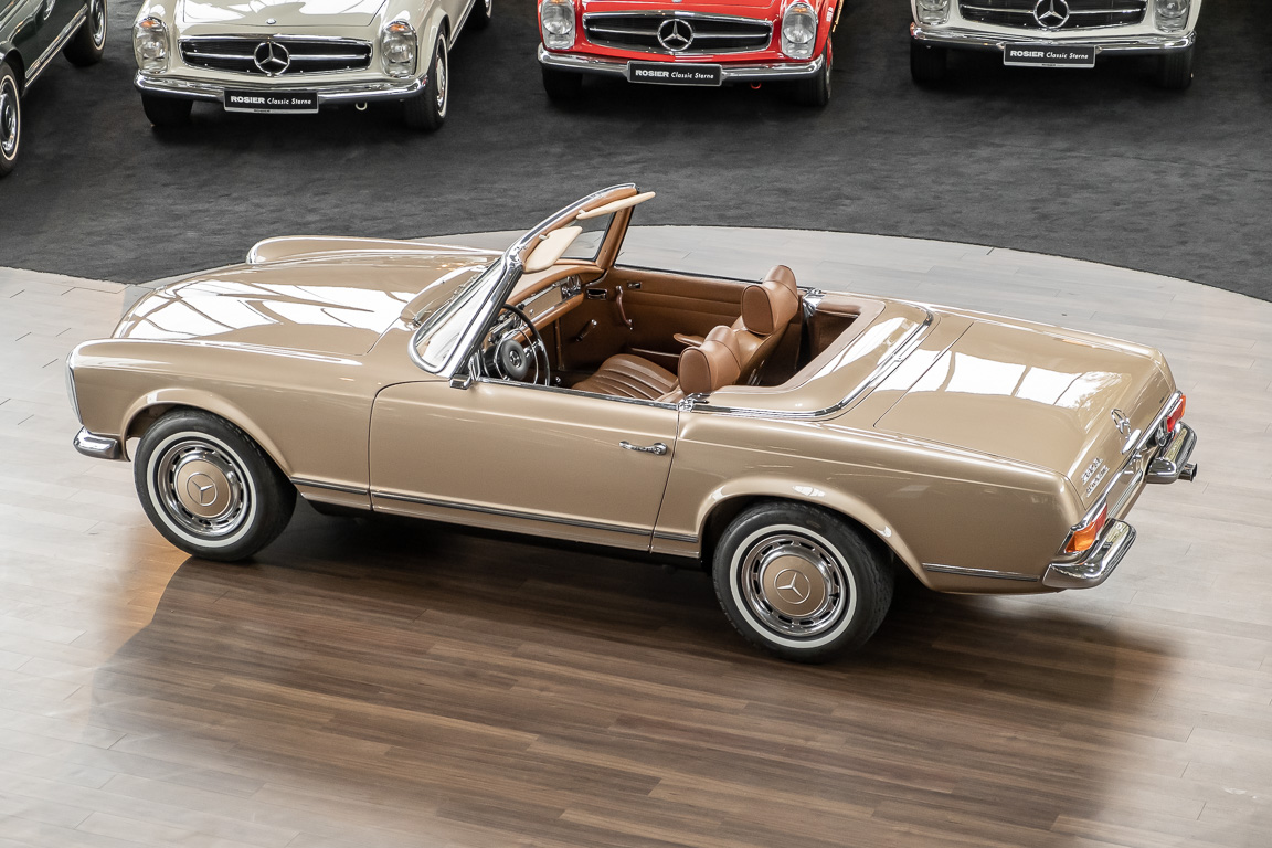 The offered Mercedes-Benz 280SL Pagoda was completed in 1969 in the Mercedes factory and delivered to the USA. The elegant color scheme in Sand Beige Metallic in combination with cognac-colored interior emphasized the elegant appearance to a very special extent even at that time. In March 1972, the car was sold by its first owner to London, Great Britain. It came into the possession of a diplomat's family who lived next to Primrose Hill not far from the wonderfully beautiful Regent's Park, in an elegant area of London. Presumably it was the lady of the house who used the car in London and in Geneva, Switzerland. After about 30 years of ownership, the family decided to sell the Pagoda. So in February 2001, a Swiss restaurateur from picturesque Fribourg in western Switzerland took over the Pagoda. During his ownership, a factory exchange engine was installed at an authorized Mercedes-Benz partner in July 2001. The original invoice for just under CHF 30,000 is available. In 2003 the car was acquired by a German manufacturer for his collection. He had the Pagoda professionally overhauled where necessary and restored it to its current dream condition. After almost 20 years in collector's possession and care, the chic roadster is to get a new home. Take your chance on a solid vehicle, with a great traceable history. We are happy to advise you.