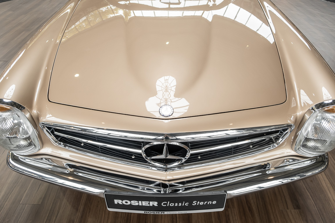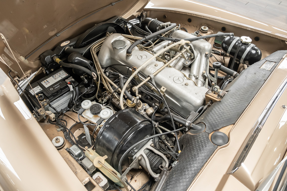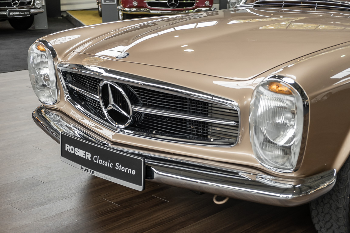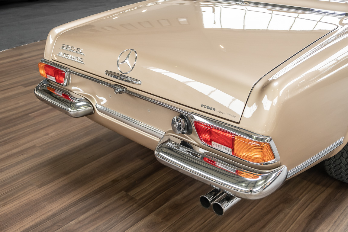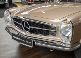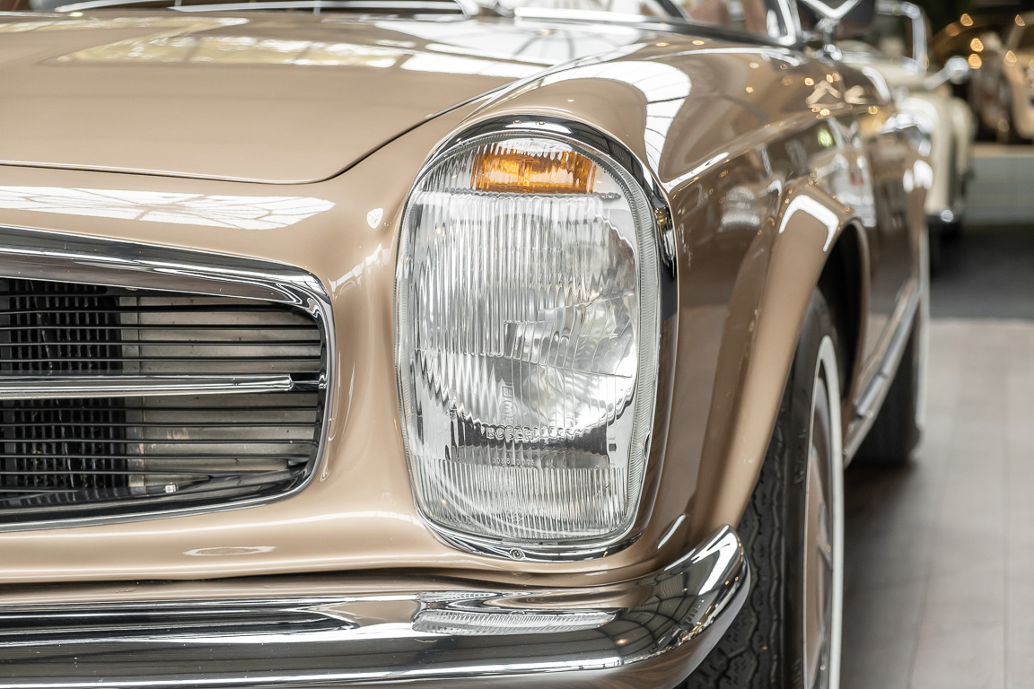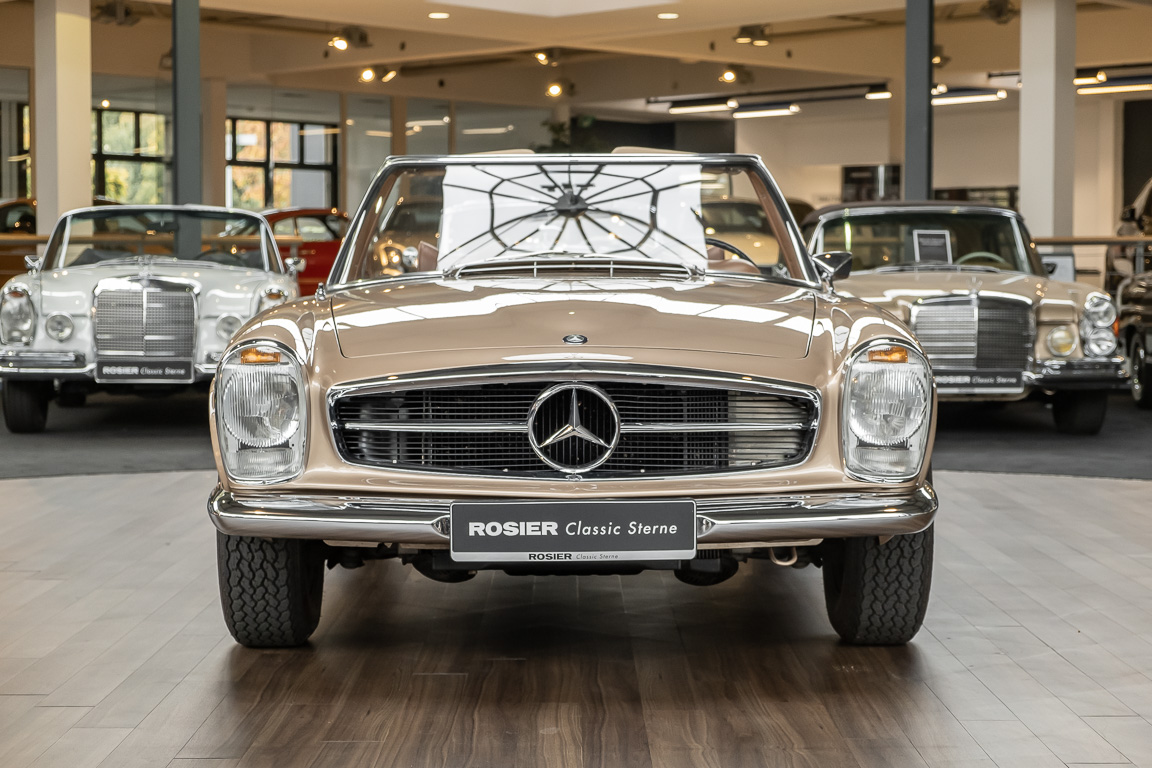 The offered Mercedes-Benz 280SL Pagoda was completed in 1969 in the Mercedes factory and delivered to the USA. The elegant color scheme in Sand Beige Metallic in combination with cognac-colored interior emphasized the elegant appearance to a very special extent even at that time. In March 1972, the car was sold by its first owner to London, Great Britain. It came into the possession of a diplomat's family who lived next to Primrose Hill not far from the wonderfully beautiful Regent's Park, in an elegant area of London. Presumably it was the lady of the house who used the car in London and in Geneva, Switzerland. After about 30 years of ownership, the family decided to sell the Pagoda. So in February 2001, a Swiss restaurateur from picturesque Fribourg in western Switzerland took over the Pagoda. During his ownership, a factory exchange engine was installed at an authorized Mercedes-Benz partner in July 2001. The original invoice for just under CHF 30,000 is available. In 2003 the car was acquired by a German manufacturer for his collection. He had the Pagoda professionally overhauled where necessary and restored it to its current dream condition. After almost 20 years in collector's possession and care, the chic roadster is to get a new home. Take your chance on a solid vehicle, with a great traceable history. We are happy to advise you.