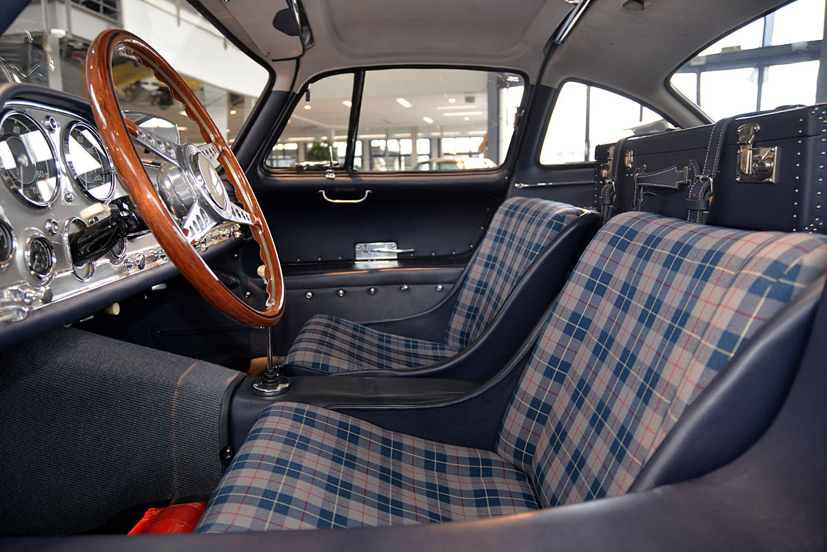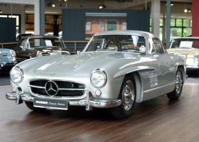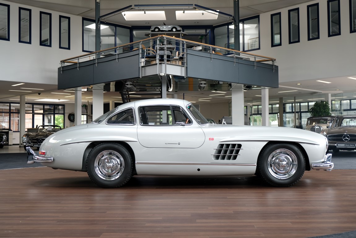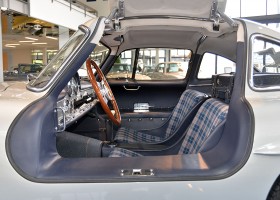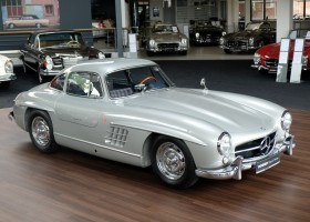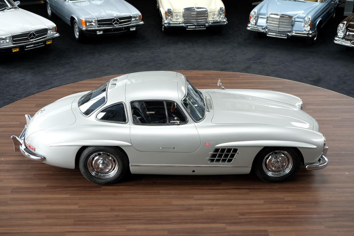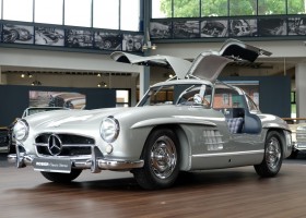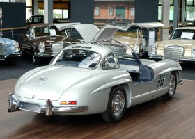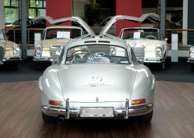 He had the car from 1998 to 2000 undergo a major restoration, in the context of which the engine was completely disassembled and rebuilt. The paint was renewed as well as the whole interior. The silver-gray metallic paintwork is reminiscent of the once-unbeatable Silver Arrows, the blue interior in Checkered fabric, underlines the sporty appearance of the coupe. The equipment is completed by the so-called Rudge central hub hubs and a suitcase made of blue leather precisely tailored, on the shelf behind the seats. A Classic Data Report from 2014 documents the condition of the car with a smooth 1 as condition assessment. All in all a dream 300 SL gullwing with top marks. The ticket to high-profile events. With a stunning body shape, which attracts even after more than 60 years still highly enthusiastic glances.