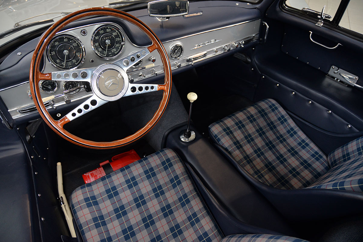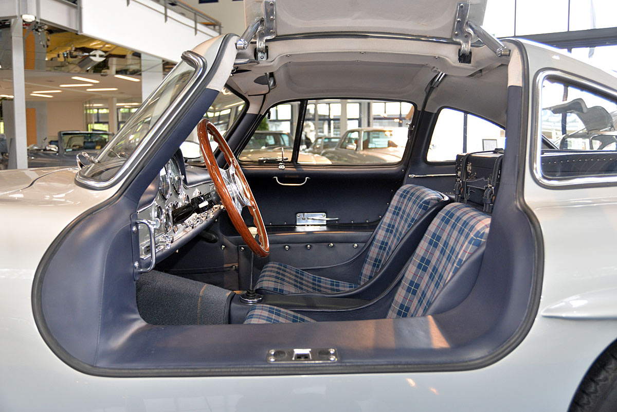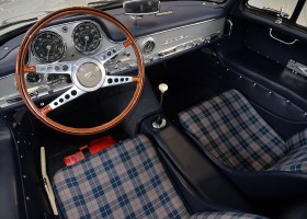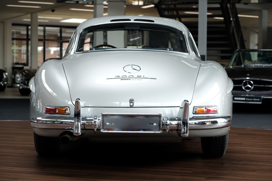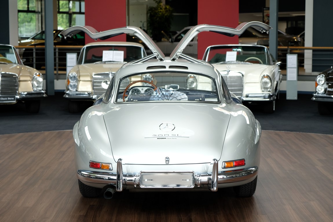 He had the car from 1998 to 2000 undergo a major restoration, in the context of which the engine was completely disassembled and rebuilt. The paint was renewed as well as the whole interior. The silver-gray metallic paintwork is reminiscent of the once-unbeatable Silver Arrows, the blue interior in Checkered fabric, underlines the sporty appearance of the coupe. The equipment is completed by the so-called Rudge central hub hubs and a suitcase made of blue leather precisely tailored, on the shelf behind the seats. A Classic Data Report from 2014 documents the condition of the car with a smooth 1 as condition assessment. All in all a dream 300 SL gullwing with top marks. The ticket to high-profile events. With a stunning body shape, which attracts even after more than 60 years still highly enthusiastic glances.