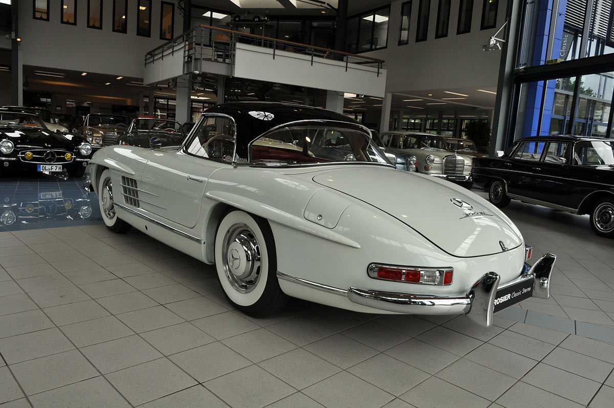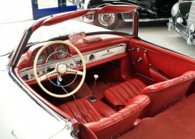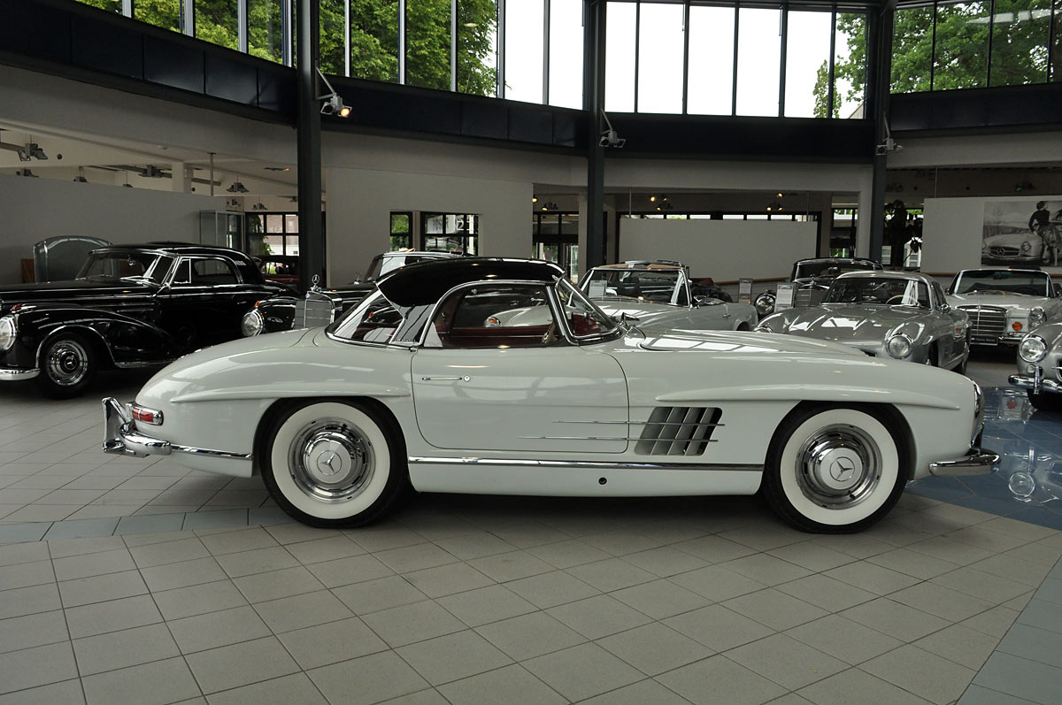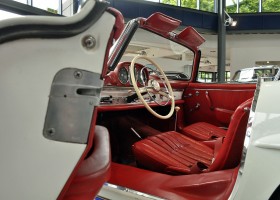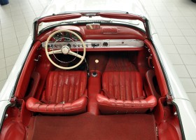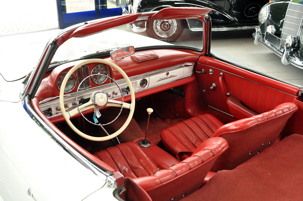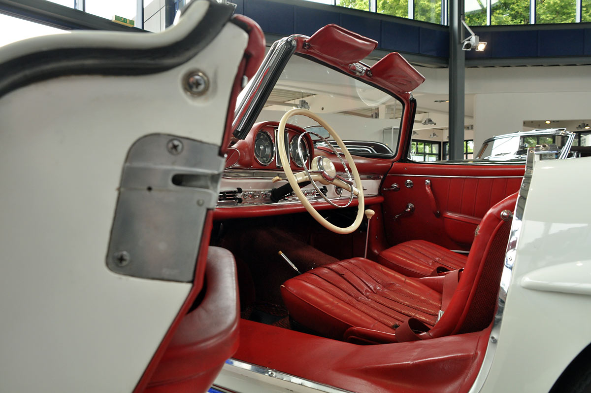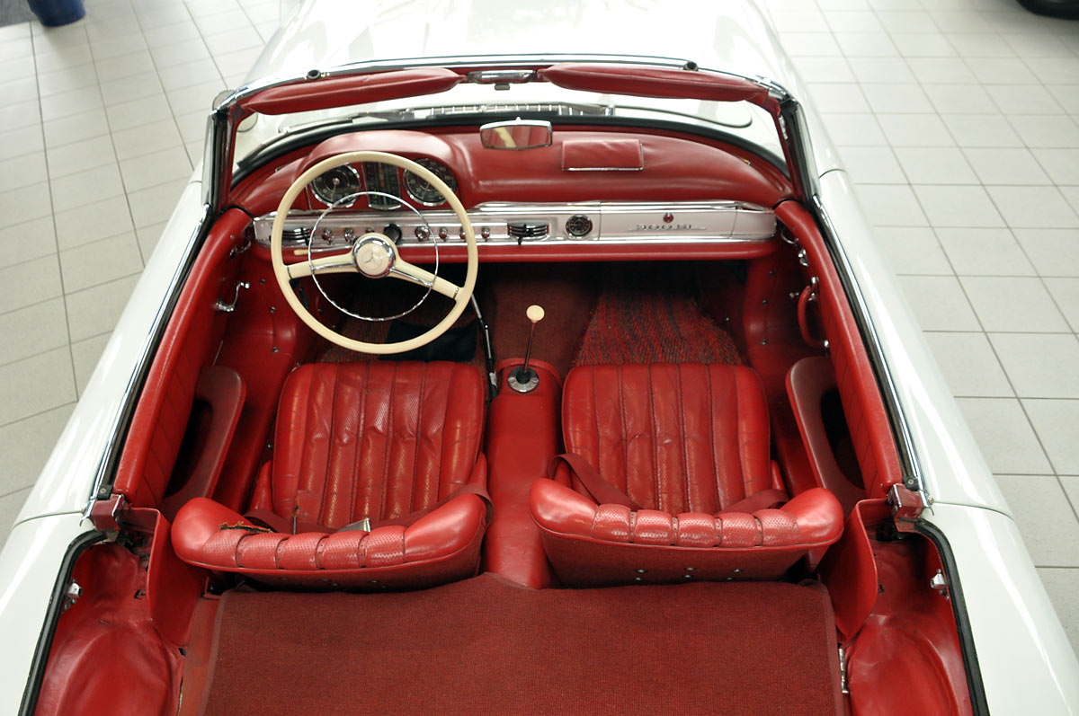 This elegant white and red Mercedes-Benz 300 SL roadster with aluminum motor and disc brakes, was completed in May 1962 in the factory.