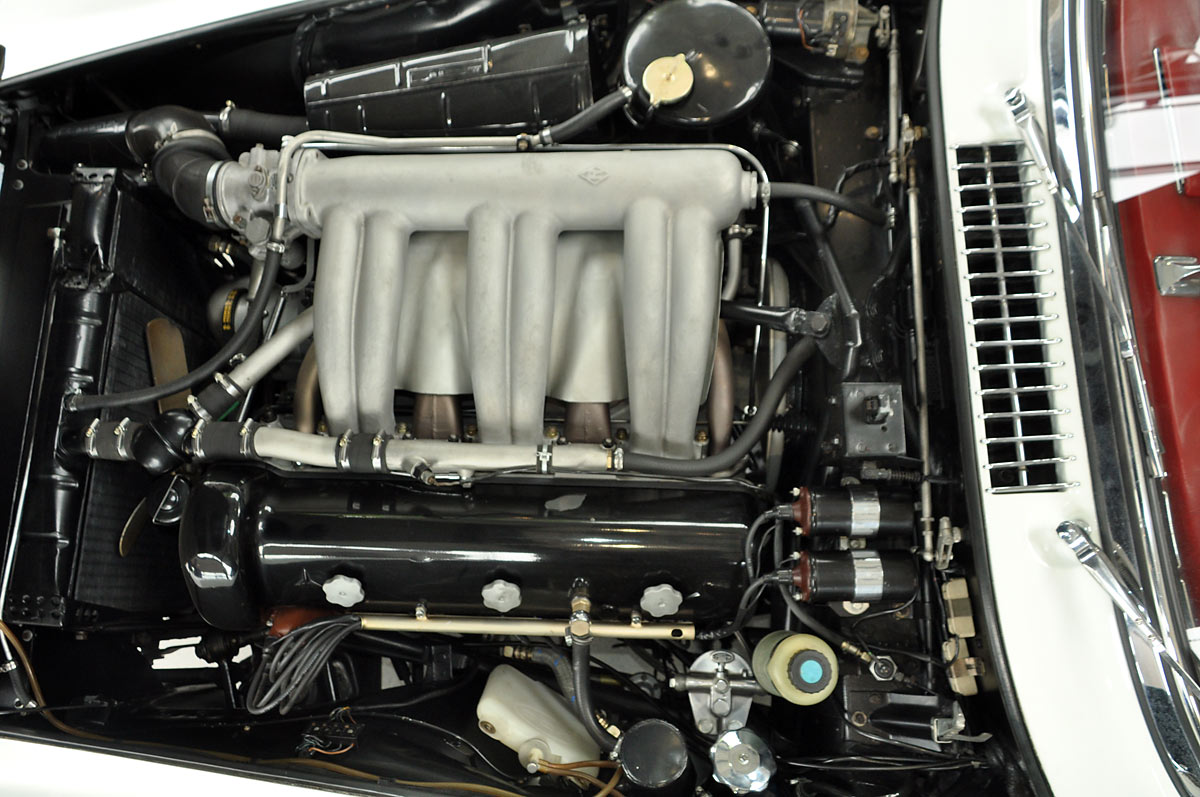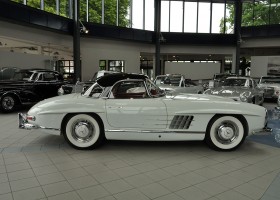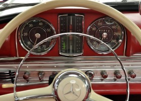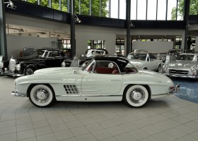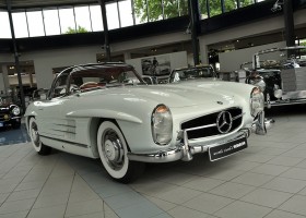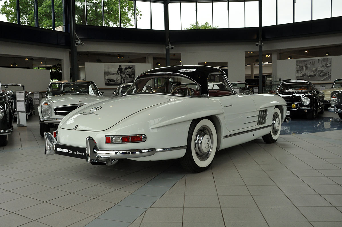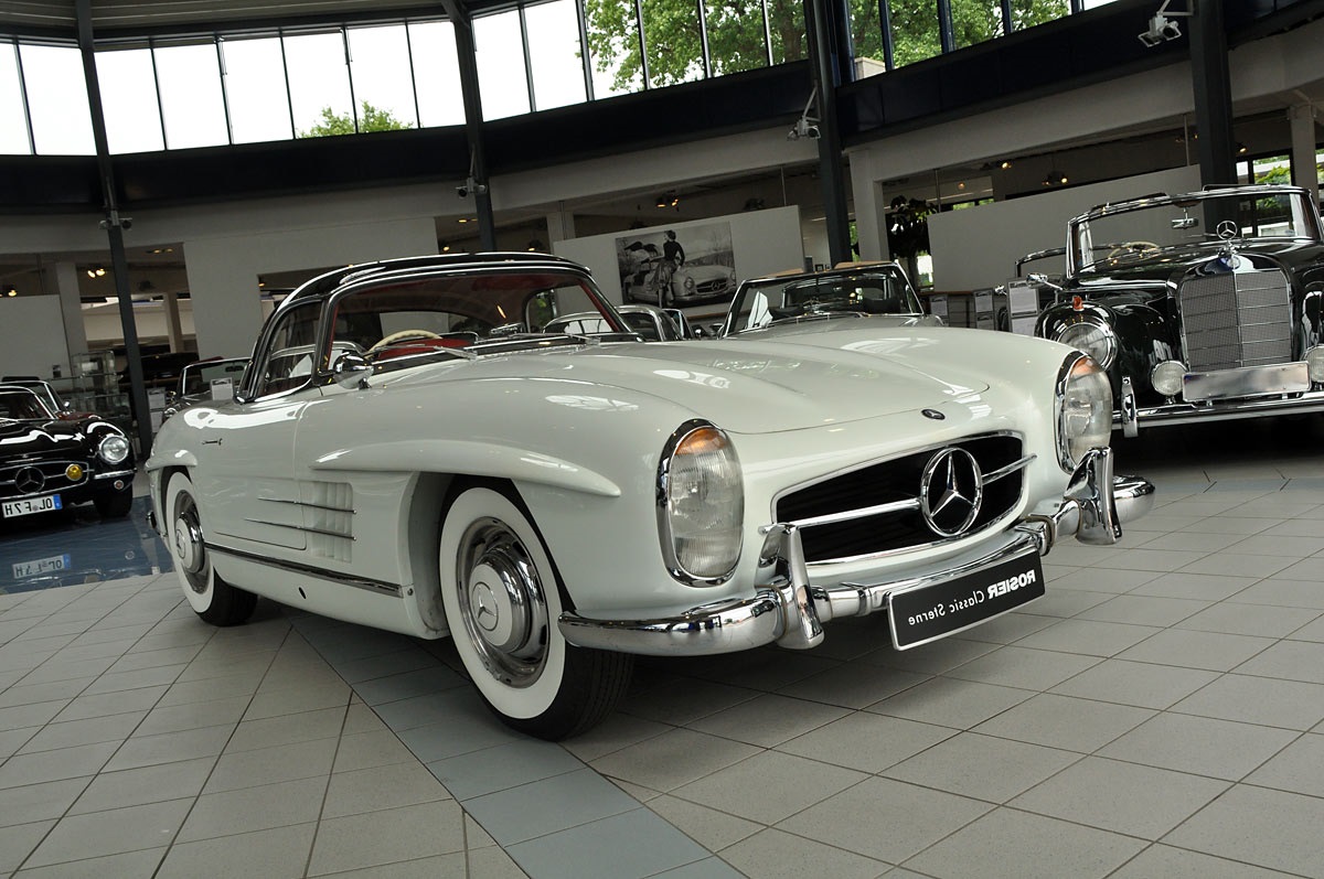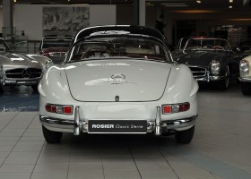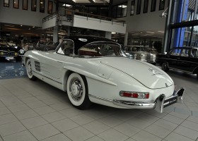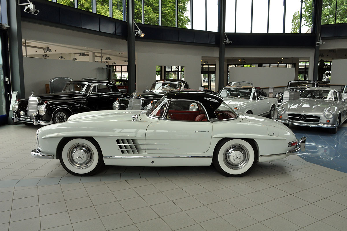 This elegant white and red Mercedes-Benz 300 SL roadster with aluminum motor and disc brakes, was completed in May 1962 in the factory.